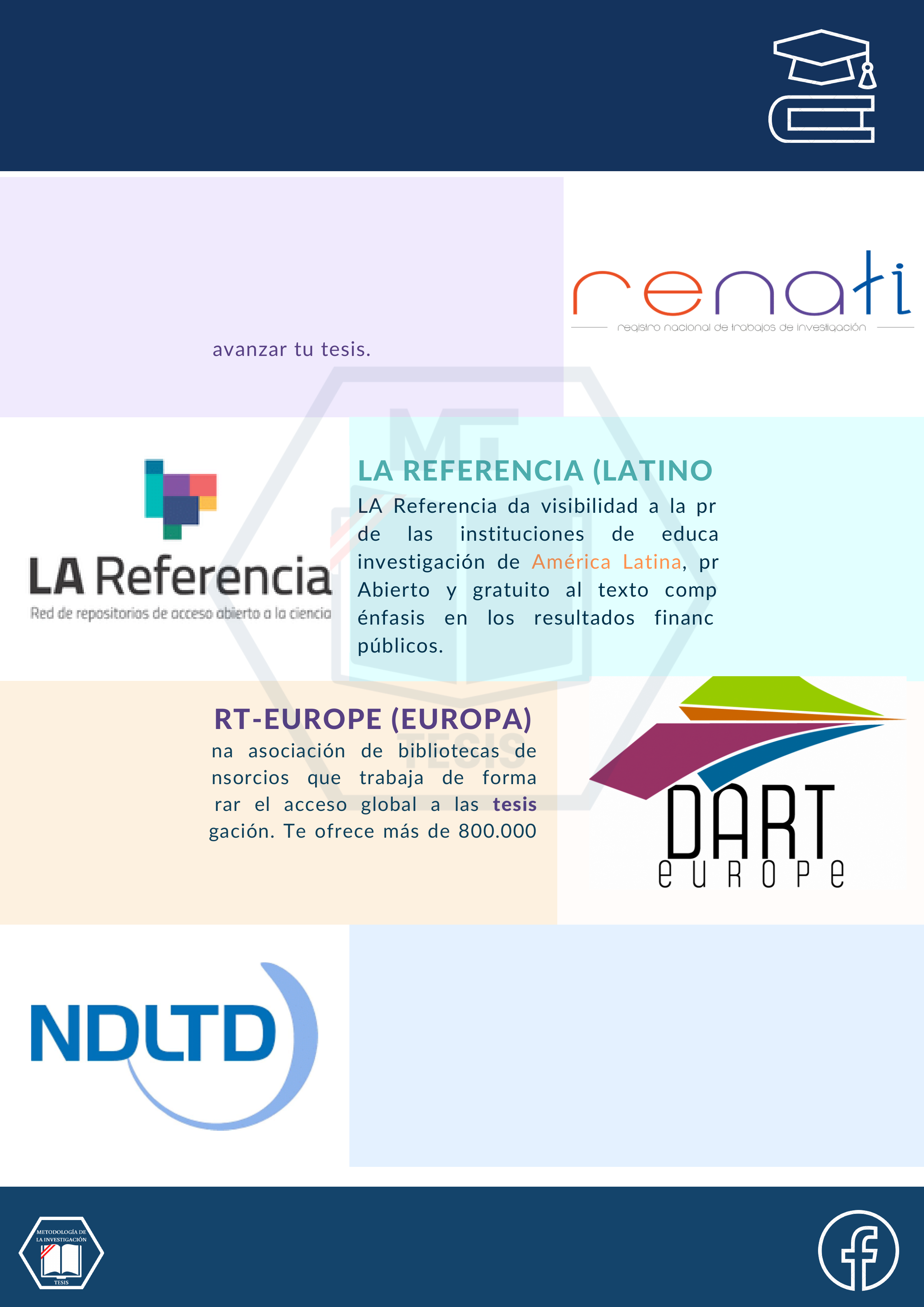 4 PÁGINAS DE TESIS QUE TODO ESTUDIANTE DEBERÍA CONOCER LA REFERENCIA (LATINOAMÉRICA) LA Referencia da visibilidad a la producción científica de las instituciones de educación superior e investigación de América Latina, promueve el Acceso Abierto y gratuito al texto completo, con especial énfasis en los resultados financiados con fondos públicos. DART-EUROPE (EUROPA) DART-Europe es una asociación de bibliotecas de investigación y consorcios que trabaja de forma conjunta para mejorar el acceso global a las tesis europeas de investigación. Te ofrece más de 800.000 tesis de investigación de acceso abierto de 617 universidades en 28 países europeos. RENATI (PERÚ) En Renati encontrarás trabajos de investigación de más de 100 repositorios universitarios peruanos que te ayudarán a avanzar tu tesis. NDL TD (MUNDIAL) NDLTD es una organización internacional dedicada a promover la adopción, creación, uso, difusión y preservación de tesis y disertaciones electrónicas (ETD). METODOLOGÍA DE LA INVESTIGACIÓN - TESIS https://transfer.pcloud.com/ https://www.dropbox.com/es/