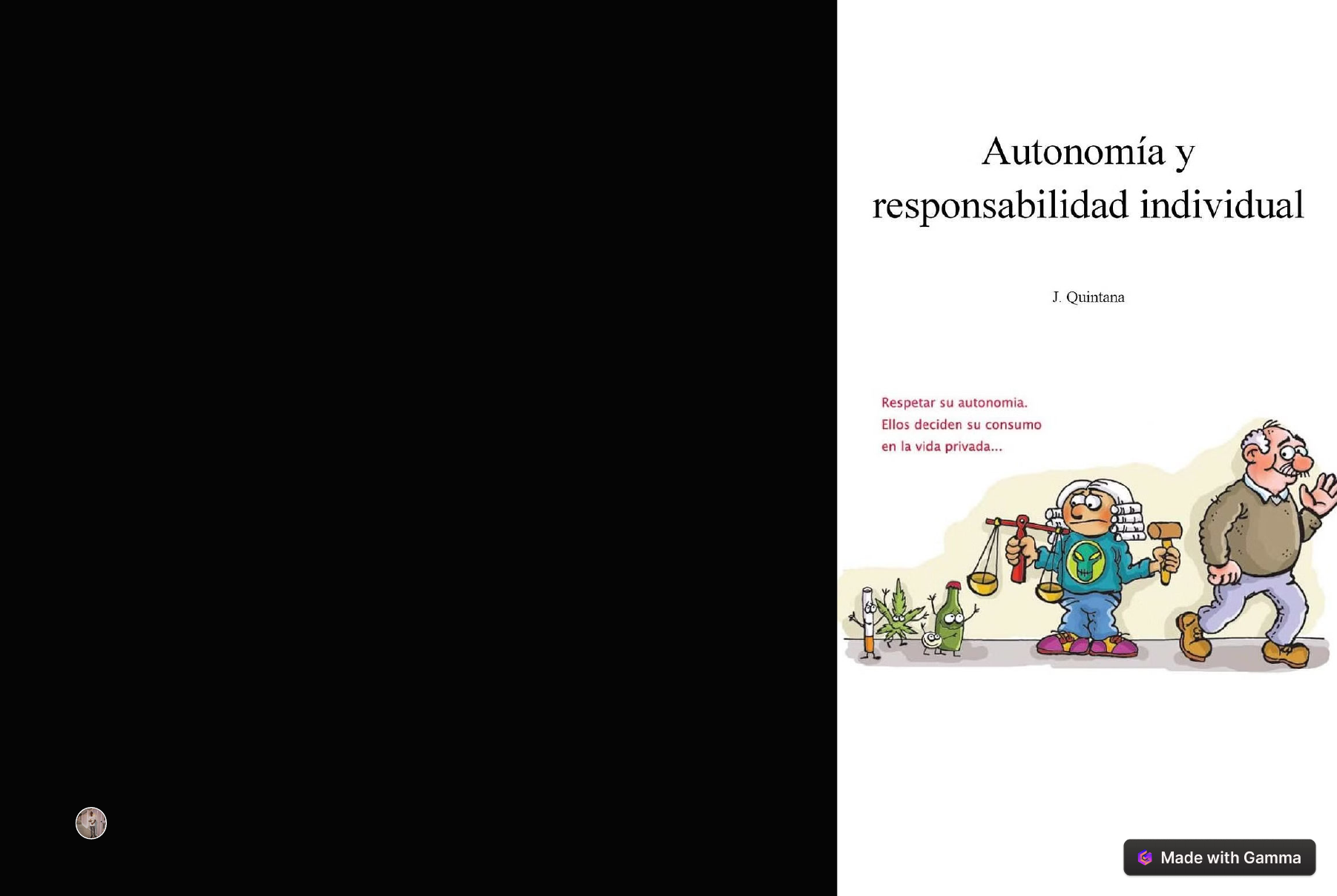 Introducción a la Autonomía y la Responsabilidad La autonomía y la responsabilidad son conceptos fundamentales que definen nuestra capacidad de tomar decisiones y asumir las consecuencias de nuestras acciones. Ser autónomo implica tener la libertad y el control sobre nuestras elecciones, mientras que la responsabilidad nos obliga a responder por el impacto que esas decisiones tienen en nosotros mismos y en los demás. En este capítulo, exploraremos la delicada relación entre estos dos principios y cómo encontrar el equilibrio adecuado. Analizaremos los beneficios de ser autónomos, pero también los desafíos que conlleva asumir la responsabilidad de nuestros actos. Mediante ejemplos concretos y reflexiones profundas, buscaremos comprender cómo la autonomía y la responsabilidad moldean nuestra conducta y nos permiten convertirnos en agentes activos de nuestro propio desarrollo personal y ético. by Marinela Grueso https://gamma.app La autonomía como concepto filosófico La autonomía ha sido un concepto fundamental en la filosofía a lo largo de la historia. Desde la Antigua Grecia, filósofos como Aristóteles y Platón exploraron la idea de la autonomía individual y su relación con la ética y la política. En la filosofía moderna, Immanuel Kant desarrolló una poderosa teoría de la autonomía moral, en la que el ser humano posee la capacidad de darse a sí mismo sus propias leyes morales, siendo la autonomía la base de la dignidad humana. En el pensamiento contemporáneo, la autonomía se ha analizado desde diversas perspectivas. Los filósofos existencialistas, como Jean-Paul Sartre, enfatizaron la libertad y la responsabilidad individual como aspectos centrales de la autonomía. Por su parte, los filósofos comunitaristas, como Michael Sandel, han cuestionado la noción de un "yo" autosuficiente y han resaltado la importancia de los vínculos sociales y comunitarios en la configuración de la autonomía. Asimismo, los filósofos feministas han criticado la concepción tradicional de la autonomía, argumentando que está enraizada en una visión individualista y masculina, y han propuesto modelos alternativos que tienen en cuenta las relaciones de dependencia y la contextualidad de la experiencia humana. Estos enfoques enriquecen nuestra comprensión de la autonomía, destacando su carácter multidimensional y su estrecha relación con la igualdad, la justicia y el reconocimiento social. https://gamma.app La responsabilidad individual y social La responsabilidad individual y social son conceptos fundamentales que se encuentran íntimamente relacionados. Por un lado, la responsabilidad individual se refiere a la obligación que cada persona tiene de asumir las consecuencias de sus propias acciones y decisiones. Esto implica ser consciente de nuestros actos, tomar decisiones de manera reflexiva y estar dispuestos a rendir cuentas por ellos. Por otro lado, la responsabilidad social va más allá del ámbito individual y se extiende a nuestras obligaciones y compromisos con la sociedad en su conjunto. Cada uno de nosotros somos parte de una red compleja de relaciones y sistemas sociales, por lo que nuestras decisiones y acciones tienen un impacto más allá de nosotros mismos. Ser responsables socialmente significa reconocer este hecho y actuar de manera que contribuyamos al bienestar y el progreso de la comunidad de la que formamos parte. Esto puede implicar desde acciones sencillas como reciclar o reducir nuestro consumo, hasta la participación activa en causas y organizaciones que buscan abordar problemas sociales y ambientales. La responsabilidad individual y social se refuerzan mutuamente. Una persona que asume con seriedad su responsabilidad individual, estará mejor preparada para entender y asumir su responsabilidad social. De igual manera, el desarrollo de una mayor conciencia y compromiso social, contribuye a fortalecer la autonomía y el sentido de responsabilidad personal. En un mundo cada vez más interconectado, este vínculo entre lo individual y lo social es crucial para avanzar hacia sociedades más justas, sostenibles y democráticas. https://gamma.app Autonomía y toma de decisiones La autonomía es un concepto fundamental en la filosofía, la ética y la psicología, que se refiere a la capacidad de un individuo para tomar decisiones de forma independiente, sin estar sometido a la influencia o control de otros. En el contexto de la toma de decisiones, la autonomía implica la habilidad de analizar una situación, considerar las diferentes opciones y sus consecuencias, y elegir la alternativa que mejor se ajuste a los propios valores, objetivos y preferencias. Cuando una persona es autónoma en la toma de decisiones, asume la responsabilidad de sus elecciones y se compromete con la ejecución de las mismas. Esto requiere un ejercicio constante de reflexión, cuestionamiento y evaluación de las propias creencias, actitudes y motivaciones. Ser autónomo no significa estar aislado o desconectado de los demás, sino más bien tener la capacidad de interactuar de forma madura y responsable con su entorno. La toma de decisiones autónoma implica también el desarrollo de habilidades como el pensamiento crítico, la resolución de problemas y la gestión emocional. Una persona autónoma es capaz de considerar múltiples perspectivas, analizar los pros y los contras de cada opción, y tomar una decisión que esté en línea con sus principios y valores personales. Esto le permite asumir el control de su vida y adaptarse de manera flexible a los desafíos que se le presenten. En resumen, la autonomía en la toma de decisiones es un aspecto fundamental del desarrollo personal y el bienestar emocional. Implica la capacidad de reflexionar, elegir y actuar de forma responsable, lo que a su vez fomenta la autoconfianza, la iniciativa y la satisfacción personal. https://gamma.app Responsabilidad y Rendición de Cuentas La responsabilidad y la rendición de cuentas s