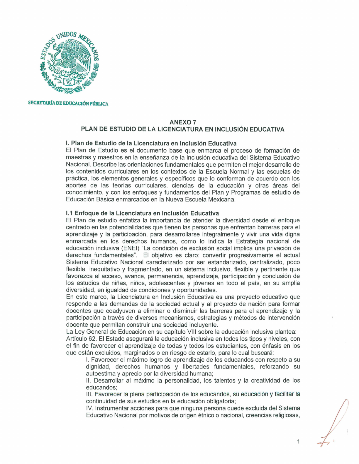 SECRETARfADE EDUCACIÓN PÚBUCA ANEXO 7 PLAN DE ESTUDIO DE LA LICENCIATURA EN INCLUSiÓN EDUCATIVA 1. Plan de Estudio de la Licenciatura en Inclusión Educativa El Plan de Estudio es el documento base que enmarca el proceso de formación de maestras y maestros en la enseñanza de la inclusión educativa del Sistema Educativo Nacional. Describe las orientaciones fundamentales que permiten el mejor desarrollo de los contenidos curriculares en los contextos de la Escuela Normal y las escuelas de práctica, los elementos generales y específicos que lo conforman de acuerdo con los aportes de las teorías curriculares, ciencias de la educación y otras áreas del conocimiento, y con los enfoques y fundamentos del Plan y Programas de estudio de Educación Básica enmarcados en la Nueva Escuela Mexicana. 1.1 Enfoque de la Licenciatura en Inclusión Educativa El Plan de estudio enfatiza la importancia de atender la diversidad desde el enfoque centrado en las potencialidades que tienen las personas que enfrentan barreras para el aprendizaje y la participación, para desarrollarse integralmente y vivir una vida digna enmarcada en los derechos humanos, como lo indica la Estrategia nacional de educación inclusiva (EN El) "La condición de exclusión social implica una privación de derechos fundamentales". El objetivo es claro: convertir progresivamente el actual Sistema Educativo Nacional caracterizado por ser estandarizado, centralizado, poco flexible, inequitativo y fragmentado, en un sistema inclusivo, flexible y pertinente que favorezca el acceso, avance, permanencia, aprendizaje, participación y conclusión de los estudios de niñas, niños, adolescentes y jóvenes en todo el país, en su amplia diversidad, en igualdad de condiciones y oportunidades. En este marco, la Licenciatura en Inclusión Educativa es una proyecto educativo que responde a las demandas de la sociedad actual y al proyecto de nación para formar docentes que coadyuven a eliminar o disminuir las barreras para el aprendizaje y la participación a través de diversos mecanismos, estrategias y métodos de intervención docente que permitan construir una sociedad incluyente. La Ley General de Educación en su capítulo VIII sobre la educación inclusiva plantea: Artículo 62. El Estado asegurará la educación inclusiva en todos los tipos y niveles, con el fin de favorecer el aprendizaje de todas y todos los estudiantes, con énfasis en los que están excluidos, marginados o en riesgo de estarlo, para lo cual buscará: 1. Favorecer el máximo logro de aprendizaje de los educandos con respeto a su dignidad, derechos humanos y libertades fundamentales, reforzando su autoestima y aprecio por la diversidad humana; 11. Desarrollar al máximo la personalidad, los talentos y la creatividad de los educandos; 111. Favorecer la plena participación de los educandos, su educación y facilitar la continuidad de sus estudios en la educación obligatoria; IV. Instrumentar acciones para que ninguna persona quede excluida del Sistema Educativo Nacional por motivos de origen étnico o nacional, creencias religiosas, 1 SEcRETAlÚADE EDUCACiÓN MUCA convicciones éticas o de conciencia, sexo, orientación sexual o de género, así como por sus características, necesidades, intereses, capacidades, habilidades y estilos de aprendizaje, entre otras, y V. Realizar los ajustes razonables en función de las necesidades de las personas y otorgar los apoyos necesarios para facilitar su formación. Artículo 63. El Estado proporcionará a las personas con discapacidad la posibilidad de aprender y desarrollar habilidades para la vida que favorezcan su inclusión laboral, a fin de propiciar su participación plena y en igualdad de condiciones en la educación y en la sociedad. Artículo 64. En la aplicación de esta Ley, se garantizará el derecho a la educación a las y los educandos con condiciones especiales o que enfrenten barreras para el aprendizaje y la participación. Las autoridades educativas, en el ámbito de su competencia, para atender a los educandos con capacidades, circunstancias, necesidades, estilos y ritmo de aprendizaje diversos, realizarán lo siguiente: 1. Prestar educación especial en condiciones necesarias, previa decisión y valoración por parte de los educandos, madres y padres de familia o tutores, personal docente y, en su caso, derivados por una condición de salud, para garantizar el derecho a la educación de las y los educandos que enfrentan barreras para el aprendizaje y la participación; 11. Ofrecer formatos accesibles para prestar educación especial, procurando en la medida de lo posible su incorporación a todos los servicios educativos, sin que esto cancele su posibilidad de acceder al servicio escolarizado; 111. Prestar educación especial para apoyar a las y los educandos con alguna discapacidad o aptitudes sobresalientes en los niveles de educación obligatoria; IV. Establecer un sistema de diagnóstico temprano y atención especializada para la eliminación de barreras para el aprendizaje y la participación; V. Garantizar la formación de todo el personal docente para que, en el ámbito de sus competencias, contribuyan a identificar y eliminar las barreras para el aprendizaje y la participación, y preste los apoyos que los educandos requieran; VI. Garantizar la satisfacción de las necesidades básicas de aprendizaje de los educandos con alguna discapacidad, su bienestar y máximo desarrollo para la autónoma inclusión a la vida social y productiva, y La ENEI, por su parte, es uno de los referentes en la construcción y desarrollo de la Licenciatura en Inclusión Educativa. De acuerdo con ella, la educación inclusiva tiene como principales rasgos: a. Estar diseñada para acoger a comunidades educativas inherentemente diversas y atender las diferentes expresiones de esa diversidad, no sólo las más visibles. b. Es el eje alrededor del cual ha de estructurarse todo el Sistema Educativo Nacional, no sólo es 