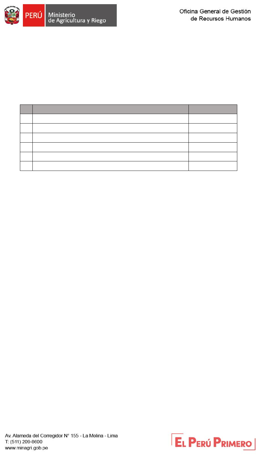 “Decenio de la Igualdad de Oportunidades para Mujeres y Hombres” “Año del Diálogo y la Reconciliación Nacional” PROCESO CAS Nº 297-2018-MINAGRI-OGGRH “CONTRATACION ADMINISTRATIVA DE SERVICIOS DE UN (01) ASISTENTE ADMINISTRATIVO- CAPACITACIÓN” PUBLICACION DE LOS RESULTADOS PRELIMINARES N° APELLIDOS Y NOMBRES CALIFICACION 1 SERNA CESPEDES GIULIANA APTO 2 HUAMANCHUMO ALFARO LUCIANA APTO 3 ALBUJAR GAVIDIA EVELYN APTO 4 AYARZA ROJAS RODRIGO APTO 5 SANCHEZ MANSANARES JUAN NO APTO 6 SIVIPARUCAR JORPI TALIA NO APTO Se le comunica al candidato que la siguiente etapa del proceso será según el siguiente detalle: ETAPA : ENTREVISTA PERSONAL Y EVALUACIONES Fecha : 26 de Diciembre de 2018 Hora : 09:00 horas Lugar : Av. La Universidad Nº 200 – La Molina. Segundo Comité de Selección CAS R.D. Nº 0796-2018-MINAGRI-OGGRH Fecha: 21 de diciembre de 2018