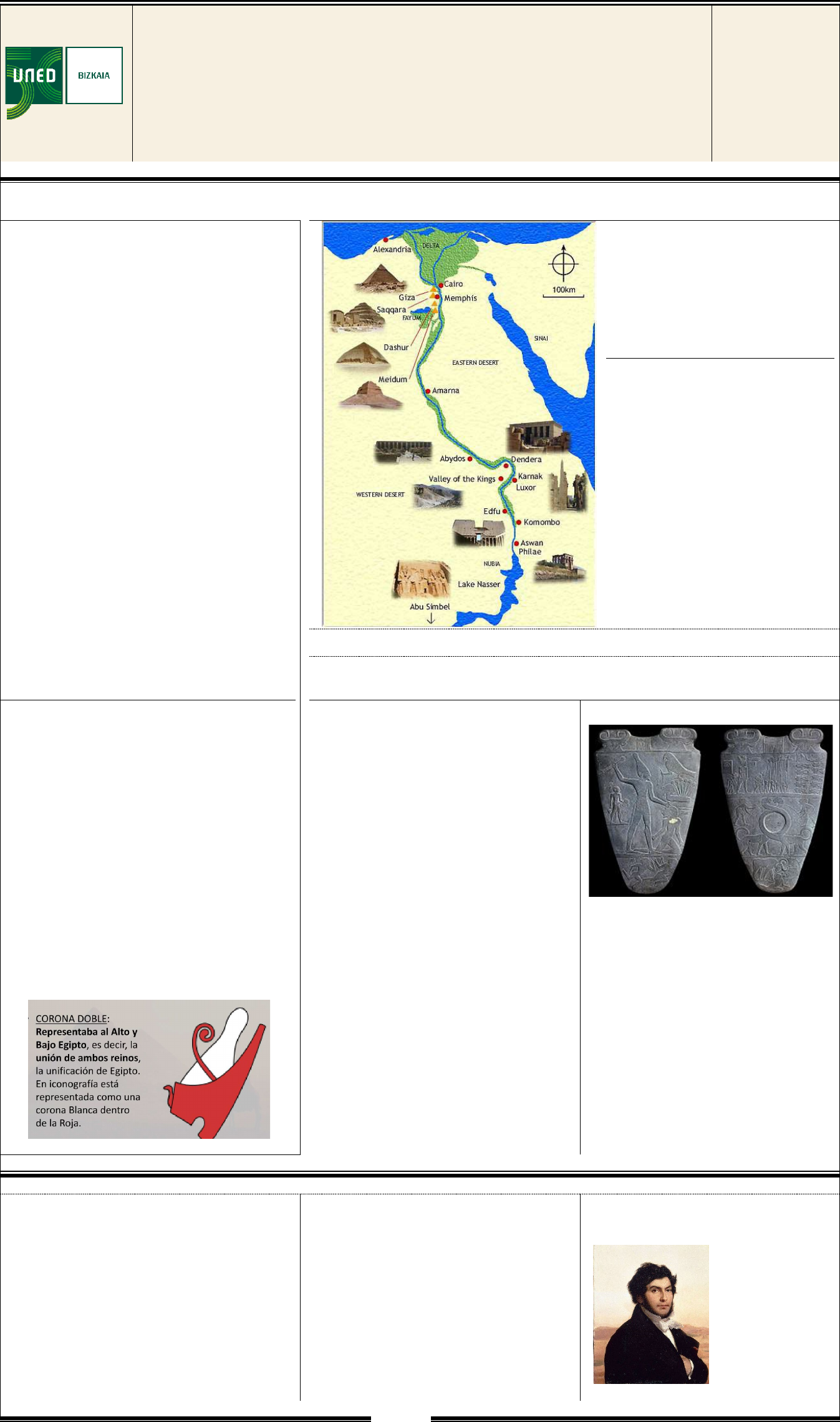 Descubriendo el antiguo Egipto Biblioteca Liburutegia Egipto, un don del Nilo Alrededor del año 3.100 a.C. nació una de las civilizaciones más poderosas y longevas del mundo antiguo: Egipto, conocido por sus habitantes como Kemet, “la tierra negra”, probablemente en referencia al limo dejado por las inundaciones estacionales del Nilo. Cuando el historiador Herodoto visitó Egipto en el 450 a.C., al contemplar la riqueza del país pronunció su célebre frase: “Egipto es un don del Nilo”. Sus palabras no podían ser mas ciertas El territorio del antiguo Egipto sería un desierto si no fuera por la aguas del río Nilo. La esperada inundación. Cada año los campos del valle del Nilo se renovaban con la crecida del rio. Los egipcios necesitaban que en la crecida anual el nivel de las aguas subiera entre 7 y 8 metros. Si era menos, una parte de los campos quedaba seca; si era más se corria el riesgo de que los pueblos quedaran anegados. El Alto y el Bajo Egipto El país estuvo siempre formado por dos realidades geográficas: la mitad sur o Alto Egipto, caracterizado por una estrecha franja fértil alrededor del río; y la mitad norte o Bajo Egipto, que abarcaba las vastas llanuras inundables del delta. Los dos reinos del Alto y Bajo Egipto se unieron hacia el 3000 a. C., pero cada uno mantuvo sus propios atributos el Hedjet o la Corona Blanca para el Alto Egipto y el deshret o la Corona Roja para el Bajo Egipto. El rio Nilo Se encuentra al nordeste de África y en su parte norte, atraviesa el desierto del Sahara. Nace en las montañas de Burundi y desemboca en el Mar Mediterráneo. Está formado por tres ríos: el Nilo Blanco, el Nilo Azul y Etbara. Principales monumentos levantados a las orillas del Nilo Egipto, tierra de faraones Los faraones eran conocidos como los gobernantes de las Dos Tierras, y llevaban el pschent, una doble corona, cada mitad representando la soberanía de uno de los reinos. La primera dinastía de faraones empieza con un rey llamado Narmer o Menes, aunque no existe un consenso total sobre si se trata de la misma persona o de dos individuos distintos. Lo que sí podemos saber es que Narmer fue el primero que proclamó su dominio sobre las dos tierras de Egipto y que lo plasmó en el documento que lleva su nombre: la paleta de Narmer, una pieza de esquisto decorada con imágenes y jeroglíficos que ilustran esta unificación. Paleta de Narmer Hace más de 5.000 años los primeros faraones lograron unificar el valle y el delta del Nilo, las dos tierras que conformaban el antiguo Egipto. Esta unificación se ilustra en la Paleta de Narmer, uno de los documentos egipcios más antiguos que se conservan. La escritura jeroglífica La piedra Rosetta Champollion La escritura del Antiguo Egipto constituía un complejo sistema de signos que se leía como las escrituras alfabéticas modernas y que transmitía mensajes muy precisos sobre todo religiosos o de exaltación del poder faraónico. La piedra de Rosetta, con inscripciones en egipcio, demótico y griego antiguo, fue hallada el 15 de julio de 1799 por parte de un destacamento militar francés. La estela contenía un decreto sacerdotal en honor del faraón Ptolomeo V, datado en el año 196 a.C. La piedra resulto clave para descifrar los jeroglificos egipcios Champollion fue quien, finalmente, en 1822 descifró los jeroglíficos egipcios a través de la piedra de Rosetta. Página 1 Egipto, tierra de faraones Biblioteca Liburutegia Las dinastias egipcias En la historia de Egipto se establecen 30 dinastías que van desde el año 3100 a.C. hasta el 332 a.C. Se pueden clasificar en diferentes periodos. Periodo dinástico temprano Comprende las dos primeras dinastías, y abarca del año 3100 al 2650 a.C. La primera dinastía comienza con la unificación de Egipto por el rey Menes. Imperio Antiguo El Periodo Antiguo de Egipto va del año 2635 al 2155 a.C. Este periodo, conocido como la "era de las pirámides", abarca de la III a la VI dinastía. Durante las dinastías III y IV Egipto vivió una época dorada. En esta época se construyó el complejo funerario de Menfis en Saqqara, con la famosa pirámide escalonada. Posteriormente se construyeron las 3 grandes Pirámides de Giza: Keops, Kefrén y Micerinos. Durante la VI dinastía el poder de los faraones disminuyó y la unidad del país comenzó a desvanecerse. Hasta la X dinastía y durante más de cien años hubo decenas de faraones que no supieron controlar el país. Alrededor de 2055 a.C., el príncipe tebano Mentuhotep vuelve a reunió a Egipto, comenzando la XI dinastía y terminando así el primer período intermedio. Imperio Medio El Imperio Medio se desarrolló entre el 2061 y el 1785 a.C. y abarca las dinastías XI y XII. Durante el Reino Medio, Egipto floreció una vez más, como lo había hecho durante el Antiguo Reino.Durante esta época Egipto extendió sus fronteras conquistando una parte de Nubia. El Reino Medio alcanzó su apogeo bajo Amenemhet III (1842-1797 a. C.); su declive comenzó bajo Amenenhet IV (1798-1790 a. C.) y continuó bajo su hermana y regente, la reina Sobekneferu (1789-1786 a. C.), quien fue la primera mujer gobernante confirmada de Egipto y la última gobernante de la XII dinastía. Tras no poder resistir los ataques de los hicsos, cedieron el poder a éstos. Los hicsos, llegados de Ásia, hicieron de Avaris la capital de Egipto durante dos dinastías y gobernaron el país entre la XIII y XVII. Imperio Nuevo Comprendido entre los años 1551 y 1080 a.C., el Imperio Nuevo engloba las dinastías XVIII-XX. La XVIII dinastía comienza con la expulsión de los hicsos hasta Kadesh por el rey Ahmosis, rey que había mantenido su poder en Tebas. Con la expulsión de los hicsos Tebas se volvió a instituir como la capital de Egipto. Los faraones más importantes del periodo fueron Tutmosis III, Amenhotep III y Ramsés II. Ramses II Durante el reinado de Ramsés II, Egipto conquistó Nubia y construyó los templos de Abu Simbel. Ramsés II viv