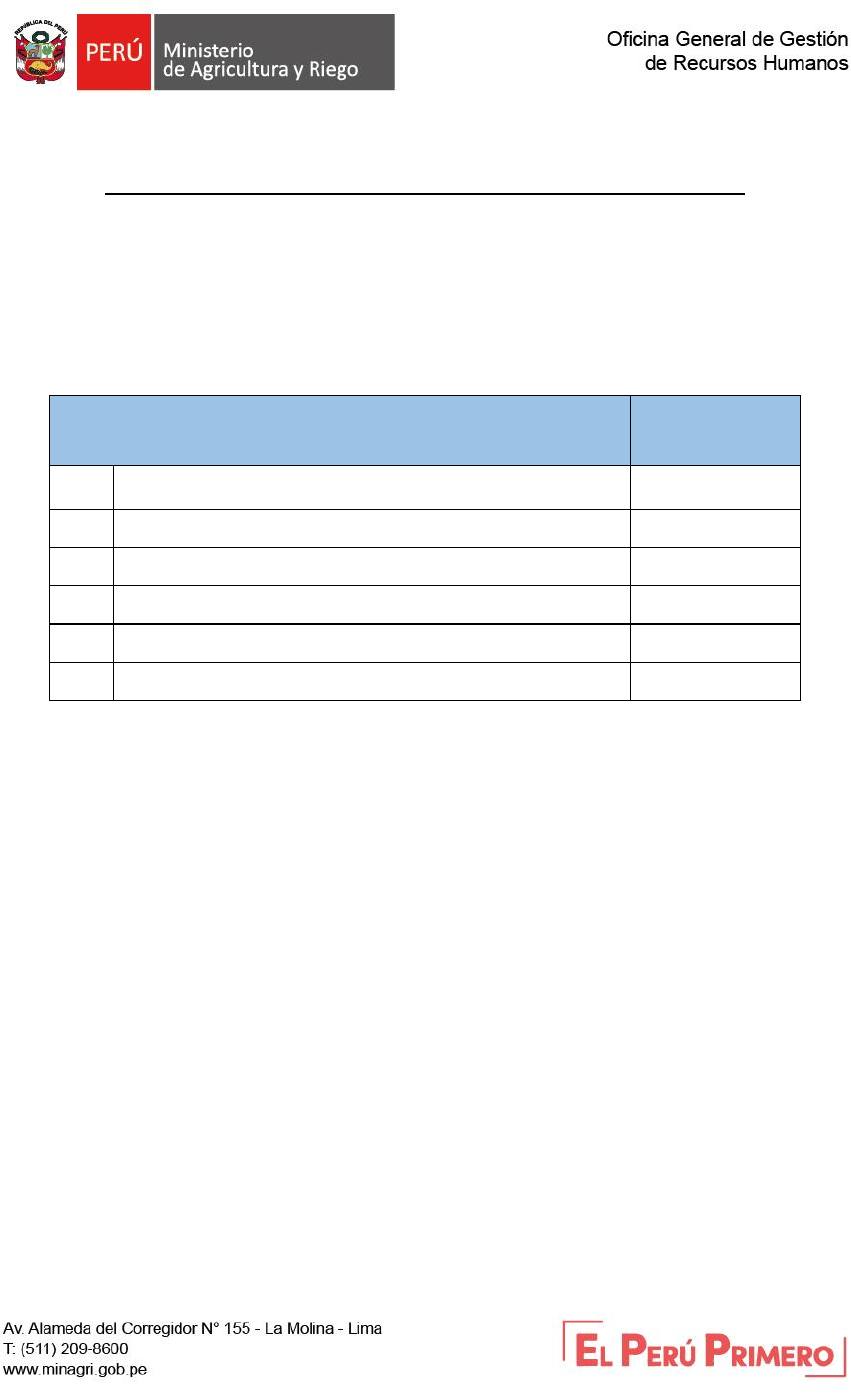“Decenio de la Igualdad de oportunidades para mujeres y hombres” “Año del Diálogo y la Reconciliación Nacional COMUNICADO Nº 001-2018-MINAGRI-SG-OGGRH-COM3 PROCESO CAS N° 086-2018-MINAGRI-SG-OGGRH “CONTRATACIÓN DE UN ESPECIALISTA EN DEGRADACION DE SUELOS PARA LA DIRECCION GENERAL DE ASUNTOS AMBIENTALES AGRARIOS - DGAAA” PUBLICACIÓN DE LOS RESULTADOS FINALES El comité acordó declarar DESIERTO el presente proceso de Selección, debido a que ninguno de los postulantes cumplió con los requisitos exigidos en el perfil del puesto, materia de la convocatoria. R.D. Nº 0419-2018-MINAGRI-OGGRH Comité 3 de Selección CAS Fecha: 28 de Septiembre de 2018. APELLIDOS Y NOMBRES CALIFICACION 1 BALDEON JARA LUIS CIRO NO APTO 2 OVER PEREZ SOPLIN NO APTO 3 PINEDO DAVILA MARCIAL RICARDO NO APTO 4 ROSARIO SANCHEZ EFRAIN OSCAR NO APTO 5 SOLANO VELARDE ZOZIMO NO APTO 6 VELARDE QUISPE MELQUIADES JAVIER NO APTO