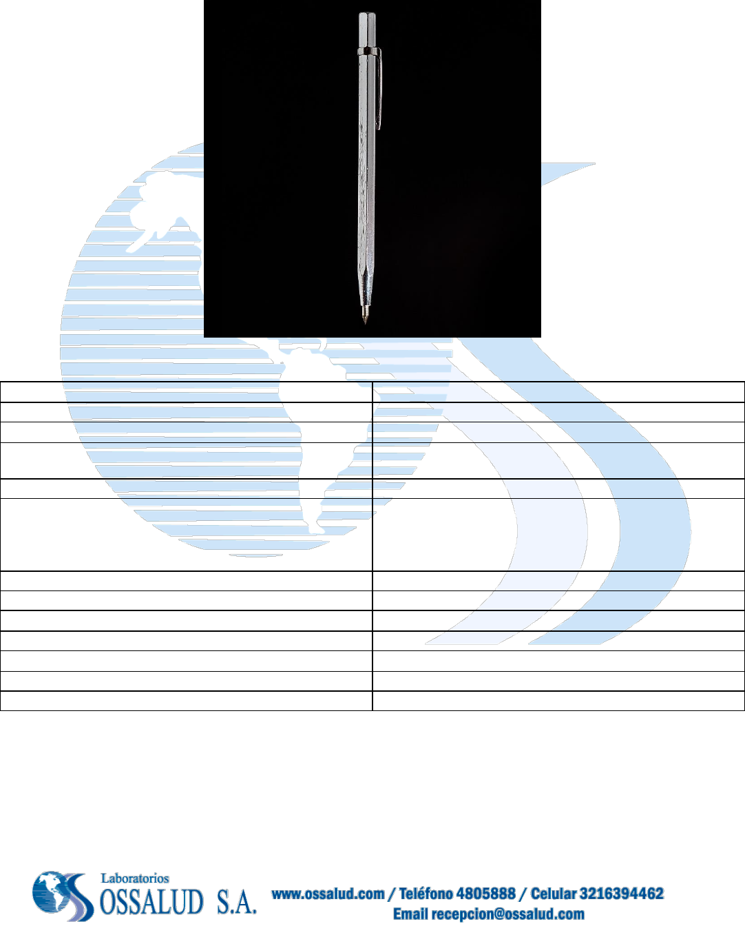 FICHA TÉCNICA LÁPIZ PUNTA DIAMANTE Nombre y referencia: Lápiz Punta Diamante– ref 0299 Composición: El producto está realizado 100% en acero inoxidable Presentación comercial: Unidad Características: Tiene la forma de un lápiz y la punta cuenta con una forma de diamante realizada en acero Material del empaque: Bolsa transparente Usos: El producto se utiliza para marcar vidrio. Para rotular indeleblemente láminas portaobjetos y otros vidrios la información grabada en el vidrio resiste la humedad, el calor, el frío y los disolventes Precauciones de usos y advertencias: No requiere Modo de uso: Uso general en laboratorios y consultorios Condiciones de almacenamiento: Mantener alejado de fuentes de calor Medidas (largo x ancho ) 14,3 cm x 7.5 cm Peso de la unidad de embalaje: 51 gramos Tiempo de vida útil: No requiere según su uso Registro sanitario: No requiere.