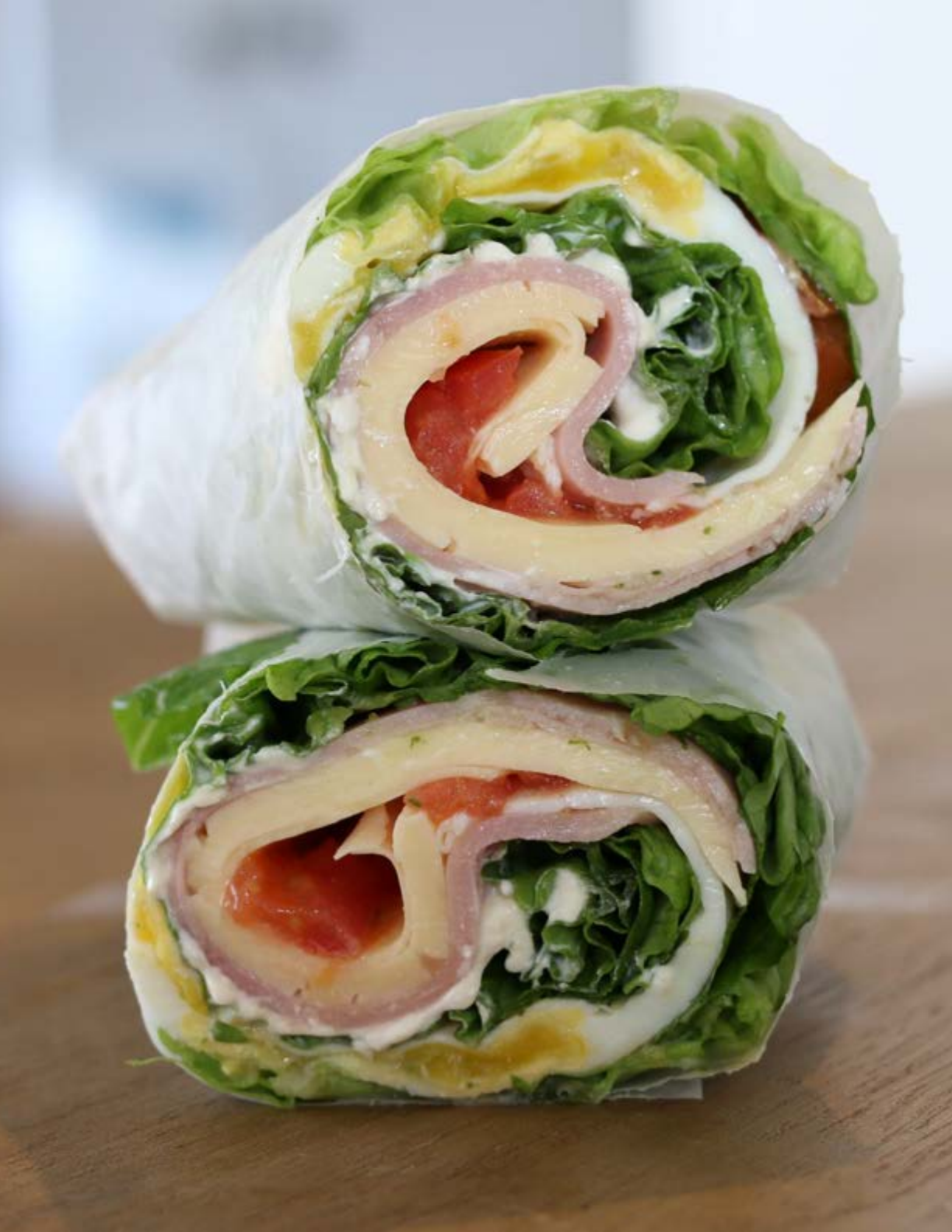 46 47 WRAPS DE JAMÓN Y QUESO TIEMPO TOTAL: 5 MIN | PORCIONES: 2 Estos wraps de lechuga son riquísimos, sanos y fáciles de hacer. INGREDIENTES ⬚ 1 planta de lechuga con hojas grandes ⬚ 100 g de jamón en fetas ⬚ 100 g de queso en fetas ⬚ 1 tomate grande cortado en fetas finas. ⬚ 1 huevo frito (opcional) ⬚ 2 cucharadas de mayonesa (opcional). PREPARACIÓN 1. Coloque 5 hojas grandes de lechuga sobre un papel pergamino/manteca. Es importante que las hojas queden superpuestas. 2. Unte la lechuga con mayonesa (opcional). 3. Agregue la capa de jamón, queso, tomate y el huevo. 4. Enrolle la lechuga, lo más apretado posible. Use el papel pergamino como guía y termine envolviendo todo el sandwich en el papel como si fuera un burrito. Corte el sandwich por la mitad. Tips: Hay cientos de variantes para el relleno. Prueba también relleno de huevo duro, mayonesa y atún. Imperdible!