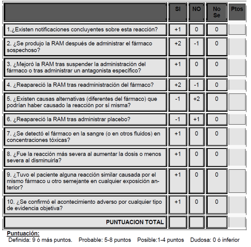 Algoritmo de Naranjo y Col Naranjo et al, Clin Pharmacol Ther 1981. 30:239-45.