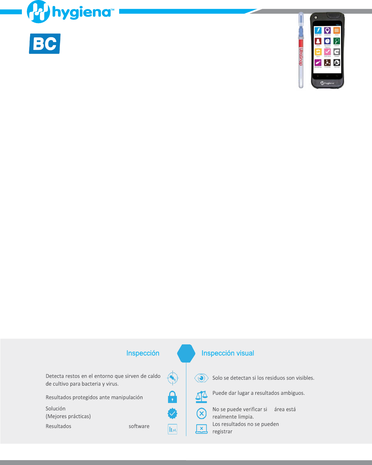 Pruebas de ATP vs Inspección Visual Cómo saber si una superficie está limpia Visión general En el centro de la seguridad alimentaria está la prevención. Esto significa que las plantas de producción de alimentos deben implementar un programa sólido para identificar y corregir posibles problemas de seguridad. Como parte del programa preventivo, los fabricantes de alimentos deben utilizar métodos de supervisión adicionales para determinar la higiene general de las áreas de procesamiento de alimentos. Deben evitar posibles retrasos, devoluciones y pérdidas económicas manteniendo estrictos procesos de limpieza y saneamiento. Si la producción comienza en una superficie que no se ha limpiado y/o desinfectado adecuadamente, el riesgo de contaminación aumenta drásticamente, lo que podría disminuir la inversión y los resultados de la empresa. Los servicios sanitarios tienen retos similares. Deben limpiar y desinfectar para maximizar la seguridad del paciente y reducir el riesgo de transmisión de patógenos resistentes a los antibióticos. Recientemente, la pandemia provocada por el COVID-19 ha sensibilizado a la población sobre la necesidad de controlar la propagación de enfermedades infecciosas, por lo que es más importante que los profesionales sanitarios supervisen la eficacia de los procedimientos de limpieza y desinfección. Como resultado, el monitoreo se ha expandido más allá de los hospitales y establecimientos médicos y ahora afecta a cualquier superficie con contacto elevado en los lugares públicos, como aeropuertos, hoteles, escuelas y grandes empresas. Estos lugares públicos también necesitan métodos verificados y validados para garantizar que las áreas estén limpias y desinfectadas para eliminar el riesgo de transferencia de infecciones a sus empleados, personal, clientes y estudiantes. Importancia de la limpieza Para que la limpieza y la desinfección funcionen, es vital que se realice correctamente. Aunque podría parecer lo contrario, los desinfectantes no están diseñados para eliminar el material orgánico, ya sea bacteriano, viral, restos de alimentos u otros desechos. Estos se emplean para garantizar que las superficies limpias permanezcan libres de microbios. La aplicación del desinfectante debe efectuarse después de una buena limpieza, realizada con suficiente energía para eliminar a fondo la mayoría del material no deseado. Incluso después de la limpieza, las superficies pueden tener rincones que podrían albergar patógenos potenciales. Por lo tanto, es fundamental no sólo limpiar, sino también desinfectar y muestrear diferentes áreas para confirmar que están libres de contaminantes. Los fabricantes de alimentos y los centros de salud han realizado tradicionalmente inspecciones visuales (a simple vista) o pruebas microbianas (hisopo de superficies y después pruebas de crecimiento) para ayudar a evaluar si los entornos son seguros y libres de posibles patógenos. Si bien estas pruebas son baratas y rápidas, las inspecciones visuales son imprecisas, subjetivas y pueden ser inaceptables en muchas instalaciones, especialmente en la atención médica. Por otro lado, las pruebas microbianas son un proceso que requiere mucho tiempo, tardando días en obtener resultados. Las instalaciones han recurrido cada vez más a nuevas tecnologías que pueden adoptar medidas objetivas y fiables de limpieza. Para superar esta brecha, muchos han recurrido a una solución rápida, confiable y fácil de usar, la medida del ATP (Adenosín trifosfato). ATP vs rápida para controlar la limpieza gestionados mediante el ¿Qué son las pruebas ATP? A diferencia de otros métodos, las pruebas de ATP proporcionan resultados en segundos y son sensibles, cuantitativas, eficaces y directas. Las bacterias y los residuos orgánicos contienen ATP, un indicador que se pueden detectar fácilmente para valorar la higiene. La limpieza y el saneamiento son herramientas eficaces que eliminan todo el ATP de las superficies de contacto (líneas de producción en el caso de los procesadores de alimentos). Una prueba de ATP fallida indica que la superficie no cumple con los estándares de limpieza y debe ser releída. Las instalaciones de producción de alimentos han utilizado el monitoreo de ATP durante décadas. Lo han incorporado como parte de su programa de control ambiental (EMP Prevención y Control Ambiental) para cumplir con las directrices microbiológicas de la FDA y HCCP. El EMP define claramente los procesos de vigilancia, validación y verificación de limpieza y saneamiento. Dado que el ATP es una molécula indicadora para la presencia de residuos biológicos, los niveles de ATP se pueden utilizar para monitorear la eficacia de la limpieza. Para valorar el atp, con un hisopo se recoge una muestra de una superficie o agua y se coloca en un dispositivo de lectura, un luminómetro. Los lectores de ATP reportan datos mediante bioluminiscencia, mostrados como una unidad relativa de luz o RLU. Cuanto mayor sea el RLU, mayor será el riesgo de contaminación potencial. La valoración del ATP no identifica directamente bacterias o virus (actualmente no hay ninguna prueba específica de superficie ambiental para determinar la presencia de COVID-19). En su lugar, detecta la presencia general de materia orgánica, que las bacterias y virus pueden utilizar para crecer y/o propagarse. Por lo tanto, los sistemas de ATP pueden verificar eficazmente los procesos de limpieza. Más allá de las pruebas alimentarias La industria de alimentos y bebidas no es el único sector que puedes representar un riesgo. Este proceso ha sido adoptado por otros sectores y otras industrias como hoteles, escuelas comedores hospitales, clínicas, residencias, etc. Dado que los hospitales y centros de salud necesitan maximizar la seguridad de sus pacientes y empleados a través de una limpieza y supervisión adecuadas, las pruebas ATP son ideales. Esto es especialmente crítico hoy en día por el impa