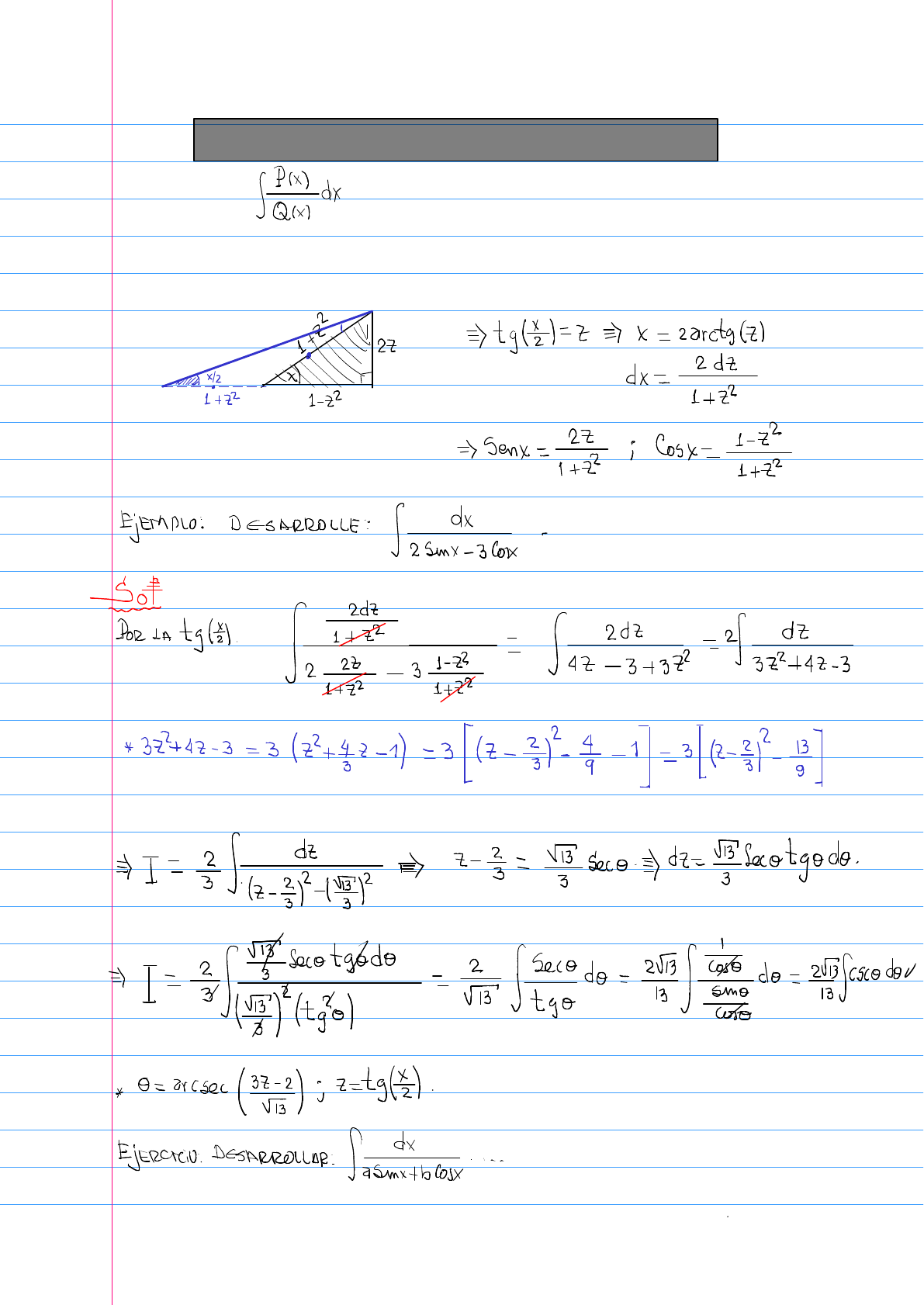 Integración de funciones racionales de senos y cosenos De la forma: donde: P(x) y Q(x) son "polinomios trigonométricos" Para desarrollar dichas integrales se recomienda utilizar el siguiente triángulo: si las funciones de seno y coseno estan elevadas al cuadrado, se recomienda utilizar el siguinte triángulo: Integración de expresiones de la forma: Estas integrales son llamadas de Chebishev, cundo cumplen alguna de estas condiciones: Jorge Chavez ... continuar .... Lulo continuar... Aguado... continuar ... Kaanashiro ....continuar