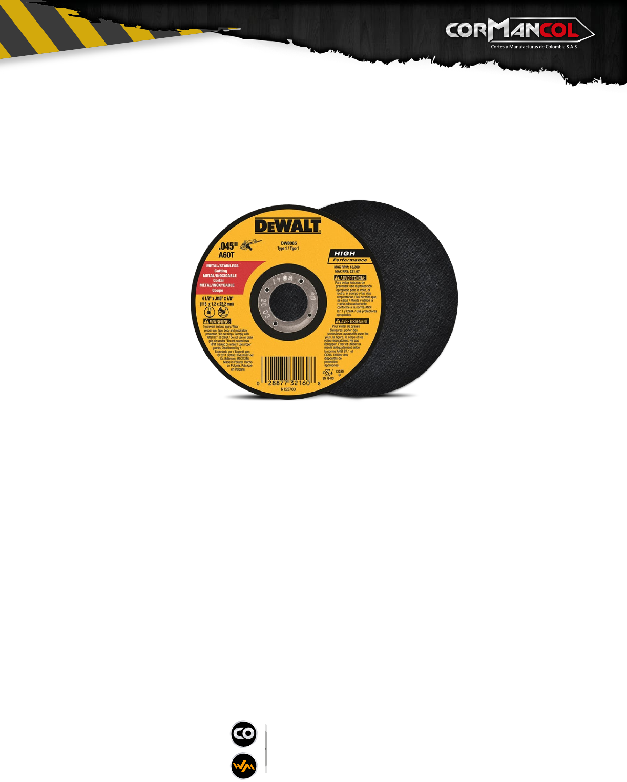 SOLDADOR VAQUETA REFORZADO 16” SOLDADOR VAQUETA 16” FICHA TéCNICA DISCO DE CORTE dewalt metal - acero inox. REF. DW862 PBX: 300 1246 Cel: +57-314 623 7117 / +57-313 389 1077 Calle 10 B Sur No. 15 A - 68 Bogotá D.C gerencia@cormancol.com produccion@cormancol.com www.cormancol.com Descripción Disco de Corte 4 1/2" Dewalt metal/acero inoxidable Discos de corte extra fino, flexible y ultra delgado, diseñado para cortes rápidos en metal y acero. De larga vida útil y disminuye el desperdicio de material al proveer forma, filo, dureza y flexibili- dad. 100% granos vírgenes para mayor rendimiento. Certifica- dos OSA de seguridad e ISO 9001:2000 de calidad. - Disco de Alto rendimiento - Este es un disco hecho con carburo de silicio adecuado para su uso con amoladoras de mano. - Perfecto para cortar metal y de grano 24 - Origen: Alemán - Max RPM: 13.300 - Recuerda usar equipamiento de protección personal para manipular este objeto. - Disco fino 4.1/2 X 0.045 X 7/8.