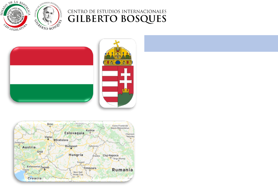 Superficie: 93,011 km2. Límites territoriales. Hungría se encuentra ubicada en el centro de Europa; colinda al norte con Eslovaquia, al noroeste y al este con Ucrania y Rumania, al sur con Serbia y Croacia y al oeste con Eslovenia y Austria. División Administrativa: 19 provincias, 23 ciudades provinciales y la capital. 19 provincias: • Bacs-Kiskun • Baranya • Bekes • Borsod-Abauj- Zemplen • Csongrad • Fejer • Gyor-Moson- Sopron • Hajdu-Bihar • Heves • Jasz-Nagykun- Szolnok • Komarom Esztergom • Nograd • Pest • Somogy • Szabolcs- Szatmar-Bereg • Tolna • Vas • Veszprem • Zala. HUNGRÍA FICHA TÉCNICA -Actualizada al 20 de abril de 2020- Nombre oficial: Hungría. Capital: Budapest. Día nacional: 20 de agosto. Población: 9, 771,827 habitantes (Est. 2020). Indicadores sociales (Est. 2020): • Esperanza de vida: 76.7 años. • Tasa de natalidad: 8.8 nacimientos. • Tasa de mortalidad: 12.9 muertes / 1,000 habitantes. Idioma: húngaro. Religión: catolicismo (67%); protestantismo (27%); judaísmo (5%); y otras (1%). Moneda: florín. Fuente: Central Intelligence Agency (CIA) Factbook, Hungary; y Ministerio de Asuntos Exteriores de España, Ficha país- Hungría. ESTRUCTURA DEL SISTEMA POLÍTICO Forma de Estado. Hungría es una república parlamentaria. El 18 de abril de 2011, el parlamento húngaro aprobó una nueva Constitución, llamada Ley Fundamental, la cual entró en vigor el 1 de enero de 2012.1 Poder Ejecutivo: encabezado por el presidente de la República (jefe de Estado) y por el primer ministro (jefe de Gobierno). El presidente es electo por la Asamblea Nacional, por una mayoría de dos tercios del Parlamento, para un periodo de 5 años (reelegible para un segundo periodo). El actual presidente es el señor János Áder (Unión Cívica Húngara- Fidesz), quien fue electo en 2012 y reelecto en 2017.2 Sus facultades se dividen en funciones representativas y protocolarias, además de que es el encargado de ratificar la legislación.3 La Asamblea Nacional elige al primer ministro por un periodo de 4 años, a propuesta del presidente. Actualmente, el jefe de Gobierno es el señor Viktor Orbán (Unión Cívica Húngara- Fidesz), desde 2010.4 Entre sus funciones principales destaca la de determinar la política general del gobierno.5 Poder Legislativo: unicameral; representado por la Asamblea Nacional, la cual está conformada por 199 miembros, elegidos por sufragio universal directo y secreto para un periodo de cuatro años. Entre sus facultades se encuentran: crear y modificar leyes; adoptar y aprobar el presupuesto; elegir al presidente de la República, a los miembros del Tribunal Constitucional y a su presidente, así como al primer ministro; decidir sobre el tema de la confianza en el gobierno; decidir sobre la declaración de un Estado de guerra y la conclusión de un acuerdo de paz.6 1 Embajada de Hungría en Madrid. La Ley Fundamental (La Constitución). Consultado el 17 de abril de 2020 en: https://bit.ly/2XJur2Y 2 Office of the President of the Republic. About the Institution of the President of the Republic. Consultado el 17 de abril de 2020 en: https://bit.ly/3akskoZ 3 Hungarian Government. Ley Fundamental de Hungría. Consultado el 17 de abril de 2020 en: https://bit.ly/34Ji6gG 4 Hungarian Government. The Prime Minister. Consultado el 17 de abril de 2020 en: https://bit.ly/3cwL8CL 5 Hungarian Government. Ley Fundamental de Hungría. Op. cit. 6 Ídem. Integración actual de la Asamblea Nacional Partido político Asientos Unión Cívica Húngara (Fidesz) y el Partido Popular Demócrata Cristiano (KDNP) 133 Movimiento por una Hungría Mejor (Jobbik) 26 Partido Socialista Húngaro (MSZP) – Diálogo para Hungría (PM) 20 Coalición Democrática (DK) 9 La Política Puede Ser Diferente (LMP) 8 Juntos - Partido por una Nueva Era (Együtt - A Korszakváltók Pártja) 1 Representación de Minorías Alemana que Viven en Hungría 1 Independiente 1 Total 199 Mujeres 176(12.06%) Hombres 23(87.94%) Total 199 (100%) Parlamento de Hungría. Electing Members of the National Assembly. Consultado el 17 de abril de 2020 en: https://bit.ly/34Oc8ew Unión Interparlamentaria (UIP). Hungary-Assembly National. Consultado el 17 de abril de 2020 en: https://bit.ly/2VgWxAT Poder Judicial: constituido por la Curia (Tribunal Supremo), los Tribunales Regionales de Apelación, los Tribunales Regionales, los Tribunales de Distrito y los Tribunales Administrativos y Laborales.7 CONTEXTO POLÍTICO En 2018, Hungría celebró elecciones parlamentarias para el periodo 2018- 2024. La victoria la obtuvo el partido Fidesz, con el 49% de los votos, logrando 133 de los 199 escaños; el partido Jobbik quedó como segunda fuerza con 19.06% de los votos y 26 escaños, seguido del partido Socialista (MSZP), el cual logró el 11.9% de los votos y 20 escaños; Coalición Democrática (DK) consiguió 9 escaños, La Política Puede Ser Diferente (LMP) ganó 8 escaños.8 7 BÍRÓSÁG. “Hungary Judicial System”. Consultado el 04 de mayo de 2018 en: https://bit.ly/3amRW4p 8 Ministerio de Asuntos Exteriores de España. Ficha país Hungría. Consultado el 19 de abril de 2020 en: https://bit.ly/3aoGbdX Tras el porcentaje parlamentario obtenido por el partido Fidesz, el 18 de mayo, se celebró en el Parlamento la investidura del nuevo Gobierno de Viktor Orbán, quien había estado en el cargo de primer ministro desde 2010, e iniciaría su tercer mandato.9 El primer ministro Orbán se presenta como un gran defensor y salvador de los valores cristianos tradicionales. Durante sus administraciones ha hecho reformas en las instituciones, así como también en el sistema electoral, la Constitución y el sistema de justicia, En cuanto a la migración, rechaza la política migratoria común impuesta por la Unión Europea.10 A finales de marzo de 2020, el Parlamento húngaro aprobó una reforma, que autoriza al primer ministro, Viktor Orbán, a gobernar por decreto y con poderes ilimitados par