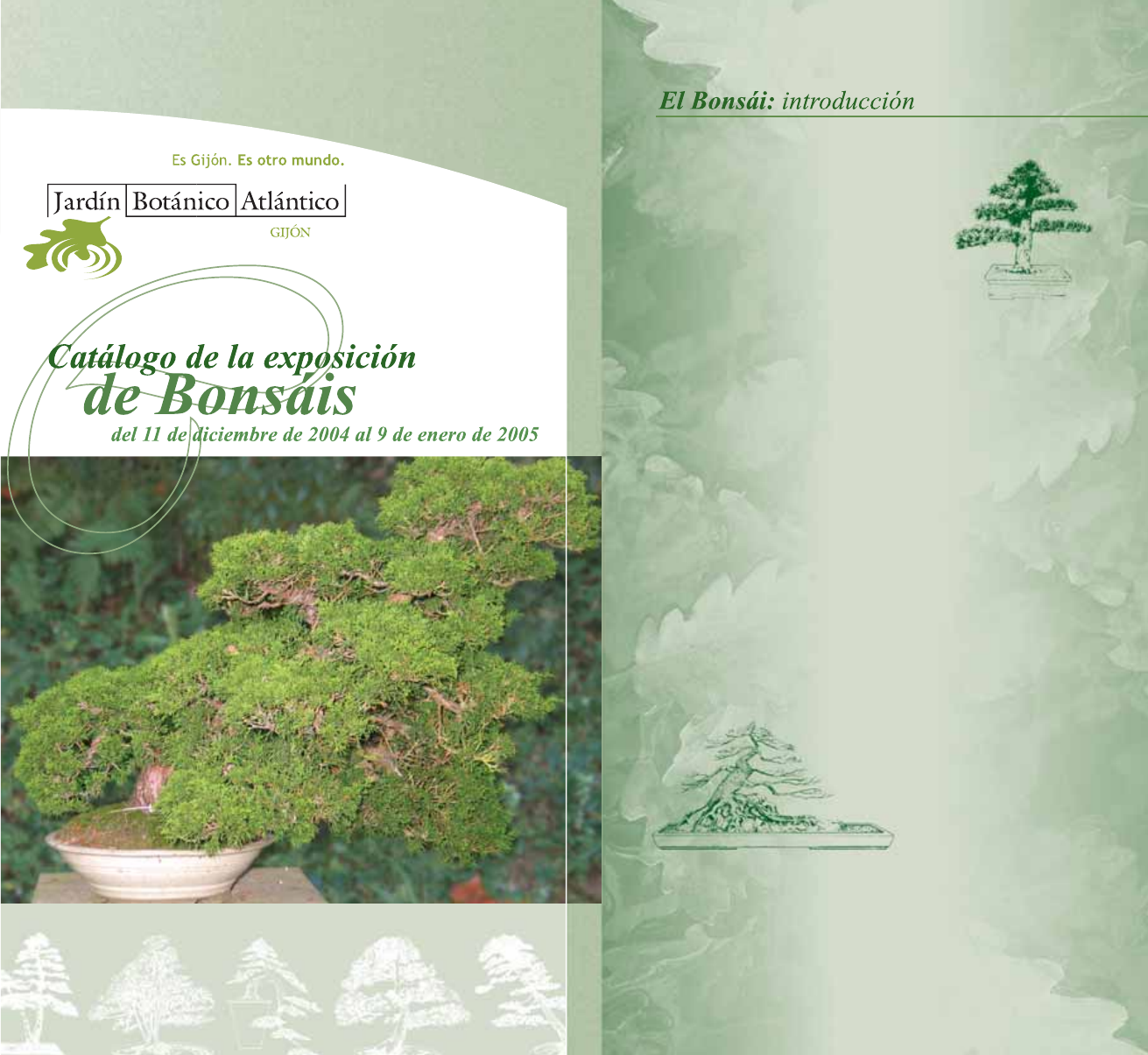 La palabra , aunque es japonesa, se utiliza y se comprende en todo el mundo. La traducción más apropiada sería la de . Ahondando en su definición, en realidad está compuesto de dos palabras: , que significa bandeja poco profunda, y , que quiere decir planta o plantación; aunque más allá de esta literalidad, el término además implica el elemento artístico que lo distingue de un árbol plantado en una maceta. Aunque el arte del bonsái se suele asociar actualmente a Japón, su origen está en China. Ya en torno al siglo XI se encuentran referencias literarias a los término chino para definir al bonsái. Era una actividad propia de la nobleza pero a partir de mediados del siglo XVII deja de ser privilegio de unos pocos para abrirse a todas las clases sociales chinas. En Japón, el bonsái se introdujo como presente ofrecido por los nobles chinos a los embajadores nipones. Fue, inicialmente, un arte aristocrático, cultivado con la misma intensidad espiritual de los maestros chinos y no fue autorizado al pueblo hasta la segunda mitad del siglo XIX. Es entonces, a lo largo del siglo XIX, cuando empezó a manifestarse en Europa un cierto interés por los , que maravillaban a quienes viajaban hasta Extremo Oriente. Pero fue a finales de este siglo, con motivo de la de 1898 y posteriormente en la de celebrada en 1909, cuando multitud de personas se entusiasmaron con las colecciones de auténticos bonsáis que allí se presentaron. Tuvo que pasar medio siglo hasta que la afición de cultivarlos contó con los primeros seguidores en Europa. bonsái bon sai pun-sai “un árbol o arbusto modelado y podado de tal manera que parece un árbol de tamaño normal, cultivado en un recipiente poco profundo para conseguir un efecto artístico y una impresión de la naturaleza” “bonsái” “bonsái” , “arbolitos enanos” Exposición Universal de París Londres “ ” “ ” 21 22 A A B B C 19 18 17 16 15 14 13 10 11 7 12 9 8 2 1 3 4 5 6 Entrada principal Colección de Luis Vallejo Pinus sylvestris Acer palmatum Fagus sylvatica Acer buergerianum Juniperus sabina Juniperus sabina Pinus thumbergiana Cryptomeria japonica Celtis australis Pinus sylvestris A A A A A A A A A A Jardín Botánico Atlántico de Gijón Buxus sempervirens Pinus parviflora pentaphylla Pinus mugo Ligustrum vulgare Juniperus media Buxus sempervirens Ulmus minor Fagus sylvatica Juniperus chinensis Buxus balearica Cedrus atlantica Juniperus rigida Euonymus japonicus Acer palmatum Chamaecyparis lawsoniana Quercus robur Crataegus laevigata Picea abies Taxodium distichum ‘Mirtifolia’ var. ‘Mops’ x ‘Pfitzerana’ ‘Glauca’ ‘Paul’s Scarlet’ ‘Nidiformis’ 2 3 4 5 6 7 8 9 10 11 13 14 16 17 18 19 20 22 1 Real Jardín Botánico de Madrid Buxus sempervirens Cedrus atlantica Pinus uncinata Pinus parviflora pentaphylla Quercus rotundifolia Olea europaea sylvestris Juniperus phoenicea Taxus baccata Crataegus Abies pinsapo Pinus thumbergiana Fagus sylvatica ‘Aurea’ var. var. sp. Museo del Bonsái de Alcobendas Fagus sylvatica Ulmus minor Juniperus sabina Chaenomeles sinensis Arbutus unedo Quercus rotundifolia C C C C C C B B B B B B B B B B B B 3 El Jardín Botánico Atlántico de Gijón presenta una amplia exposición de Bonsáis que incluye 47 ejemplares, algunos de los cuales forman parte de su propia colección permanente, en su mayoría donados por D. Luis Morán a este Botánico y otros, han sido cedidos por el Museo del Bonsái de Alcobendas y el Real Jardín Botánico de Madrid o bien, proceden de la colección privada de D. Luis Vallejo, recono- cido experto y, a su vez, Conservador de la colección de Bonsáis de esas dos citadas instituciones. Con la edición del se ofrecen algunas directrices sobre este complejo y maravilloso arte del cultivo del Bonsái, aportando detalles para la correcta identificación de las especies expuestas así como de los diferentes estilos de formación, el calendario de actuaciones, el herramental básico a utilizar y algunas otras curiosidades que nos acercan al arte milenario del cuidado y delicado manejo de estas plantas, que surgió en el continente asiático pero que ya cuenta entre nosotros con un público conocedor y entusiasta cada vez más amplio. Entre las especies que podemos contemplar en esta Exposición del Botánico descubrimos árboles y arbustos algunos muy familiares como el haya o el arce, y otros más exóticos cuyo origen se encuentra en lejanas latitudes, como el taxodium o ciprés de los pantanos. Una Exposición de Bonsáis sin duda novedosa y singular, y de nuevo una excusa más para visitar el Jardín Botánico Atlántico que pretende divulgar, acercarnos al mundo vegetal que nos es tan próximo y que es capaz de manifestarse de formas tan dispares y diversas. Catálogo de la Expo- sición Dulce Gallego Canteli Presidenta del Jardín Botánico Atlántico 4 El arte del bonsái intenta expresar todo aquello que está representado en la naturaleza. Al igual que la naturaleza transforma las plantas, dependiendo del ambiente existente, presentándolas con portes, formas y agrupaciones diferentes, también el bonsái se moldea en estilos diversos. De hecho, árboles enanos se encuentran accidentalmente en la naturaleza y presentan las mismas características que sus congéneres de tamaño natural, pero a escala reducida. Su peculiar desarrollo no se debe a la intervención del hombre, sino a elementos naturales: los suelos extremadamente rocosos impiden el desarrollo de las raíces, limitando así su crecimiento; los animales herbívoros ejercen como técnicos de la poda y el pinzamiento; el azote del viento modela su figura como un idóneo corsé de alambre... Y la lluvia y el sol cumplen adecuadamente con sus tareas de mantenimiento. Las distintas tendencias y conceptos sobre este arte y su filosofía que han ido desarrollándose en el curso de los siglos, han dado lugar a una gran variedad de estilos, no obstante, al ser hoy Japón la fuente 