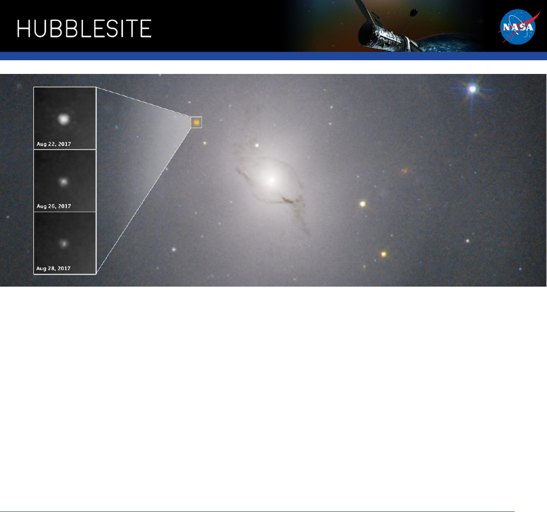 Imagen: Fuente de onda gravitacional NGC 4993 LAS MISIONES DE NASA OBSERVAN LA PRIMERA LUZ DE UN EVENTO DE ONDA GRAVITACIONAL Fecha de publicación: 16 de octubre de 2017 a las 10:00 a. m. (EDT) Colisión de estrellas de neutrones produce elementos exóticos, ondas gravitacionales Hay algunas personas que deciden cocinar y crean deliciosas comidas, pero dejan un desorden caótico de comida salpicada y platos sucios. La cocina cósmica también puede ser desordenada. Aunque una estrella puede crear elementos químicos tan pesados como el hierro en su núcleo, cualquier cosa que sea más pesada debe venir de una fuente más potente, como una explosión estelar o la colisión de dos estrellas de neutrones. Las estrellas de neutrones pueden producir oro, plutonio y una variedad de otros elementos al tener colisiones. En teoría, generan también ondas gravitacionales al girar juntas a gran velocidad antes de fusionarse. La primera señal de onda gravitacional de una fusión de estrellas de neutrones se detectó el 17 de agosto. Estuvo acompañada de rayos gama y otro tipo de luz, y permitió que los astrónomos identificaran la fuente de onda gravitacional por primera vez. Hubble fotografió el brillo de esta gigantesca colisión, que brilla desde la galaxia NGC 4993 a una distancia de 130 millones años luz. Hubble también obtuvo un espectro infrarrojo que podría producir señales de elementos exóticos radioactivos. El análisis continuará mientras los astrónomos esperan que la fuente de la onda gravitacional emerja por detrás del Sol desde el punto de observación de la Tierra, de donde desapareció unos días después de ser descubierta. La historia completa Por primera vez, los científicos de NASA han detectado luz relacionada con un evento de onda gravitacional, gracias a la fusión de dos estrellas de neutrones en la galaxia NGC 4993, situada a 130 millones de años luz de la Tierra en la constelación Hydra. Poco después de las 8:41 a. m. EDT el 17 de agosto, el Telescopio Espacial de Rayos Gamma Fermi de NASA detectó un pulso de luz de alta energía de una poderosa explosión, que se trasmitió a los astrónomos alrededor del mundo como una explosión corta de rayos gamma. Los científicos en el Observatorio de Ondas Gravitacionales con Interferómetro Láser (LIGO) de la Fundación Nacional de Ciencias detectaron ondas gravitacionales de un par de estrellas en colisión ligadas a una explosión corta de rayos gamma, que denominaron GW170817, lo cual animó a los astrónomos a buscar las consecuencias del estallido. Poco después, la explosión se detectó como parte de un análisis de seguimiento del satélite INTEGRAL de ESA (la Agencia Espacial Europea). Las misiones de NASA Swift, Hubble, Chandra y Spitzer, junto con docenas de observatorios en la superficie terrestre, como el estudio de PanSTARRS financiado por NASA, capturaron más tarde el brillo que se disipaba de los escombros resultantes del estallido. “Esta es ciencia extremadamente emocionante”, dijo Paul Hertz, director de la División de Astrofísica de NASA en la sede central de la agencia en Washington. “Ahora, por primera vez, hemos visto luz y ondas gravitacionales producidas por el mismo evento. La detección de las ondas gravitacionales y luz generadas por un mismo evento reveló detalles que no podrían haber sido determinados únicamente por las ondas gravitacionales. Es increíble el efecto multiplicador del estudio con varios observatorios”. Número de publicación de la noticia: STScI-2017-41 http://hubblesite.org/news_release/news/2017-41 Las estrellas de neutrones son los núcleos triturados remanentes de estrellas masivas que explotaron como supernovas mucho tiempo atrás. Las estrellas fusionadas muy probablemente tenían masas 10 a 60 por ciento más grandes que la de nuestro Sol, pero no son más anchas que la ciudad de Washington D. C. El par rotó una en torno a la otra cientos de veces por segundo, produciendo ondas gravitacionales en la misma frecuencia. A medida que se acercaban y orbitaban más rápido, eventualmente las estrellas se dividieron y fusionaron, produciendo una explosión de rayos gamma y un estallido, raramente visto, llamado “kilonova”. “Es lo que todos estábamos esperando”, dijo David Reitze, director ejecutivo del Laboratorio LIGO de Caltech en Pasadena, California. “Las fusiones de estrellas de neutrones producen una amplia variedad de luz porque, cuando colisionan, esos objetos forman un torbellino de desechos calientes. Es muy probable que la fusión de agujeros negros, los tipos de eventos que han sido observados previamente por LIGO y su contraparte europea, Virgo, consuman cualquier materia que se halle a su alrededor, mucho antes de su colisión, así es que no esperamos que se vea el mismo tipo de espectáculo de luces”. “La explicación favorita para las explosiones cortas de rayos gamma es que son causadas por chorros de desechos que se mueven cerca de la velocidad de la luz, y son producto de la fusión de estrellas de neutrones o de una estrella de neutrones y un agujero negro”, explicó Eric Burns, integrante del equipo de Monitoreo de Estallidos de Rayos Gamma del Observatorio Fermi, perteneciente al Centro de Vuelo Espacial Goddard, de NASA, con sede en Greenbelt, Maryland. “LIGO nos dice que allí hubo una fusión de objetos compactos, y Fermi que hubo una explosión corta de rayos gama. Con la información de ambos, sabemos que observamos la fusión de dos estrellas de neutrones, y confirmamos drásticamente que están relacionados”. A escasas horas de la detección inicial realizada por Fermi, LIGO y el detector Virgo, en el Observatorio Gravitacional Europeo cerca de Pisa, Italia, precisaron en gran medida la posición del evento en el cielo con análisis adicionales de los datos de la onda gravitacional. Luego, observatorios situados en la superficie terrestre ubicaron rápidamente una nueva fuente óptica e infrarroja, la 
