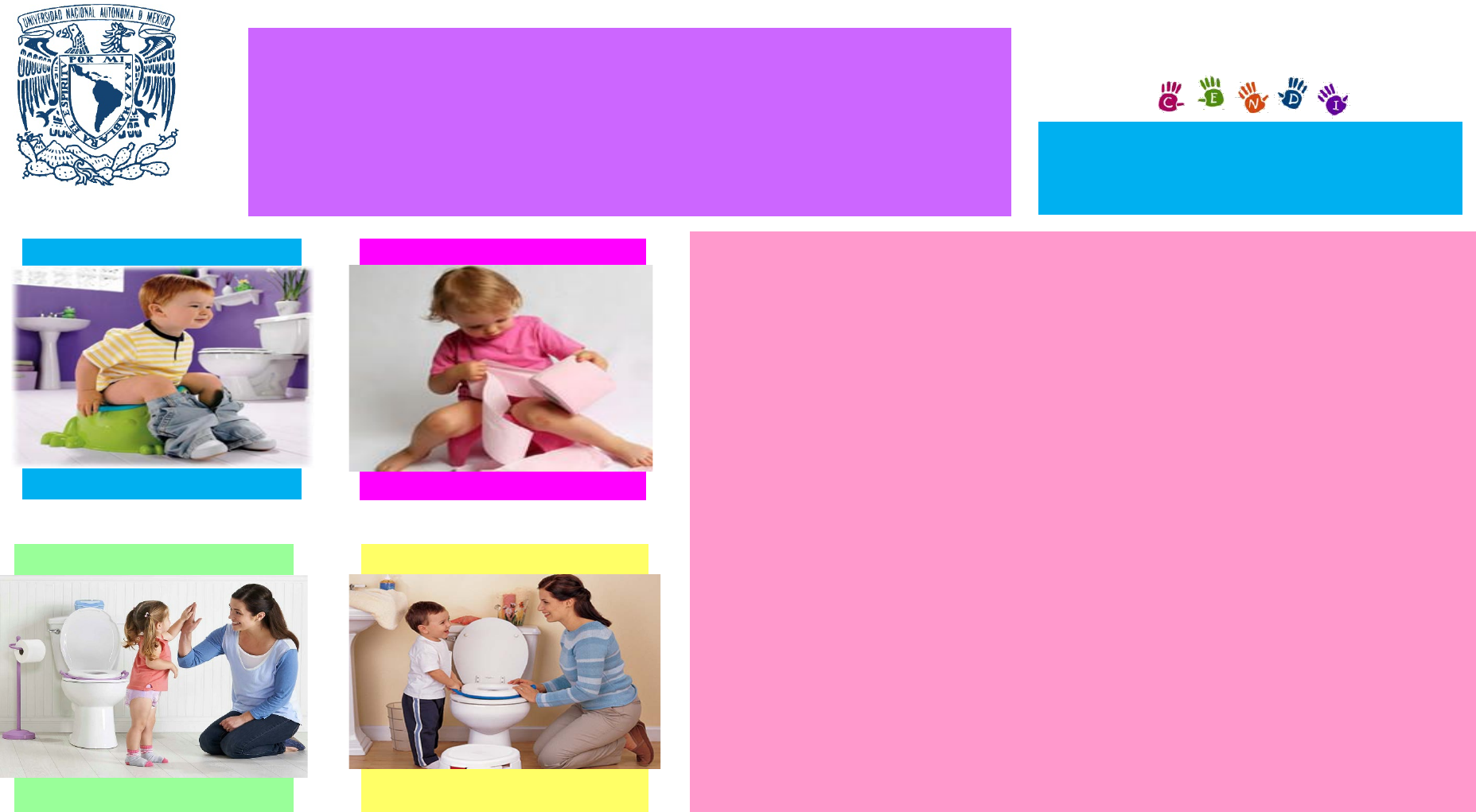 Programa Control de Esfínteres La Dirección General de Personal a través de la Dirección de los CENDI y Jardín de Niños con la finalidad de apoyarlas en el Programa de Control de Esfínteres durante la Jornada Nacional de Sana Distancia, pone a su disposición la siguiente guía que servirá para dar acompañamiento a las madres, padres de familia o cuidadores para consolidar el control de esfínteres en nuestras niñas y niños que se inició en los Centros de Desarrollo Infantil, deseamos que no lo interrumpas y que con amor y cariño continúen el proceso desde casa. Sabemos que este confinamiento puede generar retrocesos en las etapas de desarrollo y que se den por vencida rápidamente, pero animo no desesperen!, es por ello que la presente guía tiene como objetivo apoyar, orientar y acompañar en este momento tan importante! El control de esfínteres representa no solo la adquisición de nuevas habilidades, sino también el sentido de logro, autonomía y autoestima de los niños y niñas. ¡Ayudemos desde casa a nuestros niños y niñas a lograrlo! DIRECCIÓN GENERAL DE PERSONAL DIRECCIÓN DE LOS CENDI Y JARDÍN DE NIÑOS ¡PORQUE LA UNAM NO SE DETIENE! ¿Recuerda usted el sentido de logro cuando aprendió a patinar o a andar en bicicleta? En el control de esfínteres pasa algo parecido, ya que no solo representa autodominio, también implica madurez neurológica. Los niños y niñas entre dos y tres años, están aprendiendo a cuidar de sí mismos, a poner sus capacidades a prueba y van desarrollando habilidades, como vestirse, comer o ir al baño solos. Esta es una etapa en la que buscarán explorar e iniciarán la convivencia con nuevas personas. En la medida en que los niños y niñas reconozcan que tienen control sobre su cuerpo sentirán más confianza para aventurarse a nuevas experiencias, es por eso que dejar de usar el pañal se convierte en un paso más en su desarrollo social.¿P or q ué e s i m po rta nt e el Co nt ro l d e Es fí nt er es ? El Control de Esfínteres representa uno de los logros más importantes en la primera infancia, que le da al niño o niña sentido de autonomía, conocimiento y control sobre su propio cuerpo, de allí la importancia de su consolidación, por eso es importante continuar y apoyarlos. 1. Disipar la tensión del ambiente. El niño o niña debe saber y sentir que cuenta con el apoyo y acompañamiento de su mamá, papá o cuidador dentro de un ambiente de seguridad y confianza, donde sus logros son validados y reconocidos. (aplausos, porras, abrazos, besos). 2. El niño o la niña debe darse cuenta de que inician juntos la adquisición de una nueva habilidad. ¡Ir a la nica es un gran logro! 3. Para iniciar el Programa de Control de Esfínteres el niño o niña deberá dominar la marcha (caminar sin ayuda) para poder ir al baño. 4. Se requiere que tenga la coordinación motriz y el tono muscular suficiente para poder vestirse y desvestirse. 5. Debe ser capaz de seguir instrucciones simples. 6. Contar con un lenguaje básico para poder comunicar sus necesidades. Antes del Control de Esfínteres… ¿Qué requisitos debemos conocer? Es importante usar un vocabulario simple y sencillo para el niño o la niña: Por ejemplo: Nica Pipí Popó Evitar usar palabras como: Sucio Cochino Bueno Malo Ayudarle a identificar sensaciones como: • Frio • Caliente • Húmedo • Seco Practíquenlas para que los niños y niñas puedan nombrarlas y esto ayudara a que la comunicación fluya de manera eficaz entre niño-adulto. ¿Q ué L en gu aj e D eb em os u sa r? 1. Elección de la nica, es importante que el adulto elija modelo ya que debe ser sin obstáculos al frente, lisa para mejor limpieza y el niño o niña elija el color. 2. Comprar calzones de tela entrenadores de algodón, que le ajusten bien. 3. Ropa practica, sin broches, sin botones, sin tirantes, sin cinturón. 4. Uso de pantalones o pants de resorte (mezclilla no), short o vestido corto y calcetines para cada cambio. 5. Huaraches de plástico (con plantilla de plástico, correa que le ajuste bien, protección al frente). 6. Jugar con sus muñecos a que hagan pipi en la nica. 7. Adaptar sanitario con banco y el asiento. (Cuando observe que ya esta preparado para dejar la nica) 8. Dejar que explore la nica el primer día. 9. Invitarlo a sentarse en la nica con ropa. 10. Asegurarle un buen ambiente, cordial y amable. 11. Se le debe de ayudar e indicar como bajarse la ropa para sentarse. 12. Ceremonia de despedida del pañal (el cual ya no se debe volver a usar, se puede hacer inventando una canción, diciendo que ya no es un bebé) Tips para iniciar el Control de Esfínteres 4. Algunos niños o niñas les da miedo o se confunden cuando hacen pipí o popó pues creen que éstos son parte de su cuerpo, otros niños o niñas sienten que el excusado los succionará cuando estén sentados, pues no saben cómo desaparecen los desechos cuando jalan la palanca. Explíquele que es una manera en la que su cuerpo elimina las cosas que no necesita y permítale que jale la palanca después de vaciar el contenido de la nica para que disminuya su miedo y sienta que tiene más control. 5. Otros niños o niñas se interesan en ver cómo van al baño sus papá, mamá o hermanos si están de acuerdo, permita que los acompañen y aprendan observando.La s R ut in as y e l J ue go ¿P or q ué so n ta n Im po rta nt es ? 1. Establezca en casa una rutina diaria para que el niño o niña se siente en el baño en un horario específico, por ejemplo cuando se levante, después de las comidas y antes de las siestas. 2. Realice actividades sencillas con el niño o niña mientras se sienta en la nica con la ropa puesta, como leer cuentos, sentar a los muñecos o cantar una canción. 3. Una vez que se haya adaptado a la nica, sugiérale que intente bajar su calzón y se siente en la nica para aprender a usarla. Si nota que le cuesta trabajo bajarse la ropa, guíe sus manos con las suyas para que aprenda a quit