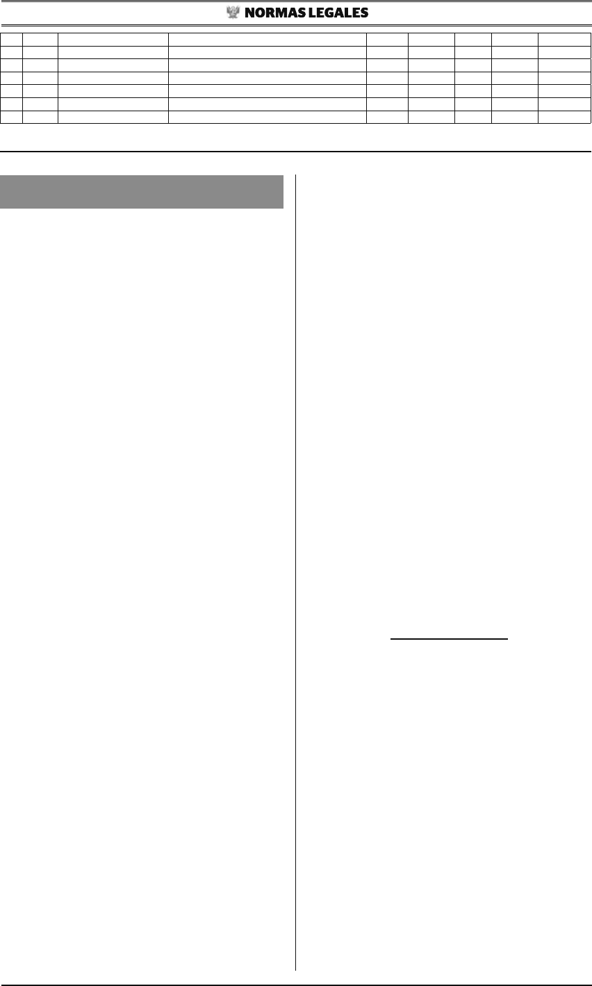El Peruano Lunes 9 de febrero de 2015 546445 N° ID EX UNIDAD MINERA TIPO DE PASIVO ESTE NORTE ZONA DATUM PUNTAJE 24 13045 PAREDONES BOCAMINA 741196 9204463 17 PSAD56 33 25 13046 PAREDONES CAMPAMENTOS, OFICINAS, TALLERES 741390 9204380 17 PSAD56 24 26 13047 PAREDONES DESMONTE DE MINA 741437 9204374 17 PSAD56 37 27 13048 PAREDONES BOCAMINA 741416 9204397 17 PSAD56 39 28 13049 PAREDONES BOCAMINA 741505 9204385 17 PSAD56 39 29 13050 PAREDONES BOCAMINA 741738 9204432 17 PSAD56 33 1197990-1 SALUD Designan Jefa de Equipo de la Oficina de Prensa y Relaciones Públicas de la Oficina General de Comunicaciones del Ministerio RESOLUCIÓN MINISTERIAL Nº 065-2015/MINSA Lima, 6 de febrero del 2015 Vistos, los Expedientes N°s.15-000092-001, 15- 000092-002 y 15-000434-001, que contienen la Nota Informativa Nº 002-2015-OGC/MINSA, emitida por la Directora General de la Ofi cina General de Comunicaciones del Ministerio de Salud; y, CONSIDERANDO: Que, a través de la Resolución Ministerial Nº 694- 2013/MINSA, de fecha 31 de octubre de 2013, se designó al Licenciado en Periodismo John Edward Castro Varillas, en el cargo de Jefe de Equipo, Nivel F-3, de la Ofi cina de Prensa y Relaciones Públicas de la Ofi cina General de Comunicaciones del Ministerio de Salud; Que, según Informe Nº 002-2015-JECV-OPRP-OGC/ MINSA, de fecha 5 de enero de 2015, el Licenciado en Periodismo John Edward Castro Varillas, formula renuncia poniendo a disposición el cargo en el que fuera designado mediante Resolución Ministerial Nº 694-2013/MINSA; Que, con Resolución Ministerial Nº 1019-2014/MINSA, de fecha 31 de diciembre de 2014, se aprobó el Cuadro para Asignación de Personal Provisional de la Administración Central del Ministerio de Salud, en el cual los cargos de Jefe/ a de Equipo de la Ofi cina de Prensa y Relaciones Públicas y de Jefe/a de Equipo de la Ofi cina de Comunicación Social se encuentran califi cados como Directivo Superior de Libre Designación y Directivo Superior, respectivamente; Que, mediante el documento de vistos, la Directora General de la Ofi cina General de Comunicaciones, comunica de la renuncia formulada por el Licenciado en Periodismo John Edward Castro Varillas, al cargo en el que fuera designado en virtud a la Resolución Ministerial Nº 694-2013/MINSA; asimismo, propone que se le encargue a dicho profesional las funciones del cargo de Jefe de Equipo de la Ofi cina de Comunicación Social y se designe a la Bachiller en Ciencias de la Comunicación Miryam Donella Espinoza Coveñas, en el cargo de Jefe de Equipo de la Ofi cina de Prensa y Relaciones Públicas de la Ofi cina General a su cargo respectivamente; Que, a través del Informe Nº 050-2015-EIE-OGGRH/ MINSA, remitido a través del Memorando N° 0103-2015- OGGRH-OARH-EIE/MINSA, la Ofi cina General de Gestión de Recursos Humanos del Ministerio de Salud, emite opinión favorable respecto a lo solicitado por la Directora General de la Ofi cina General de Comunicaciones, señalando que procede aceptar la renuncia formulada, encargar y designar a los profesionales propuestos respectivamente, toda vez que el cargo de Jefe/a de Equipo de la Ofi cina de Comunicación Social se encuentra califi cado como Directivo Superior, con plaza en condición de vacante y se efectuaría a un profesional nombrado de la Administración Central del Ministerio de Salud; y el cargo de Jefe/a de Equipo de la Ofi cina de Prensa y Relaciones Públicas se encuentra califi cado como Directivo Superior de Libre Designación; Que, en mérito a lo señalado en los considerandos precedentes, resulta pertinente adoptar las acciones de personal necesarias a fi n de asegurar el normal funcionamiento de la citada Ofi cina General; Con el visado de la Directora General de la Ofi cina General de Gestión de Recursos Humanos, de la Directora General de la Ofi cina General de Asesoría Jurídica y de la Secretaria General; y, De conformidad con lo previsto en la Ley Nº 27594, Ley que regula la participación del Poder Ejecutivo en el nombramiento y designación de funcionarios públicos; en el Decreto Legislativo Nº 276, Ley de Bases de la Carrera Administrativa y de Remuneraciones del Sector Público y en su Reglamento aprobado por Decreto Supremo Nº 005-90-PCM; en el numeral 8) del artículo 25° de la Ley N° 29158, Ley Orgánica del Poder Ejecutivo y en el Decreto Legislativo Nº 1161, Ley de Organización y Funciones del Ministerio de Salud; SE RESUELVE: Artículo 1º.- Aceptar la renuncia formulada por el Licenciado en Periodismo John Edward Castro Varillas, al cargo de Jefe de Equipo, Nivel F-3, de la Ofi cina de Prensa y Relaciones Públicas de la Ofi cina General de Comunicaciones del Ministerio de Salud, dándosele las gracias por los servicios prestados. Artículo 2º.- Designar a la Bachiller en Ciencias de la Comunicación Miryam Donella Espinoza Coveñas, en el cargo de Jefa de Equipo, Nivel F-3, de la Ofi cina de Prensa y Relaciones Públicas de la Ofi cina General de Comunicaciones del Ministerio de Salud. Artículo 3º.- Encargar al Licenciado en Periodismo John Edward Castro Varillas, las funciones de Jefe de Equipo, Nivel F-3, de la Ofi cina de Comunicación Social de la Ofi cina General de Comunicaciones del Ministerio de Salud. Regístrese, comuníquese y publíquese. ANÍBAL VELÁSQUEZ VALDIVIA Ministro de Salud 1198317-4 Aprueban “Norma Sanitaria para el Almacenamiento de Alimentos Terminados destinados al Consumo Humano” RESOLUCIÓN MINISTERIAL Nº 066-2015/MINSA Lima, 6 de febrero del 2015 Visto, el Expediente N° 13-091003-003, que contiene los Informes N°s. 001142-2014/DHAZ/DIGESA y 005793- 2014/DHAZ/DIGESA, de la Dirección General de Salud Ambiental del Ministerio de Salud; CONSIDERANDO: Que, los numerales I y II del Título Preliminar de la Ley N° 26842, Ley General de Salud disponen que la salud es condición indispensable del desarrollo humano y medio fundamental para alcanzar el bienestar individual y colectivo, y que la protecci