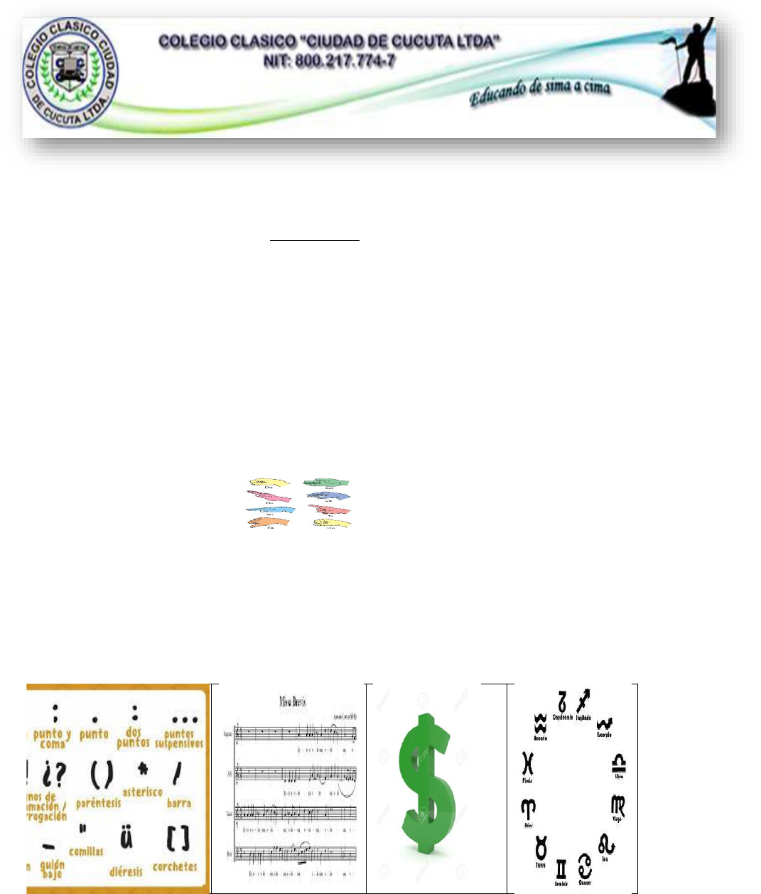 ASIGNATURA: CASTELLANO 2 PERIODO GRADO: 7 DOCENTE: LEIDY JIMÉNEZ TEMA: EL SÍMBOLO, SIGNO Y LAS SEÑALES FECHA DE ENTREGA DEL DOCENTE: 23 DE JUNIO 2020 FECHA DE ENTREGA DE TRABAJO DEL ESTUDIANTE: VIERNES 3 DE JULIO 2020 EL SÍMBOLO, SIGNO Y LAS SEÑALES La semiótica o semiología es aquella ciencia que se encarga del estudio de los signos en el seno de la vida social. SIGNO: Se conoce como signo al objeto o fenómeno material que, natural o convencionalmente, representa y sustituye a otro objeto o señal. Es todo aquello que sirve para transmitir una información. También, puede ser el gesto hecho con alguna parte del cuerpo para expresar o indicar algo. Por ejemplo: los sordomudos, o me hizo un signo para saber dónde estaba la salida. Por otra parte, en matemática, el signo permite identificar la naturaleza de las cantidades y las operaciones que se han de ejecutar con ellas. Por ejemplo: signos más o menos, signo de multiplicación, signo mayor o menor que, signo infinito, entre otros. EJEMPLOS: SIGNOS DE PUNTUACIÓN SIGNO MUSICALES SIGNO DINERO SIGNO ZODIACAL https://es.wikipedia.org/wiki/Semi%C3%B3tica TIPOS DE SIGNOS: SEÑALES Es un tipo de signo que tiene por finalidad cambiar u originar una acción y actúa de manera directa e inmediata sobre el receptor del mensaje. Como su palabra lo indica señala indicando la proximidad de una cosa. Cuando vemos una señal, ella nos indica que debemos prestar atención a un hecho en un momento determinado o modificar una actividad prevista. Las señales deben ser respetadas ya que son de gran ayuda, nos permiten orientarnos. Cuando paseamos por un zoológico o un parque y queremos saber dónde quedan los cafetines, los baños o los animales, observamos señales pertinentes que nos indican su ubicación. Entre las señales más utilizadas en todo el mundo tenemos las de tránsito. http://www.monografias.com/trabajos35/categoria-accion/categoria-accion.shtml http://www.monografias.com/trabajos14/deficitsuperavit/deficitsuperavit.shtml http://www.monografias.com/trabajos10/cani/cani.shtml EL SÍMBOLO Los símbolos son elementos de la comunicación humana que ayudan a transmitir información o mensajes de un emisor a un receptor. Se basan por lo tanto en la representación de algo a través del uso de otra cosa. Por lo tanto, sus características son muy similares a los de los signos. Los símbolos son utilizados constantemente ya que ayudan a reafirmar ideas y posturas respecto a algo. Los símbolos, dadas sus características, pueden cambiar al paso del tiempo, Es por ello que los símbolos suelen redefinirse cada cierto tiempo para dar paso a nuevos significados y mensajes. 1. A CADA EJEMPLO DE SÍMBOLO ESCRÍBE COMO SE LLAMA Y CUÁL ES SU FUNCIÓN: EL ICONO Se denomina ícono a una representación de un objeto o persona. El término también puede utilizarse de modo figurado para aludir a un tipo de elemento que representa una determinada circunstancia o hecho. Cuando hablamos de icono, solemos referirnos a una simbología, algo que se puede interpretar como la representación gráfica de un concepto, una imagen cuya función es la de sustituir al objeto mediante su significado, mediante una representación o bien por analogía, de modo que a partir de su representación nos ofrece un concepto similar al objeto en cuestión. En concreto podemos deducir que en nuestro día a día, usamos el término icono como sinónimo de símbolo. EN EL ÁMBITO DE LA INFORMÁTICA, un icono es un concepto altamente utilizado ya que básicamente su representación gráfica se utiliza para la identificación de todo tipo de programas (software) o diversas funciones que pueden desarrollarse con un ordenador u otro dispositivo. Estos pictogramas digitales nos facilitan el uso de los ordenadores como por ejemplo cuando decimos, “Tienes que hacer doble clic en el icono de la W para abrir el Microsoft Word”. Los iconos suelen ser representaciones gráficas de un tamaño reducido que representan esos ficheros, accesos directos o bien distintos programas y gracias a ellos se facilita su ejecución mediante el uso de una interfaz gráfica adecuada. EJEMPLOS: 2. ESCRIBE SU NOMBRE Y LO QUE SIGNIFICAN https://tusejemplos.com/wp-content/uploads/2016/05/iconos.jpg ACTIVIDAD 3. Consignar en el cuaderno la información, los que puedan sacar la copia la pegan 4. Realizo un cuadro donde diferencies los términos signo, símbolo, ícono, señal 5. Dibujo o busco en revistas 3 ejemplos de signos, símbolos, señales e íconos. 6. Inventa tu propio icono ( una hoja del cuaderno de forma creativa) 7. Señala cuál es el significado de los siguientes signos: a) Cinco estrellas junto al nombre de un hotel. b) Una señal de tráfico triangular, con borde rojo y el dibujo de unos niños caminando. c) Los sonidos cortos e intermitentes del auricular de un teléfono descolgado. d) La tarjeta roja que enseña un árbitro en medio de un partido de fútbol. e) Una columna de humo en medio del bosque. f) Un relámpago. g) Una cruz roja en la fachada de un edificio. 8. . ¿Cuáles de los signos anteriores son indicios icono y símbolos? Haz tres columnas y construye un esquema como el siguiente Ejemplo: SÍMBOLO ÍCONO INDICIO 9. DEFINO CADA CLASE DE SIGNO,EXCLUYA SIMBOLOS E ICONOS.