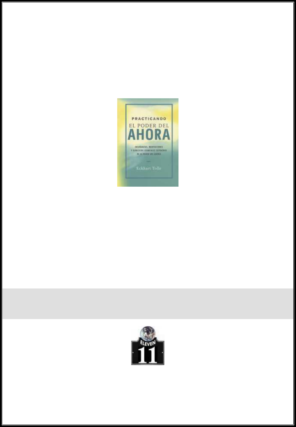 PRACTICANDO EL PODER DEL AHORA ENSEÑANZAS, MEDITACIONES Y EJERCICIOS ESENCIALES EXTRAÍDOS DE “EL PODER DEL AHORA” ECKHART TOLLE 2001 Este libro fue pasado a formato digital para facilitar la difusión, y con el propósito de que así como usted lo recibió lo pueda hacer llegar a alguien más. HERNÁN Para descargar de Internet: “ELEVEN” – Biblioteca del Nuevo Tiempo Rosario – Argentina Adherida a: Directorio Promineo: www.promineo.gq.nu Libros de Luz: http://librosdeluz.tripod.com 2 Practicando el Poder del Ahora Título Original: Practicing the Power of Now – Essential Teachings, Meditations and Exercises from The Power of Now 2001, _Eckhart Tolle Digitalizador: ✠ Nascav (España) L-03 – 12/11/03 La libertad comienza cuando te das cuenta de que no eres «el pensador». En el momento en que empiezas a observar al pensador, se activa un nivel de conciencia superior. Entonces te das cuenta de que hay un vasto reino de inteligencia más allá del pensamiento, y de que el pensamiento sólo es una pequeña parte de esa inteligencia. También te das cuenta de que todas las cosas verdaderamente importantes —la belleza, el amor, la creatividad, la alegría, la paz interna— surgen de más allá de la mente. Empiezas a despertar. ÍNÍNÍNÍNDICEDICEDICEDICE INTRODUCCIÓN, por Eckhart Tolle PRIMERA PARTE ACCEDER AL PODER DEL AHORA CAPÍTULO UNO Ser e iluminación CAPÍTULO DOS El origen del miedo CAPÍTULO TRES Accede al poder del ahora CAPÍTULO CUATRO La disolución de la inconsciencia CAPÍTULO CINCO La belleza surge en la quietud de tu presencia SEGUNDA PARTE LAS RELACIONES COMO PRÁCTICA ESPIRITUAL CAPÍTULO SEIS Disolver el cuerpo-dolor CAPÍTULO SIETE De las relaciones adictivas a las relaciones iluminadas TERCERA PARTE ACEPTACIÓN Y RENDICIÓN CAPÍTULO OCHO La aceptación del ahora CAPÍTULO NUEVE Transformar la enfermedad y el sufrimiento AGRADECIMIENTOS 3 INTRODUCCIÓNINTRODUCCIÓNINTRODUCCIÓNINTRODUCCIÓN POR ECKHART TOLLE Desde su primera publicación, en 1997, El poder del ahora ha impactado sobre la conciencia colectiva del planeta mucho más de lo que jamás me hubiese imaginado. Ha sido traducido a quince idiomas, y diariamente recibo cartas de todas partes del mundo en las que los lectores me cuentan que sus vidas realmente han cambiado con las enseñanzas del libro. A pesar de que los efectos de la locura de la mente egotista siguen siendo visibles por todas partes, algo nuevo está surgiendo. Hasta ahora, nunca ha habido tantas personas preparadas para deshacerse de los modelos mentales colectivos que desde tiempos inmemoriales han vinculado a la humanidad con el sufrimiento. Un nuevo estado de conciencia está surgiendo. ¡Ya hemos sufrido bastante! Incluso está emergiendo de tu interior en este mismo momento, mientras coges el libro entre tus manos y lees estas líneas que hablan de la posibilidad de vivir una vida liberada en la que ni te haces sufrir a ti mismo ni a los demás. Muchos de los lectores que se pusieron en contacto conmigo me comunicaron su deseo de que los aspectos prácticos de las enseñanzas contenidas en El poder del ahora fuesen presentados en un formato más accesible, para poder utilizarlos a diario. Ese pedido se convirtió en el motor que impulsó este libro. No obstante, además de los ejercicios y las prácticas, esta obra también contiene una selección de pasajes del libro original que permiten recordar algunos de sus conceptos e ideas, y que espero se convierta en el manual que os ayude a incorporar tales nociones en vuestra vida cotidiana. Muchos de esos fragmentos son particularmente adecuados para la lectura meditativa. Cuando practicas la lectura meditativa no lees con el fin de recopilar nueva información, sino para entrar en un estado de conciencia diferente a medida que lees. Esta es la razón por la cual puedes repasar el mismo pasaje una y otra vez, y en cada ocasión sentirlo fresco y novedoso. Sólo las palabras que fueron escritas o pronunciadas en un estado de presencia poseen ese poder transformador, que es el poder de despertar la presencia en el lector. Es preferible que leas estos párrafos lentamente. En muchas ocasiones desearás hacer una pausa para reflexionar en silencio, reposadamente; en otras, sencillamente, quizá prefieras abrir el libro al azar y leer algunas líneas. Aquellos lectores que se sintieron intimidados o abrumados por El poder del ahora encontrarán también en esta obra una introducción a la transformación de la conciencia humana. ECKHART TOLLE, 9 de julio de 2001 PRIMERA PARTEPRIMERA PARTEPRIMERA PARTEPRIMERA PARTE ACCEDER AL PODER DEL AHORAACCEDER AL PODER DEL AHORAACCEDER AL PODER DEL AHORAACCEDER AL PODER DEL AHORA Cuando tu conciencia se dirige hacia fuera, surgen la mente y el mundo. Cuando se dirige hacia dentro, alcanza su propia Fuente y regresa a casa, a lo No Manifestado. CAPÍTULOCAPÍTULOCAPÍTULOCAPÍTULO UNOUNOUNOUNO SERSERSERSER EEEE ILUMINACIÓNILUMINACIÓNILUMINACIÓNILUMINACIÓN Más allá de la miríada de formas de vida que están sujetas al nacimiento y a la muerte existe la Vida Una, eterna y omnipresente. Muchas personas utilizan la palabra Dios para describirla, pero yo suelo llamarla Ser. La palabra Ser no explica nada, pero la palabra Dios tampoco. Ser, no obstante, tiene la ventaja de ser un concepto abierto. No reduce el infinito invisible a una entidad finita. Es imposible formarse una imagen mental del Ser, y nadie puede pretender su posesión exclusiva. Es tu esencia misma; puedes acceder a ella inmediatamente como el sentimiento de tu propia presencia. Por eso sólo hay un pequeño paso entre la palabra Ser y la experiencia del Ser. EL SER NO SÓLO ES TRASCENDENTE; TAMBIÉN IMPREGNA PROFUNDAMENTE cada forma, y su esencia es invisible e indestructible. Esto significa que ahora mismo puedes acceder al Ser porque es tu identidad más profunda, tu verdadera naturaleza. Pero no trates de aferrarlo con la mente. No trates de entenderlo. Sólo puedes