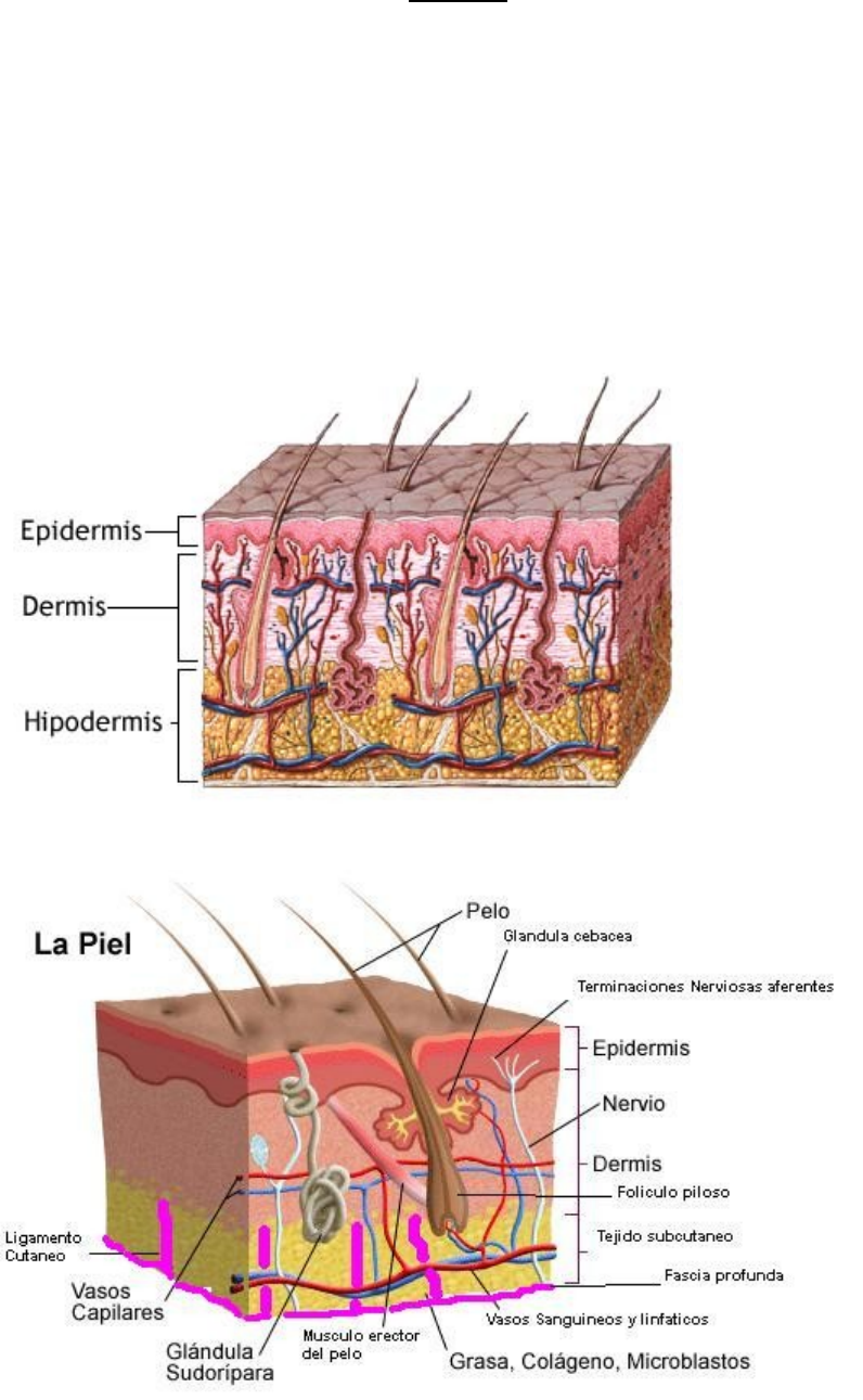 EL PELO El pelo es un filamento de queratina (célula blanda en el pelo pero dura en las uñas) constituido por una raíz y un tallo que se forma en un folículo especializado de la epidermis. La epidermis es la capa más superficial de la piel, lo que esta por debajo es el bulbo o folículo piloso. El pelo se origina en el interior de la piel. Dentro del folículo piloso, en el fondo se haya situado la papila del pelo, la raíz y en la zona media unas láminas transparentes pegadas al pelo que son las vainas. Todo este conjunto forma el “bulbo”. La parte del pelo que permanece en el folículo esta compuesto por células vivas, y la parte que vemos en su exterior (tallo) células sin vida que están queratinizadas. El pelo tiene función de protección y una función psico-social. El grosor del pelo está relacionado con su color y la raza de la persona. El grosor del pelo varía según en la zona que se encuentre: · Pelo de pestañas y cejas: tieso, corto, grueso. · Vello que recubre todo el cuerpo: “pelusilla”, suave, fina y corta. · Pelo que recubre el cráneo: “cabello”, flexible y alcanza longitudes diversas (barba, axilas, pubis, bigote). El pelo disminuye al pasar los años. TIPOS DE PELO: · Pelos terminales: Son rígidos, gruesos y generalmente son modulados y pigmentados. Están situados en el cuero cabelludo, pestañas, barba, cejas, bigote, pubis y axilas. Tamaño intermedio: 1 cm. aprox. · Pelos vellosos: Cortos, blandos, finos y apigmentados. Los pelos rubios de los antebrazos, de la periferia de la areola mamaria y mejillas pueden ser cortos o largos. Aunque no se aprecian en muchas partes del cuerpo existen numerosos vellos. CORTE TRANSVERSAL DEL PELO: A. Cutícula: Parte exterior que envuelve el pelo, formado por células corneas. Ocupa el 9% de la superficie total del cabello y es una capa protectora resistente a las fuerzas de orden físico y químico que podrían dañar con rapidez las fibras del cabello al emerger de la piel; su integridad proporciona brillo al cabello y facilidad de deslizamiento cuando se cepilla. B. Córtex: Zona intermedia, células longitudinales y queratinizadas y se halla el pigmento. Constituye la capa media del tallo piloso, con un 70% de la superficie total del cabello, responsable de las propiedades mecánicas del cabello. C. Médula: La más interna, se forma en la papila. Acompañada del tallo en su longitud por el interior. Representa el 21 % de la superficie del cabello, se encuentra en la parte central y está compuesta por células córneas redondeadas, sin núcleo y poco pigmentadas; no existen ni en el vello ni en el laguno de los fetos. COLOR DEL PELO: La coloración del pelo es debido a la melanina producida por las células básales del Bulbo. Y estas la transmiten a la corteza. La melanina tiene dos formas diferentes: · Forma granulosa: Responsable de la coloración negra y su degradación hasta roja. · Forma difusa: Coloración rojiza, más o menos intensa hasta tonalidades muy claras o amarillentas. Cuando no hay pigmento en el pelo se vuelve blanco o canoso. RITMO DE CRECIMIENTO DEL CABELLO: El cabello tiene un crecimiento irregular. El pelo cae mientras se forma uno nuevo. Los largos períodos de actividad son seguidos por otros de caída y de repaso del folículo. Estas etapas forman el “ciclo vital del cabello”, son tres: - Anágena: fase de crecimiento cuya actividad oscila entre 4 y 5 años. - Catágena: fase de caída del pelo, puede durar 3 semanas aproximadamente. La papila está atrofiada y el cabello se cae. - Telógena: fase de reposo del folículo, puede durar meses hasta que de nuevo se restablece el ciclo. El estado de salud, la edad o el embarazo pueden alterar el tiempo de duración de estas fases, afectando especialmente al estado telógeno. El pelo del cuero cabelludo crece por término medio 1 Mm. cada tres días mientras que las pestañas y el vello corporal lo hacen con más lentitud. Para el perfecto estado del pelo son necesarias algunas vitaminas del grupo B, así como minerales (azufre, cobre y cinc). El calor y el masaje incrementan la actividad del folículo, cuanto más lo tocas ayuda a que crezca. ALTERACIONES DEL PELO Las alteraciones más corrientes pueden encontrarse por diferentes causas: · Traumatismos. · Hongos. · Mal uso de productos químicos. · Origen congénito. Pueden afectar exclusivamente al tallo, a su raíz, a su coloración y al cuero cabelludo. ANORMALIDADES A CAUSA DEL COLOR Coloraciones: cambio de color de origen congénito o adquirido en el transcurso de la vida. 1. Rotilismo: pelirrojos. 2. Albinoidismo: piel y cabellos muy blancas, pero no tanto como los albinos. 3. Variaciones fisiológicas: variedad en una persona, barba más clara que el pelo. 4. Por enfermedades: después de fiebres muy altas, el cabello sufre modificaciones. 5. Por profesión: ciertos trabajos como en minas. Decoloraciones: ausencia de pigmento. Son congénitas o adquiridas, por la edad, trastornos internos o por capricho. 1. Congénitas totales: hereditarias como el albinismo. 2. Parciales: mechones de pelo blanco. 3. Adquiridas a causa de edad: canas 4. Trastornos internos: medicamentos (manchas blancas debido a la descamación de melanocitos). 5. Voluntarias: fines estéticos. ANORMALIDADES A CAUSA DE LA CANTIDAD: Hay dos tipos: A. Alopecias: Ausencia de pelo: · Congénitas: generales (no existe papila), névicas (por nevos) y temporales. · Adquiridas: difusas (productos químicos, por el parto, desequilibrios), por cicatrices (factores físicos y mecánicos, infecciones bacterianas) y no cicatrizantes (“ticoptilomanía” arrancarse el pelo, pelada de los bebes). · Calvicie: ausencia de pelo en la piel que tapiza el cráneo. Es una pérdida de forma irreversible. • Evolución: · Prematura (a los 20 años) · Normal (a los 30 años, a los 50 completa) · Tardía (a los 40 o 45 años) • Origen: · Genético. · Hormonal. · La edad. · Alimentación. B. Hipertricosi