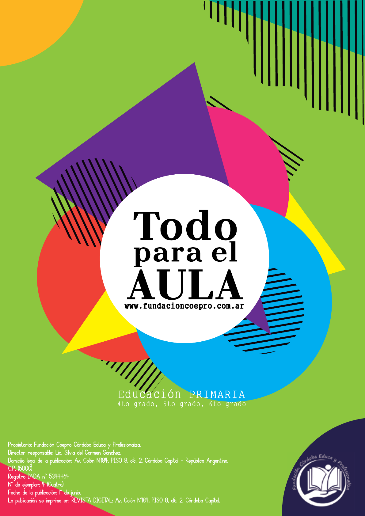 Año 3. N˚4. Junio- 2.018 Propietario: Fundación Coepro Córdoba Educa y Profesionaliza. Director responsable: Lic. Silvia del Carmen Sanchez. Domicilio legal de la publicación: Av. Colón N°184, PISO 8, ofc. 2, Córdoba Capital - República Argentina. C.P. (5000) Registro DNDA n° 5344464 N° de ejemplar: 4 (Cuatro) Fecha de la publicación: 1° de junio. La publicación se imprime en: REVISTA DIGITAL: Av. Colón N°184, PISO 8, ofc. 2, Córdoba Capital. Contenidos Contenidos con Planificaciones Taller de lecto-escritura Geometría: los ángulos Lengua: los conectores Cómo relacionamos Cs. Sociales con otras áreas de conocimiento Junio: Mes de la Educación Víal ESI Día Mundial del Medio Ambiente Día de la Bandera: palabras para el acto El Mundial de Fútbol Rusia 2018 Jornada Extendida Apartado con Planificaciones Página 3 7 10 11 13 16 17 18 20 21 24 26 ADELANTOS DEL PRÓXIMO NÚMERO • Fracciones. • Espacios geográficos. • Taller de lecto-escritura. • 9 de julio. • Evaluaciones medias. • Día del amigo. • ¿Qué sucedió entre 1810 y 1816? • Jornada Extendida • Educación Tecnológica. Este mes queremos ofrecerles una revista actual sin dejar de lado los proyectos anuales que les venimos entregando, el acto del 20 de junio y las Planificaciones mensuales con los contenidos que sugieren los NAP. También llevamos a las aulas el Mundial de Fútbol, muy positivo para trabajar diferentes contenidos y garantizar la atención de nuestros niños. Reflexionamos sobre el Día del Medio Ambiente y, por supuesto todo lo que ustedes están acostumbrados a recibir, calendario mensual, efemérides, situaciones de enseñanza-aprendizaje, siempre promoviendo el diálogo, la pregunta, la reflexión compartida, el aprendizaje en colaboración y privilegiando el enriquecimiento que produce el hecho de estar con otros, de “aprender con”, de escuchar al otro, de respetar opiniones diferentes, etc. Esperamos que todo este material les resulte útil y que puedan aprovecharlo al máximo, les deseamos un muy buen mes de junio y les agradecemos que una vez más nos hayan elegido. ¡Hasta el próximo mes! EDITORIAL SUMARIO 1 2 WWW.FUNDACIONCOEPRO.COM.AR FUNDACIONCOEPRO http://www.fundacioncoepro.com.ar/ https://www.facebook.com/FundacionCOEPRO/ CUARTO GRADO MES DE JUNIO QUINTO GRADO MES DE JUNIO CONTENIDOS MENSUALES DE PLANIFICACIONES 3 4 CAMPOS DE APRENDIZAJE CONTENIDOS FUNDAMENTALES Lengua Escucha comprensiva y de descripciones de objetos, animales, personas, escenas, paisajes, e identificación de organizadores estructurales: tema (lo que se describe), sus partes (aspectos a describir), sus características distintivas Producción de descripciones de objetos, animales, personas, escenas, paisajes, con progresiva organización de los componentes de la descripción e incorporación de algunos procedimientos y recursos descriptivos. Participación en situaciones- colectivas e individuales- de escritura de textos no ficcionales, de extensión y complejidad creciente, con un propósito comunicativo determinado y atendiendo a parámetros de la situación comunicativa: - descripciones en las que se respete un orden de presentación y se utilice un campo léxico adecuado para designar procesos, partes, forma, color, tamaño. Reflexión acerca del uso, en las descripciones: - de campo léxico adecuado para designar procesos, partes, forma, color, tamaño y otras propiedades: sustantivos y adjetivos calificativos - de palabras que van marcando progresión y orden de presentación de la información: conectores aditivos y de proceso de uso más frecuente. Matemática Reconocimiento y uso de la suma y resta con números naturales y racionales en diferentes problemas que le dan sentido a esa operación (incluida la composición de dos transformaciones de la cantidad de elementos de una colección). Geometría Reconocimiento y uso de las propiedades de círculos y circunferencias, a partir del copiado, construcción o comunicación de figuras planas. Exploración de propiedades relativas a los lados de los triángulos (la longitud de cada lado es menor que la suma de las longitudes de los otros dos), a partir de la construcción de los triángulos y el análisis de la posibilidad o no de la construcción. Ciencias Sociales Conocimiento de la distribución de la población de la provincia de Córdoba y su relación con el marco natural y las actividades económicas Reconocimiento de las principales motivaciones que impulsaron a los europeos, desde el siglo XV, a explorar y conquistar el continente americano. Ciencias Naturales Diferenciación de materiales naturales y manufacturados o industrializados. Reconocimiento de cómo las diferentes propiedades que tienen los materiales condicionan su uso. Enunciación de algunas características macroscópicas que distinguen a los estados sólido, líquido y gaseoso. CAMPOS DE APRENDIZAJE CONTENIDOS FUNDAMENTALES Lengua Escucha comprensiva y de descripciones de objetos, animales, personas, escenas, paisajes, e identificación de organizadores estructurales: tema (lo que se describe), sus partes (aspectos a describir), sus características distintivas Producción de descripciones de objetos, animales, personas, escenas, paisajes, procesos, con progresiva organización de los componentes de la descripción e incorporación de algunos procedimientos y recursos descriptivos. Participación en situaciones- colectivas e individuales- de escritura de textos no ficcionales, de extensión y complejidad creciente, con un propósito comunicativo determinado y atendiendo a parámetros de la situación comunicativa: - descripciones en las que se respete un orden de presentación y se utilice un campo léxico adecuado para designar procesos, partes, forma, color, tamaño. Reflexión acerca del uso, en las descripciones: - de campo léxico adecuado para designar procesos, partes, forma, color, tamaño y otras propiedades: sustantivos y adjetivos calificativos - d