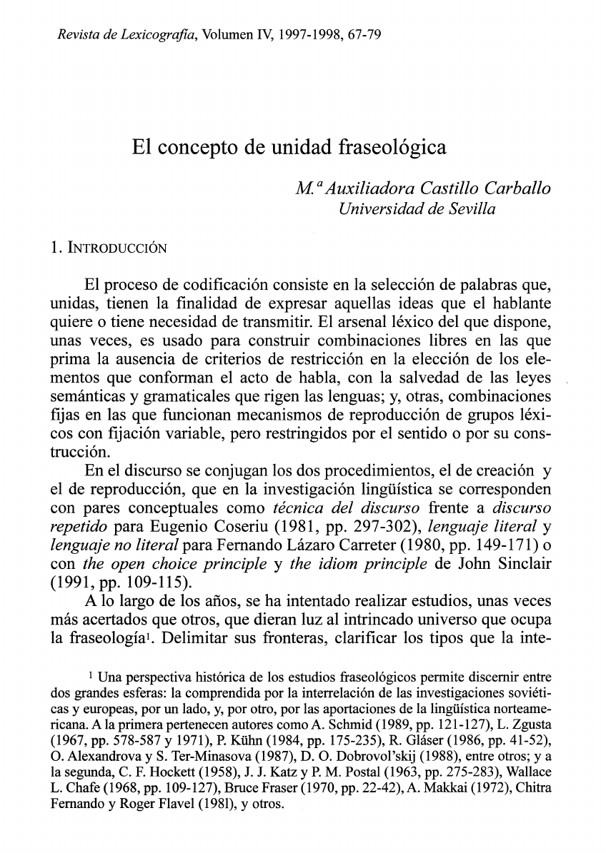 Revista de Lexicografia, Volumen IV, 1997-1998, 67-79 El concepto de unidad fraseológica M a Auxiliadora Castillo Carballo Universidad de Sevilla 1. INTRODUCCIÓN El proceso de codificación consiste en la selección de palabras que, unidas, tienen la finalidad de expresar aquellas ideas que el hablante quiere o tiene necesidad de transmitir. El arsenal léxico del que dispone, unas veces, es usado para construir combinaciones libres en las que prima la ausencia de criterios de restricción en la elección de los ele- mentos que conforman el acto de habla, con la salvedad de las leyes , semánticas y gramaticales que rigen las lenguas; y, otras, combinaciones fijas en las que funcionan mecanismos de reproducción de grupos léxi- cos con fijación variable, pero restringidos por el sentido o por su cons- trucción. En el discurso se conjugan los dos procedimientos, el de creación y el de reproducción, que en la investigación lingüística se corresponden con pares conceptuales como técnica del discurso frente a discurso repetido para Eugenio Coseriu (1981, pp. 297-302), lenguaje literal y lenguaje no literal para Fernando Lázaro Carreter (1980, pp. 149-171) o con the open choice principIe y the idiom principIe de John Sinclair (1991, pp. 109-115). A lo largo de los años, se ha intentado realizar estudios, unas veces más acertados que otros, que dieran luz al intrincado universo que ocupa la fraseología1• Delimitar sus fronteras, clarificar los tipos que la inte- 1 Una perspectiva histórica de los estudios fraseológicos permite discernir entre dos grandes esferas: la comprendida por la interrelación de las investigaciones soviéti- cas y europeas, por un lado, y, por otro, por las aportaciones de la lingüística norteame- ricana. A la primera pertenecen autores como A. Schmid (1989, pp. 121-127), L. Zgusta (1967, pp. 578-587 y 1971), P. Kühn (1984, pp. 175-235), R. Gláser (1986, pp. 41-52), O. Alexandrova y S. Ter-Minasova (1987), D. O. Dobrovol'skij (1988), entre otros; y a la segunda, C. F. Hockett (1958), J. J. Katz y P. M. Postal (1963, pp. 275-283), Wallace L. Chafe (1968, pp. 109-127), Broce Fraser (1970, pp. 22-42), A. Makkai (1972), Chitra Fernando y Roger Flavel (1981), Yotros. 68 M a Auxiliadora Castillo Carballo gran, y dar definiciones precisas que carecieran de cualquier ambigüedad han sido objetivos que muchas veces no se han podido cumplir. Tal vez sea el reciente auge de esta disciplina lo que explique que su investiga- ción, hasta hace muy pocos años, se encontrara en los albores; lo que ha dado lugar a una gran variedad terminológica, referida tanto al vocablo genera12 que debe abarcar estos hechos lingüísticos como a las distintas denominaciones de cada uno de los fenómenos individuales. Incluso, esto ha trascendido a la considerable diversidad de clasificaciones desde diversos puntos de vista. Sin embargo, desde el principio ha existido un consenso para nombrar a la disciplina, constituida como tal en los años cuarenta por los lingüistas soviéticos, que engloba el estudio de las com- binaciones de palabras con el término fraseología. 2. LA UNIDAD FRASEOLÓGICA y EL DICCIONARIO El constante descuido en los estudios lexicológicos de los aspectos fraseológicos ha influido inevitablemente en la práctica lexicográfica. Así pues, los diccionarios han acogido, entre sus artículos, las combina- ciones de palabras con cierta fijación de modo bastante irregular, recu- rriendo, en muchos casos, a etiquetados pocos exhaustivos y vacilantes. Julio Femández-Sevilla señaló, por su parte, la necesidad de elabo- rar diccionarios que dieran cabida a unidades más amplias que la pala- bra3• Igualmente, aseguró que estas no deben ser inventariadas en reper- 2 En la filología española se barajan nombres como los de unidad fraseológica, expresión pluriverbal, unidad pluriverbal lexicalizada y habitualizada, unidad léxica pluriverbal, expresión fija o fraseologismo. No creo que sea de extrema importancia la elección de uno frente a los demás, pues, aunque es cierto que algunos de ellos parecen ser más apropiados que otros -bien porque han sido utilizados, a su vez, como subtipos dentro del conjunto, o porque su denominación tan solo señala una caracterís- tica de tales combinaciones-, 10 verdaderamente relevante es que su utilización tenga presente y claros los límites de esta parcela lexicológica denominada fraseología. No obstante, prefiero la denominación de unidad pluriverbal, seguida de la de unidad fraseo lógica, aunque esta tiene últimamente una mayor difusión, sobre todo en Europa, debido a los fraseólogos soviéticos. 3 Para referirse a estas unidades utiliza el término lexía, que reconoce haber toma- do de Pottier, pero subraya que con el sentido de "secuencia estable y fija de unidades léxicas y/o gramaticales, funcionalmente equivalente a una palabra que la lengua no posee o el habla no actualiza" equivalente a lo. que tradicionalmente se ha llamado locu- ción. Vid. Julio Femández-Sevilla (1974), p. 21. El concepto de unidadfraseológica 69 torios independientes, ni incluidas al final del artículo de diccionario, pues si se parte. de la base de que la lexía es funcionalmente una palabra, esta debe 'tener el mismo estatus que el resto de las entradas, con igual independencia, y ocupando el lugar que le corresponda de acuerdo con la naturaleza del repertorio en el que se incluya. Además, puntualizó que no "importará que la ortografía normativa preceptúe representar gráfica- mente estas unidades de manera discontinua, con espacios blancos entre los elementos componentes" (Femández-Sevilla, 1974, p. 22). Sin embargo, ante estas clarividentes palabras, resulta incomprensi- ble que se plantee que esta determinación ocasionará al lexicógrafo algu- nos problemas, pensando que no siempre le será fácil saber cuál es el lugar que la lexía debe ocupar en los diccionarios, independientemente de que el criterio