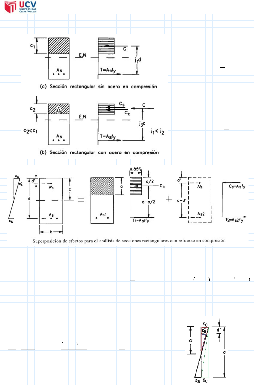 CONCRETO ARMADO I SESION 5 2022-1 16-09-22 ANALISIS DE ELEMENTOS DE SECCION RECTANGULAR CON REFUERZO EN COMPRESION SOMETIDOS A FLEXION =a ―――― ⋅As fy ⋅⋅0.85 f'c b =Mn ⋅⋅As fy ⎛ ⎜ ⎝ -d ― a 2 ⎞ ⎟ ⎠ =a ―――― ⋅As1 fy ⋅⋅0.85 f'c b =Mn1 ⋅⋅As1 fy ⎛ ⎜ ⎝ -d ― a 2 ⎞ ⎟ ⎠ =As1 -As As2 =a ――――― ⋅⎛⎝ -As As2⎞⎠ fy ⋅⋅0.85 f'c b ≔εc 0.003 ≔Es ⋅2039000 ―― kgf cm 2 =Mn1 ⋅⋅⎛⎝ -As As2⎞⎠ fy ⎛ ⎜ ⎝ -d ― a 2 ⎞ ⎟ ⎠ ==Mn2 ⋅⋅As2 fy (( -d d')) ⋅⋅A's fy (( -d d')) =Mn +Mn1 Mn2 Por semejanza de triángulos conformados en el diagrama de deformaciones se tiene: =― c d ――― εc +εc εs =c ⋅ ⎛ ⎜ ⎝ ――― εc +εc εs ⎞ ⎟ ⎠ d =― ε's εc ―― -c d' c =ε's ―――― ⋅(( -c d')) εc c =ε's ⋅ ⎛ ⎜ ⎝ -1 ― d' c ⎞ ⎟ ⎠ εc =a ⋅β1 c =c ― a β1 =ε's ⋅ ⎛ ⎜ ⎝ -1 ―― ⋅β1 d' a ⎞ ⎟ ⎠ εc =f's ⋅⋅ ⎛ ⎜ ⎝ -1 ―――― ⋅⎛⎝ +εc εs⎞⎠ d' ⋅εc d ⎞ ⎟ ⎠ εc Es =f's ⋅⋅ ⎛ ⎜ ⎝ -1 ―― ⋅β1 d' a ⎞ ⎟ ⎠ εc Es Ing. Marco Muñiz CONCRETO ARMADO I SESION 5 2022-1 16-09-22 =f's ⋅Es ε's =f's ⋅⋅ ⎛ ⎜ ⎝ -1 ― d' c ⎞ ⎟ ⎠ εc Es =f's ⋅⋅ ⎛ ⎜ ⎝ -1 ―――― ⋅⎛⎝ +εc εs⎞⎠ d' ⋅εc d ⎞ ⎟ ⎠ εc Es =f's ⋅⋅ ⎛ ⎜ ⎝ -1 ―― ⋅β1 d' a ⎞ ⎟ ⎠ εc Es Determinación de la cuantía básica o balanceada :⎛⎝ρbtc⎞⎠ Equilibrio de fuerzas en el estado 1: =Cc T1 ==Cc ⋅⋅⋅0.85 f'c ab b ⋅⋅⋅0.85 f'c ⎛⎝ ⋅β1 cb⎞⎠ b =T1 ⋅As1 fy =cb ⋅ ⎛ ⎜ ⎝ ――― εc +εc εy ⎞ ⎟ ⎠ d =ρb ―― As1 ⋅b d —> =As1 ⋅⋅ρb b d =Cc ⋅⋅⋅⋅0.85 f'c β1 ⎛ ⎜ ⎝ ⋅――― εc +εc εy d ⎞ ⎟ ⎠ b =T1 ⋅⎛⎝ ⋅⋅ρb b d⎞⎠ fy =⋅⋅⋅⋅0.85 f'c β1 ⎛ ⎜ ⎝ ⋅――― εc +εc εy d ⎞ ⎟ ⎠ b ⋅⎛⎝ ⋅⋅ρb b d⎞⎠ fy Cuantía balanceada del estado 1: =ρb ⋅―――― ⋅⋅0.85 f'c β1 fy ⎛ ⎜ ⎝ ――― εc +εc εy ⎞ ⎟ ⎠ Equilibrio de fuerzas superpuestas: estado 1 + estado 2 =+T1 T2 +Cc Cs =+⋅As1 fy ⋅As2 fy ⋅⎛⎝ +As1 As2⎞⎠ fy =As +As1 As2 =+T1 T2 ⋅As fy =+Cc Cs +⋅⎛⎝ ⋅⋅ρb b d⎞⎠ fy ⋅A's f's =⋅As fy +⋅⋅⋅ρb b d fy ⋅A's f's =――― ⋅As fy ⋅⋅b d fy +―――― ⋅⋅⋅ρb b d fy ⋅⋅b d fy ――― ⋅A's f's ⋅⋅b d fy =―― As ⋅b d +ρb ⋅―― A's ⋅b d ― f's fy =ρ' ―― A's ⋅b d Cuantía de refuerzo por compresión: =ρbtc +ρb ⋅ρ' ― f's fy Cuantía balanceada de una sección con refuerzo en tracción y compresión: Determinación de la cuantía maxima con acero en compresion :⎛⎝ρmax⎞⎠ Equilibrio de fuerzas en condicion 1: Seccion con refuerzo maximo unicamente en traccion =Cc T =⋅⋅⋅0.85 f'c at b ⋅⋅⋅ρt b d fy =⋅⋅⋅0.85 f'c ⎛⎝ ⋅β1 cb⎞⎠ b ⋅⋅⋅ρt b d fy Equilibrio de fuerzas en condicion 2: Seccion con refuerzo en compresion =T +Cc Cs =⋅As fy +⋅⋅⋅ρt b d fy ⋅A's f'sIng. Marco Muñiz CONCRETO ARMADO I SESION 5 2022-1 16-09-22=T +Cc Cs =⋅As fy +⋅⋅⋅ρt b d fy ⋅A's f's Cuantia de refuerzo en compresion ρ' =ρ' ―― A's ⋅b d =⋅⋅⋅ρ b d fy +⋅⋅⋅ρt b d fy ⋅⋅⋅ρ' b d f's Finalmente: =ρmax +ρt ⋅ρ' ― f's fy (ACI 2014)=≤ρ ρmax +⋅――― ⋅0.85 f'c fy ⎛ ⎜ ⎝ ――――― ⋅0.003 β1 +0.003 0.005 ⎞ ⎟ ⎠ ⋅ρ' ― f's fy (E-060)=≤ρ ρmax +0.75 ρb ⋅ρ' ― f's fy ANALISIS DE ELEMENTOS DE SECCION T SOMETIDOS A FLEXION Ing. Marco Muñiz CONCRETO ARMADO I SESION 5 2022-1 16-09-22 =Cf Tf =Cw Tw =⋅Asf fy ⋅⋅⋅0.85 f'c ⎛⎝ -bf bw⎞⎠ hf =⋅Asw fy ⋅⋅⋅0.85 f'c bw a =Asf ⋅⋅⋅0.85 ― f'c fy ⎛⎝ -bf bw⎞⎠ hf =a ―――― ⋅Asw fy ⋅⋅0.85 f'c bw =Mnf ⋅⋅⋅⋅0.85 f'c ⎛⎝ -bf bw⎞⎠ hf ⎛ ⎜ ⎝ -d ― hf 2 ⎞ ⎟ ⎠ =Mnw ⋅⋅⋅⋅0.85 f'c bw a ⎛ ⎜ ⎝ -d ― a 2 ⎞ ⎟ ⎠ Finalmente =Mn +Mnf Mnw =Mn ⋅⋅0.85 f'c ⎛ ⎜ ⎝ +⋅⋅⎛⎝ -bf bw⎞⎠ hf ⎛ ⎜ ⎝ -d ― hf 2 ⎞ ⎟ ⎠ ⋅⋅bw a ⎛ ⎜ ⎝ -d ― a 2 ⎞ ⎟ ⎠ ⎞ ⎟ ⎠ Considerar que: =As +Asf Asw =Asw -As Asf Con lo que: =a ――――― ⋅⎛⎝ -As Asf⎞⎠ fy ⋅⋅0.85 f'c bw Ing. Marco Muñiz CONCRETO ARMADO I SESION 5 2022-1 16-09-22=As +Asf Asw =Asw -As Asf Con lo que: =a ――――― ⋅⎛⎝ -As Asf⎞⎠ fy ⋅⋅0.85 f'c bw Cuantía máxima de una sección T ==Cc Ts ⋅Asmax fy =+Ccf Ccw +Tsf Tsw ==Cc +Ccf Ccw +⋅⋅⋅0.85 f'c ⎛⎝ -bf bw⎞⎠ hf ⋅⋅0.85 f'c ⎛⎝ ⋅at bw⎞⎠ Utilizando la deformación unitaria del acero ≔εy 0.005 ——> =Asmax Ast ∴ =Ts ⋅Ast fy como: =Cc Ts =+⋅⋅⋅0.85 f'c ⎛⎝ -bf bw⎞⎠ hf ⋅⋅0.85 f'c ⎛⎝ ⋅at bw⎞⎠ ⋅Ast fy de donde: =Ast ―――――――――― ⋅⋅0.85 f'c ⎛⎝ +⋅at bw ⋅⎛⎝ -bf bw⎞⎠ hf⎞⎠ fy Finalmente la cuantia maxima de la seccion T es: ==ρst ―― Ast ⋅b d ―――――――――― ⋅⋅0.85 f'c ⎛⎝ +⋅at bw ⋅⎛⎝ -bf bw⎞⎠ hf⎞⎠ ⋅⋅fy b d =at ⋅⋅β1 ⎛ ⎜ ⎝ ―――― εc +εc 0.005 ⎞ ⎟ ⎠ d Cuantía mínima de una sección T Las ecuaciones respecto al área mínima de refuerzo en secciones rectangulares son válidas también para secciones T con el ala en compresión. Para secciones T con el ala en tracción, el área mínima de acero será la menor determinada a través de las siguiente expresión considerando igual al ancho del ala de la viga T o , el bw b ⋅2 bw que sea menor. ≤=Asmin ⋅⋅max ⎛ ⎜ ⎜⎝ ,⋅0.8 ―― ‾‾f'c fy ― 14 fy ⎞ ⎟ ⎟⎠ bf d ⋅⋅⋅1.6 ―― ‾‾f'c fy bw d Diseño de una sección T Se asume inicialmente, que sólo el ala de la sección contribuyen a la resistencia y se tiene: =As ―――― ―― Mu ϕ ⋅fy ⎛ ⎜ ⎝ -d ― hf 2 ⎞ ⎟ ⎠ =a ―――― ⋅As fy ⋅⋅0.85 f'c b Si el valor estimado de a es menor o igual que h, entonces e
