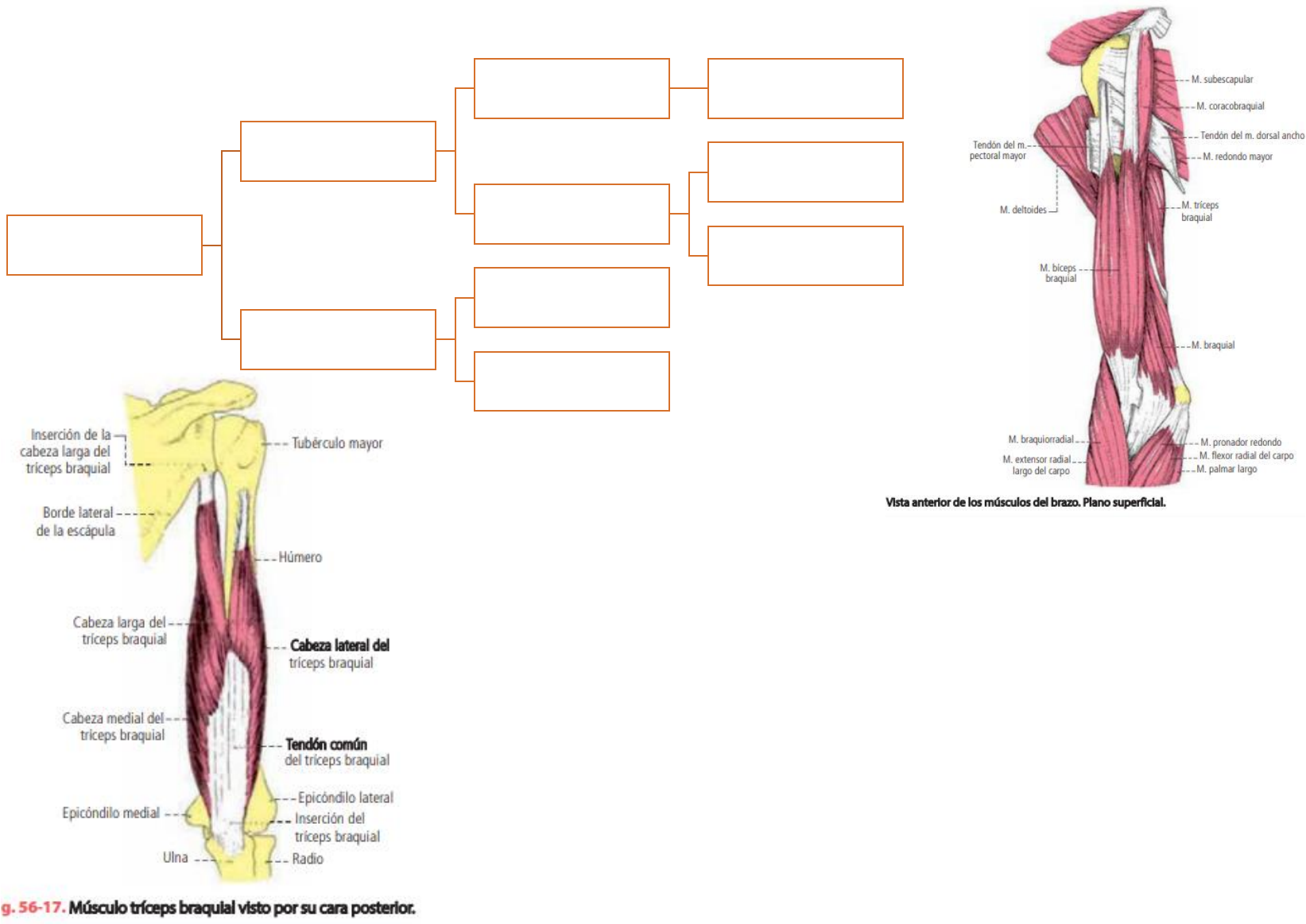 Músculos del brazo Región Anterior Plano Superficial M. Bíceps braquial Plano Profundo M. Coracobraqueal M. Braquial anterior Región Posterior M. Tríceps braquial M. Ancóneo M. Bíceps braquial (Se extiende desde el omoplato al antebrazo) Porción larga o lateral Origen Borde sup. de la cavidad glenoidea (Tuberculo supraglenoideo) Porción corta o medial Origen: Vertice de la apof. coracoides escapula por el tendón común con el coracobraquial. Insercción de ambas porciones: Se reúnen en un tendón común que se inserta en la tuberosidad bicipital del radio y la parte interna del tendón con la aponeurosis bicipital Relaciones Parte superior Cabeza larga rodeada por el manguito sinovial en surco intertubercular Cabeza Corta forma parte de la pared lateral de la fosa axilar Parte media Borde Medial: Paquete vasculonervioso (art. braqueal, v. braquial y n. mediano) Cara sup: subcutanea y Cara post: sobre m. braquial Parte inferior El tendón llega a la c. ant de la art del codo muy superfcial, se hace profundo en la tuberosidad del radio Surco bicipital medial (v basílica) y lateral (v. cefalica) Inervación (n. musculocutáneo) Irrigación (ramas art. braquial) Acción (Flexiona y supina el antebrazo a nivel del codo) M. Coracobraquial Dentro de la porción corta del bíceps Desciende de la apófisis coracoides a la cara interna del humero Origen Vertice de la apof coracoides por medio del tendón que le es común con la porción corta del bíceps Insercción Túberculo coracobraquial (1/3 medio de la cara int. del húmero) Relaciones Delante: deltoides y el pectoral mayor Detrás: tendones del subescapular, el dorsal ancho y el redondo mayor Fuera: porción corta del bíceps Dentro: paquete neurovascular de la axila y el brazo Irrigación (ramas de la art braquial) Inervación (n. musculocutáneo) Acción (Flexiona y aduce el brazo) M. Braquial anterior Parte anterior e inferior del humero, por debajo del musculo bíceps Origen Labio inferior de la tuberosidad deltoidea En las C. anterolateral y anteromedial de la diafisis humeral, en su mitad inferior En los dos tabiques medial y lateral que los separan del tríceps Insercción Fibras tendinosas sobre el vertice apof coronoides y algunos fasciculos musculares en la ulna Relación A nivel, mitad inf brazo C. ant: con el bíceps braquial C. post: humero y los tabiques intermusculares. B. int: paquete vasculonervioso braquial. A nivel del codo Separado de la superficie por el tendón de insercción del bíceps. A ambos lados, los m, epicondileos mediales y laterales Sobre el se aplican los surcos bicipitales C. profunda, capsula articular y ligamentos ant de la art del codo Inervación (n. musculocutáneo) Irrigación (ramas de art. braquial y art. recurrente radial) Acción (Flexiona antebrazo en todas las posiciones) M . T rí ce p s b ra q u ia l Porción o Cabeza larga Origen: Tubérculo infraflenoideo escapula Cabeza medial o Vasto Interno C. post del humero, lim inferior del surco del n. radial y tabique intermuscular medial Cabeza lateral o Vasto externo C. post humero,lim superior del surco del n. radial y tabique intermuscular lateral Insercción de las 3 porciones forma un tendón C. post del oléacranon del cubito y bordes laterales Relación Parte sup Espacio axilar medial (triangulo omotricipital) Cabeza larga del tríceps, m. redondo menor y mayor Espacio axilar inferior (cuadrilatero humerotricipital) M. redondo mayor y dorsal ancho. Cabeza larga del tríceps y Humero Espacio axilar inferior (triangulo humeroocipital) Parte media Tabique aponeurótico intermuscular medial (anterior y medial, pasa el N. cubital) Tabique intermuscular lateral (lo separa del músculo braquial) Parte inf Cubre la cara posterior de la articulación del codo. m. anconeo (lateral) y surco del n. cubital (medial) Irrigación (art cincunfleja humeral posterior y art braquial profunda) Inervación (n. radial) Acción (principal extensor del antebrazo) M. Ancóneo (Se lo describe en el compartimiento posterior del antebrazo) Origen Parte post Epicóndilo lateral del humero Inserción En la ulna (cúbito) distal al olécranon. Inervación N. radial Irrigación Art. braquial profunda Acción Ayuda al triceps braquial en la extensión del antebrazo, estabiliza la articulación del codo.