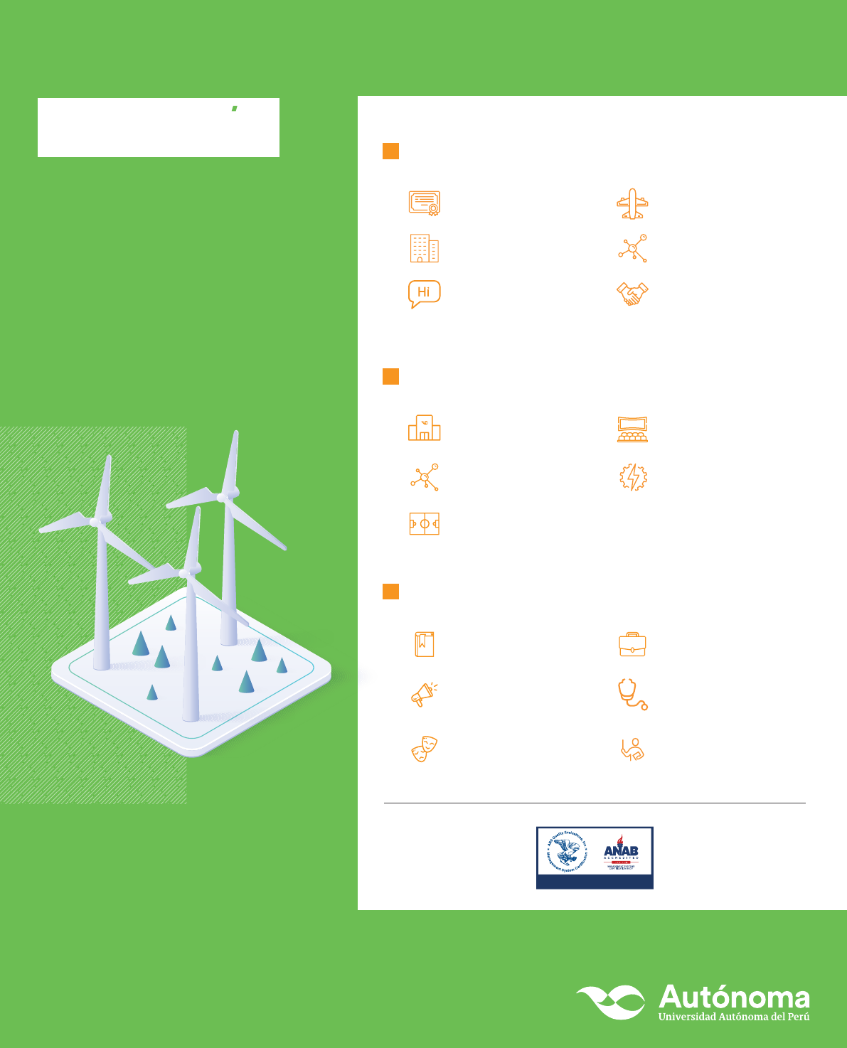 ISO 9001 : 2015 BENEFICIOS DE LA CARRERAINGENIERIA AMBI ENTAL Movilidad académica internacional Certi�caciones progresivas Laboratorios especializados Convenios empresariales Plan de estudios competitivo SERVICIOS UNIVERSITARIOS Centro de información O�cina de oportunidades laborales Atención psicológica y médica Centro de investigación e innovación Talleres artísticos y deportivos Eventos sociales y culturales Plana docente cali�cada INFRAESTRUCTURA 81, 000 m2 Auditorio +500 personas Instalaciones deportivas Laboratorios y talleres Inglés como parte de la malla curricular MALLA CURRICULAR FORMACIÓN ACADÉMICA GRADO CERTIFICACIONES PROGRESIVAS CI CLO CI CLO CI CLO CI CLO CI CLO CI CLO CI CLO CI CLO CI CLO CI CLO Formación Humana Formación Ingenieril Formación en Plani�cación Territorial Formación en Tecnologías para la sostenibilidad Formación en Gestión Ambiental Investigación Extraacadémicos Bachiller en Ingeniería Ambiental TÍTULO Ingeniero Ambiental Monitoreo Ambiental (Al terminar el Ciclo IV) Tratamiento de contaminantes en emisiones y e�uentes (Al terminar el Ciclo VII) Gestión Ambiental y Social (Al terminar el Ciclo VIII) Pensamiento Digital* Desarrollo Socioemocional* Procesos de la Comunicación I* Introducción a la Ingeniería Ambiental* Química I** Gestión Matemática de la Información** Procesos de la Comunicación II** Biología Celular* Matemática I** Química II* Gestión Estadística de la Información I** Ciudadanía Digital** Física* Matemática II** Química Ambiental* Herramientas para la Empleabilidad I (Habilidades Digitales) Gestión Estadística de la Información II** Fisicoquímica Ambiental* Ecología y Recursos Naturales* Matemática III** Cartografía y Sistemas de Información Geográ�ca* Inglés I Pensamiento Crítico** Mecánica de Fluidos* Microbiología Ambiental** Climatología y Metereología* Gestión de Proyectos* Herramientas para la Empleabilidad II (Curso a elección) Desarrollo Sustentable y Sostenible** Geomorfología y Edafología* Ingeniería Sostenible I* Micro y Macroeconomía* Derecho Ambiental* Inglés II Ingeniería Sostenible II* Hidrografía e Hidrología* Tratamiento de Contaminación de Suelos* Plani�cación Territorial* Metodología de Investigación Cientí�ca** Herramientas para la Empleabilidad III (Curso a elección) Sistemas de Gestión Ambiental* Tratamiento de Contaminación de Agua* Tratamiento de Contaminación de Aire* Gestión de Residuos Sólidos* Trabajo de Investigación* Práctica Pre Profesional* Gestión Social y Gobernanza* Sistemas Integrados de Gestión* Proyecto de Tesis** Electivo I* Desarrollo de Tesis** Toxicología y Salud Pública* Estudios de Impacto Ambiental y Social* Electivo II* Electivo III* 942 569 424 T. 01 715 3333 / 01 500 1800 E. informes@autonoma.pe Panamericana Sur Km. 16.3 - Villa El Salvador www.autonoma.pe MODALIDAD *Curso Presencial **Curso Semipresencial La Universidad Autónoma del Perú, se reserva la atribución de realizar cambios que mejoren esta malla curricular en función de los avances tecnológicos, tendencias del sector y mercado laboral. Como parte de su formación profesional, los estudiantes deberán acreditar cursos de Idiomas y Herramientas para la Empleabilidad: habilidades digitales y cursos a elección, los cuales serán presenciales o virtuales en los ciclos correspondientes de acuerdo a su plan de estudios. Podrán ser desarrollados en los centros especializados de la misma universidad o en instituciones externas (proceso de convalidación a excepción de los cursos alternativos). Nota: