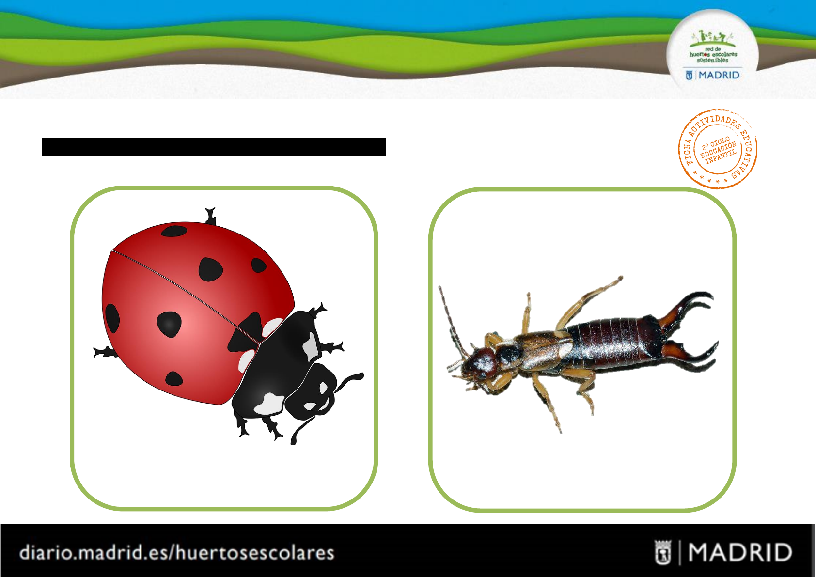 _Diferencias y similitudes animales del huerto. F I C H A : T A R J E T A S A N I M A L E S D E L H U E R T O TIJERETA MARIQUITA ABEJA ARAÑA ABEJORRO MARIPOSA ESCARABAJO SOLDADO MANTIS RELIGIOSA CRISOPA ESCARABAJO DEL SUELO MOSCA DE LAS FLORES LOMBRIZ PULGÓN SALTAMONTES CARACOL ORUGA HORMIGA _Diferencias y similitudes animales del huerto. 6 PATAS 6 8 PATAS 8 F I C H A : A T R I B U T O S A N I M A L E S D E L H U E R T O 6 OJOS 2 OJOS 8 OJOS TENGO CERCOS 2 ANTENAS 2 QUELÍCEROS 2 TENGO MANDÍBULA 4 TENTÁCULOS 1 PIE 4 ALAS 2 ALAS ALIMENTO PLANTAS ALIMENTO PULGONES ALIMENTO SEMILLAS ALIMENTO DE POLEN Y NÉCTAR ALIMENTO CARACOLES TENGO CONCHA- CAPARAZÓN VIVO DENTRO DE LA TIERRA VIVO ENCIMA DE LA TIERRA TENGO EL COLOR AMARILLO TENGO EL COLOR GRIS TENGO EL COLOR NEGRO TENGO EL COLOR BLANCO TENGO EL COLOR NARANJA TENGO EL COLOR ROJO TENGO EL COLOR VERDE TENGO EL COLOR ROSA EJEMPLO _Diferencias y similitudes animales del huerto. LÁMINAS DE APOYO F I C H A : L Á M I N A S D E A P O Y O MARIQUITA Soy un insecto y puedo comer más de 300 pulgones sobre todo cuando soy una larva. Mi color rojo avisa a mis depredadores de mi mal olor. PULGÓN Soy un insecto. Ataco a las plantas del huerto y jardín, chupando su savia. Soy el alimento de las mariquitas. HORMIGA Soy un insecto y el pastor de los pulgones, les defiendo de las mariquitas. Además me gusta llevar semillas a mi hormiguero y ayudando a la dispersión de estas. CRISOPA Soy un insecto, cuando soy una larva soy muy comilona. Me puedo comer más de 400 pulgones durante mi fase larvaria, aunque también me gustan las arañas rojas o los pequeños gusanos. Cuando soy larva me gusta jugar al camuflaje cubriendo mi cuerpo con los restos de otros insectos. Así no me encontrará ningún pájaro. Cuando soy adulto prefiero las flores, polen y néctar. Pongo mis huevos colgado de un hilo en las hojas. TIJERETA Soy un insecto, me alimento de pulgones y plantas. Me gusta vivir en macetas de barro rellenas de un hatillo de paja. Puedo volar aunque no suelo hacerlo, prefiero caminar. ABEJA SOCIAL Soy un insecto y me gusta coger el polen y néctar de las flores, con el néctar de las flores hacemos miel. Gracias a nosotras las flores se transforman en frutos como las calabazas o sandias, al llevar el polen de una flor a otra. Vivimos todas juntas en colmenas. ABEJA SOLITARIA Soy un insecto y me gusta coger el polen y néctar de las flores. Gracias a nosotras las flores se transforman en frutos como las calabazas o sandias, al llevar el polen de una flor a otra. No nos gusta vivir en colmenas, vivimos en cañas o agujeros en troncos. Seguramente cuando veas una abeja en tu huerto, seamos nosotras, somos mucho más numerosas que las abejas sociales. ABEJORRO Soy un insecto más grande que las abejas. Me gusta coger el polen y néctar de las flores. Llevamos el polen de una flor a otra, ayudando a que las flores se transformen en frutos como las calabazas o sandias. Puedo visitar más de 200 flores diarias. Vivimos en colmenas. Soy un insecto, me parezco a las abejas pero soy una mosca, fijaros en mis grandes ojos. Me gusta volar permanentemente inmóvil en el aire. Me gusta alimentarme de polen y néctar. Gracias a nosotras las flores se transforman en frutos como las calabazas o sandias.. Cuando soy una larva me alimento de pulgones. MOSCA DE LAS FLORES MARIPOSA Y ORUGAS Soy un insecto y cuando somos adultas nos alimentamos del néctar de las flores y llevamos el polen de unas flores a otras, ayudando a que las flores se transformen en frutos. Cuando soy una larva me alimento de hojas de plantas. CARACOL No soy un insecto, soy un molusco como el pulpo o el mejillón. Me encanta comer hojas de plantas. Soy el alimento de escarabajos, ciempiés o pájaros como el mirlo. ESCARABAJO DEL SUELO Soy un insecto y nos gusta comer insectos blandos como gusanos, orugas o babosas. Es difícil que nos veas por el huerto o jardín, nos gusta salir por la noche. ESCARABAJO SOLDADO Tenemos una dieta muy variada, comemos polen de flores y ayudamos a transformar las flores en frutos como la calabaza, llevando el polen de unas flores a otras. Pero también nos gusta comer caracoles, pequeñas babosas, gusanos y pulgones. LOMBRIZ No soy un insecto, no tengo 6 patas ni alas, me llaman anélido. Vivo debajo del suelo donde no paro de moverme, me alimento de materia orgánica en descomposición que hay en el suelo y mis excrementos son alimento para plantas. Tengo que tener cuidado con los mirlos, soy uno de sus alimentos preferidos. ARAÑA SALTADORA No soy un insecto, si cuentas mis patas tengo 8, soy un arácnido. Como una gran variedad de insectos. Soy capaz de saltar hasta 50 veces mi tamaño. SALTAMONTES Soy un insecto y me alimento principalmente de hierba, aunque puedo comer otras plantas. Soy el alimento de la mantis religiosa. MANTIS RELIGIOSA Soy un insecto. Soy una experta de la caza. Me quedo quieta esperando que algún insecto pase por delante de mí para darle caza, por ejemplo mosquitos, mariposas, polillas, saltamontes…