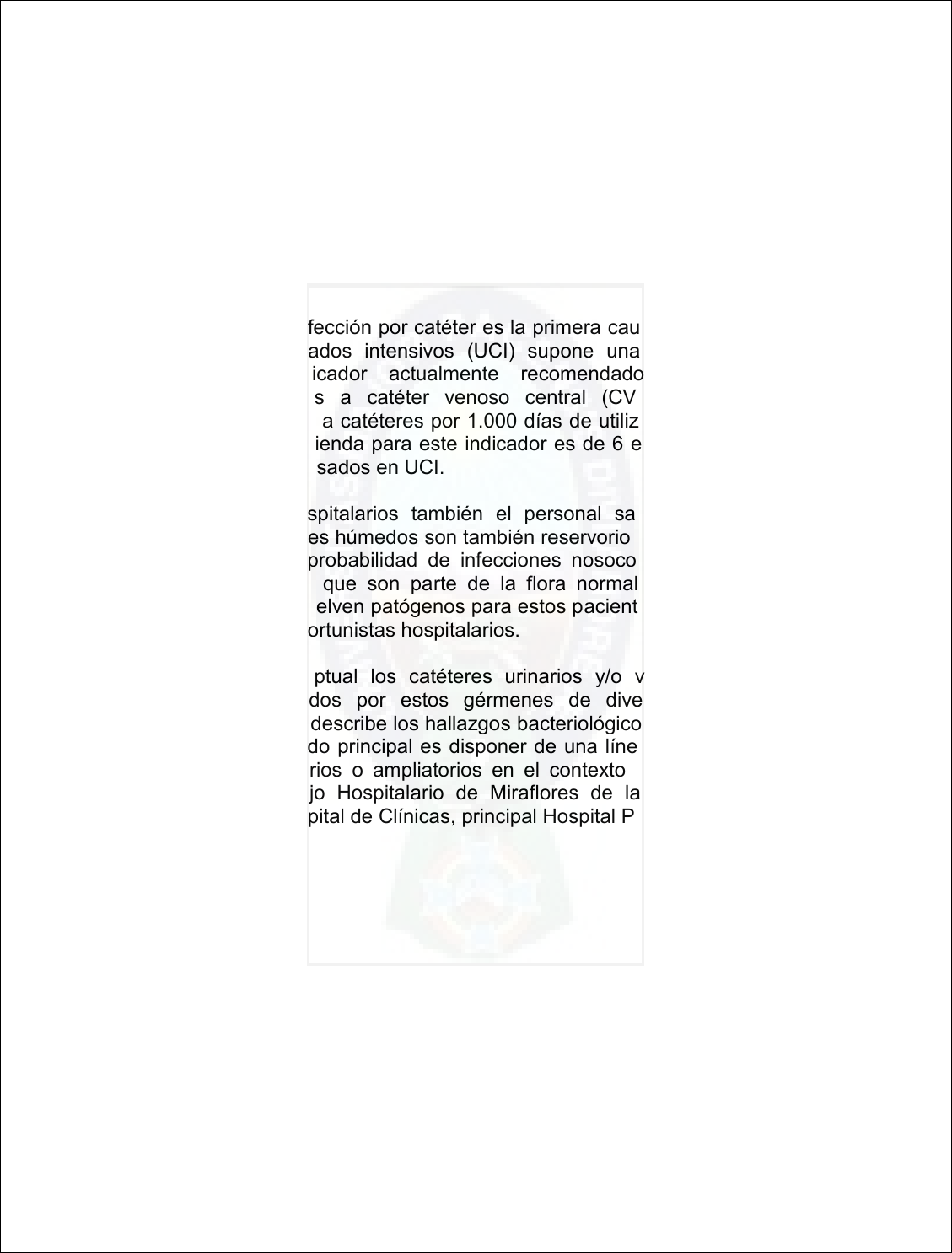 Frecuencia de patógenos…….…… Patricia Salazar Revollo 1 INTRODUCCION Las infecciones nosocomiales por contaminación de catéteres son un tema de actualidad. Los pacientes hospitalizados en salas generales, en salas de Emergencias o en las Unidades de Cuidados Intensivos suelen estar gravemente afectados por enfermedades de larga duración, como ser diabetes, insuficiencia renal crónica o un proceso infeccioso de evolución crónica. Todos estos procesos mórbidos disminuyen de manera significativa las defensas inmunológicas, es decir que son pacientes inmunocomprometidos. En los hospitales, la infección por catéter es la primera causa de bacteriemia y en las unidades de cuidados intensivos (UCI) supone una tercera parte de las bacteriemias. El indicador actualmente recomendado para estudiar las bacteriemias asociadas a catéter venoso central (CVC) es el número de bacteriemias asociadas a catéteres por 1.000 días de utilización de CVC. El valor estándar que se recomienda para este indicador es de 6 episodios/1.000 días de CVC en pacientes ingresados en UCI. En los ambientes hospitalarios también el personal sanitario es portador de gérmenes, los ambientes húmedos son también reservorio de otros gérmenes. Por tanto existe una alta probabilidad de infecciones nosocomiales por bacterias u otros microorganismos que son parte de la flora normal de la piel o del tubo gastrointestinal y se vuelven patógenos para estos pacientes debilitados y son los llamados gérmenes oportunistas hospitalarios. En este marco conceptual los catéteres urinarios y/o venosos pueden estar contaminados/colonizados por estos gérmenes de diversa procedencia La presente investigación describe los hallazgos bacteriológicos en el cultivo de estos catéteres y el significado principal es disponer de una línea de base para futuros estudios complementarios o ampliatorios en el contexto socioeconómico de los pacientes del Complejo Hospitalario de Miraflores de la ciudad de La Paz y especialmente del Hospital de Clínicas, principal Hospital Público de la misma. Frecuencia de patógenos…….…… Patricia Salazar Revollo 2 ANTECEDENTES DEL PROBLEMA DE INVESTIGACION El trabajo de investigación se efectuó en el Laboratorio de Bacteriología del Hospital de Clínicas. Este servicio hospitalario depende directamente de la Jefatura de Laboratorio Clínico, de la Dirección del Hospital y del Servicio Departamental de Salud (SEDES). El Laboratorio de Bacteriología es una unidad de referencia que presta cobertura a todos los servicios del Hospital de Clínicas, al Hospital de la Mujer, al Hospital del Niño y también recibe muestras del Instituto Nacional de Tórax. Por tanto el Laboratorio de Bacteriología del Hospital de Clínicas cuenta con personal capacitado, dispone de los implementos necesarios para los estudios bacteriológicos. Además es un servicio formador de recursos humanos. En este Laboratorio la autora de la tesis desempeñó funciones de entrenamiento en Bacteriología como parte de su formación profesional y con los datos de los cultivos de catéteres del año 2006 obtenidos de los registros del servicio, efectuó una pesquiza activa de los estudios durante 2007 y 2008. Estas funciones se desempeñaron bajo la supervisión del personal profesional del Laboratorio de Bacteriología. La propuesta del estudio fue encontrar el porcentaje de positividad de los cultivos bacterianos (frecuencia) asi como identificar los gérmenes bacterianos más frecuentes en los cultivos de catéteres urinarios y venosos, en el Hospital de Clínicas en un periodo de tres años 2006-2008. Estas actividades de cultivo de la punta de los catéteres, consistieron en aplicar con criterio riguroso la técnica estandarizada en el Laboratorio de Bacteriolología. No fue posible obtener referencias escritas de estudios similares en la ciudad de La Paz para establecer un contexto bibliográfico de los antecedentes de investigación. Por este motivo se recurrió a la herramienta metodológica de “Consulta a Expertos”. Por tanto se consultó la experiencia al respecto de profesionales en Microbiología y se llegó a la conclusión que en muchos hospitales existía el problema de infecciones a partir de catéteres contaminados y que se efectuaban pocos estudios bacteriológicos por que las solicitudes de estudio bacteriológico de catéteres no eran la regla. De estas consultas surgió la primera hipótesis de trabajo que fue plantear la probabilidad de una incidencia teórica aproximada de 5 muestras por mes para cultivo de catéteres que representan una cifra estimada anual de 60 estudios. Con este antecedente nos propusimos efectuar un estudio descriptivo sobre el número de catéteres contaminados por bacterías patógenas en el periodo 2006-2008. Como se mencionó anteriormente es posible que los resultados del presente trabajo observacional sirvan para formular una propuesta de investigación explicativa a mayor escala con el fin de conocer mejor el impacto de las infecciones nosocomiales por catéteres. Frecuencia de patógenos…….…… Patricia Salazar Revollo 3 Con relación al tema de infecciones nosocomiales se consultó un trabajo multicéntrico reciente efectuado en Unidades de Cuidados Intensivos de paises en desarrollo, la mayoría de ellos latinoamericanos, en el cual destaca la importancia de las definiciones (65). Se entiende por sepsis confirmada a cateter venoso central a aquella enfermedad con signos clínicos de sepsis pero ademas hemocultivo positivo para un gérmen patógeno en las 48 horas siguientes a la inserción del cateter. Se define como infección de tracto urinario asociada a sonda Foley a la presencia de fiebre, urgencia de miccionar, molestia suprapúbica y urocultivo positivo con 105 UFC/ml de orina. De esta manera las infecciones nosocomiales por cateter son definitivas si ademas de la contaminación del cateter el hemocultivo y/o urocultivo son positivos. Frecuen