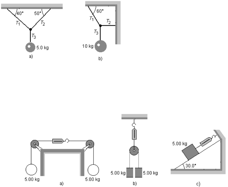 GUÍA FUERZA y TORQUE Nombre................................................................................................................Curso........... 1) Las fuerzas, F1 = (-2.00i + 2.00j) N, F2 = (5.00i – 3.00j) N, F3 = (-45.0i) N, se aplican sobre un objeto para producir una aceleración de magnitud 3.75 m/s2. a) ¿Cuál es la dirección de la aceleración? b) ¿Cuál es la masa del objeto? c) Si el objeto inicialmente está en reposo, ¿cuál es su rapidez después de 10.0 s? d) ¿Cuáles son las componentes de velocidad del objeto después de 10.0 s? 2) Un tren de carga tiene una masa de 1.5 x 107 kg. Si la locomotora puede ejercer un tirón constante de 7.5 x 105 N: a) ¿cuánto tarda en aumentar la velocidad del tren del reposo hasta 80 km/h? 3) Un objeto de 4.0 kg tiene una velocidad de 3.0i m/s en un instante. Ocho segundos después su velocidad es (8.0i + 10.0j) m/s. Si se supone que el objeto se sometió a una fuerza neta constante, encuentre: a) Las componentes de la fuerza. b) Su magnitud. 4) Encuentre la tensión en cada cuerda, para los sistemas mostrados en la figura. (Ignore la masa de las cuerdas.) 5) Los sistemas mostrados en la figura siguiente están en equilibrio. Si las balanzas de resorte(Newtómetro) están calibradas en newton (ignore la masa de poleas y cuerdas; y suponga que el plano inclinado es sin fricción): a) ¿Qué lectura indican en cada caso? 6) Un bloque de masa m = 2.0 kg se mantiene en equilibrio sobre un plano inclinado de ángulo = 60° mediante una fuerza horizontal F, como se muestra en la figura siguiente. a) Determine el valor de F, la magnitud de F. b) Encuentre la fuerza normal ejercida por el plano inclinado sobre el bloque. (Ignore la fricción.) 7) En el sistema que se muestra en la figura , una fuerza horizontal Fx se aplica sobre una masa de 8.00 kg. a) ¿Para cuáles valores de Fx la masa de 2.00 kg acelera hacia arriba? b) ¿Para cuáles valores de Fx la tensión en la cuerda es cero? ax 8) Un hombre de 72 kg está parado sobre una balanza de resorte en un ascensor. Partiendo del reposo, el ascensor asciende y alcanza su velocidad máxima de 1.2 m/s en 0.80 s. Se desplaza con esta velocidad constante durante los siguientes 5.0 s. El ascensor experimenta después una aceleración uniforme en la dirección y negativa durante 1.5 s y se detiene. ¿Qué pasa con el registro de la balanza: a) antes de que el ascensor comience a moverse? b) durante los primeros 0.80 s? c) mientras el ascensor se mueve a velocidad constante? d) durante el tiempo que desacelera? 9) La masa m1, sobre una mesa horizontal sin fricción, se conecta a la masa m2 por medio de una polea sin masa P1 y una polea fija sin masa P2, como se muestra en la figura. Si a1 y a2 son las magnitudes de las aceleraciones de m1 y m2, respectivamente, a) ¿cuál es la relación entre estas aceleraciones? b) Determine expresiones para las tensiones en las cuerdas. c) Determine expresiones para las aceleraciones a1 y a2 en función de m1, m2 y g. 10) Un bloque de aluminio de 2.00 kg y un bloque de cobre de 6.00 kg se conectan mediante una cuerda ligera sobre una polea sin fricción. Se deja que se mueven sobre un bloque-cuña fijo de acero (de ángulo = 30.0°), como se muestra en la figura. Determine: a) La aceleración de los dos bloques. b) La tensión en la cuerda. 11) ¿Qué fuerza horizontal debe aplicarse al carro mostrado en la figura, con el propósito de que los bloques permanezcan en reposo respecto del carro? Suponga que todas las superficies, las ruedas y la polea son sin fricción. (Sugerencia: Observe que la fuerza ejercida por la cuerda acelera a m1.) 12) Suponga que sólo dos fuerzas externas se aplican sobre un cuerpo rígido, y que la dos fuerzas son de igual magnitud, pero de dirección opuesta. a) ¿Bajo qué condiciones gira el cuerpo? 13) Dos vectores están dados por A = -3i + 4j, y B = 2i + 3j. Encuentre: a) A x B b) El ángulo entre A y B 14) Un estudiante afirma que ha encontrado un vector A tal que (2i – 3j + 4k) x A = (4i + 3j – k). a) ¿Cree usted que lo anterior es cierto? Explique. 15) Escriba las condiciones necesarias de equilibrio para el cuerpo que se muestra en la figura. no se traslade ni rote. Considere el origen de giro en el punto O. 16) Una viga uniforme de peso w y longitud L tiene los pesos w1 y w2 en dos posiciones, como muestra la figura. La viga descansa en dos puntos. a) ¿ Cuál es el valor de x para que la viga este en equilibrio en P, de manera tal que la fuerza normal en O sea cero? 17) Una escalera tiene un peso de tamaño 400 N y un largo 10.0 m se coloca contra una pared vertical sin fricción. Una persona cuyo peso 800 N en la tierra, está parada sobre la escalera a 2.00 del pie de ésta, medidos a lo largo de ella. El pie de la escalera se encuentra a 8.00 m de la parte inferior de la pared. a) Calcule la fuerza ejercida por la pared y la fuerza normal ejercida por el piso sobre la escalera 18) Un tablón uniforme de 6.00 m de longitud y 30 kg de masa descansa, horizontalmente, sobre un andamio. Por uno de los extremos del andamio cuelgan 1.5 m del tablón. a.- ¿Qué distancia puede recorrer un pintor de 70 kg de masa sobre la parte colgante del tablón antes de que éste se voltee? 19) Un oso hambriento, que pesa 700 N, camina sobre una viga con la intención de llegar a una canasta de comida (ver figura), que cuelga en el extremo de la viga uniforme que pesa 200 N y cuyo largo es igual a 6.00 m. La canasta pesa 80.0 N. a) Dibuje un diagrama de cuerpo libre para la viga b) Cuando el oso está en x = 1.00 m, encuentre la tensión en la cuerda y las componentes de la fuerza ejercida por la pared sobre el extremo izquierdo de la viga c) Si el alambre puede soportar una tensión máxima de 900 N, ¿cuál es la distancia máxima que el oso puede caminar, antes de que se rompa el alambre? 20) Un pescante uniforme, de 1.200 N, se sostiene por medio de un cable, como se indica en la figura. El pescante gira alrededor de 