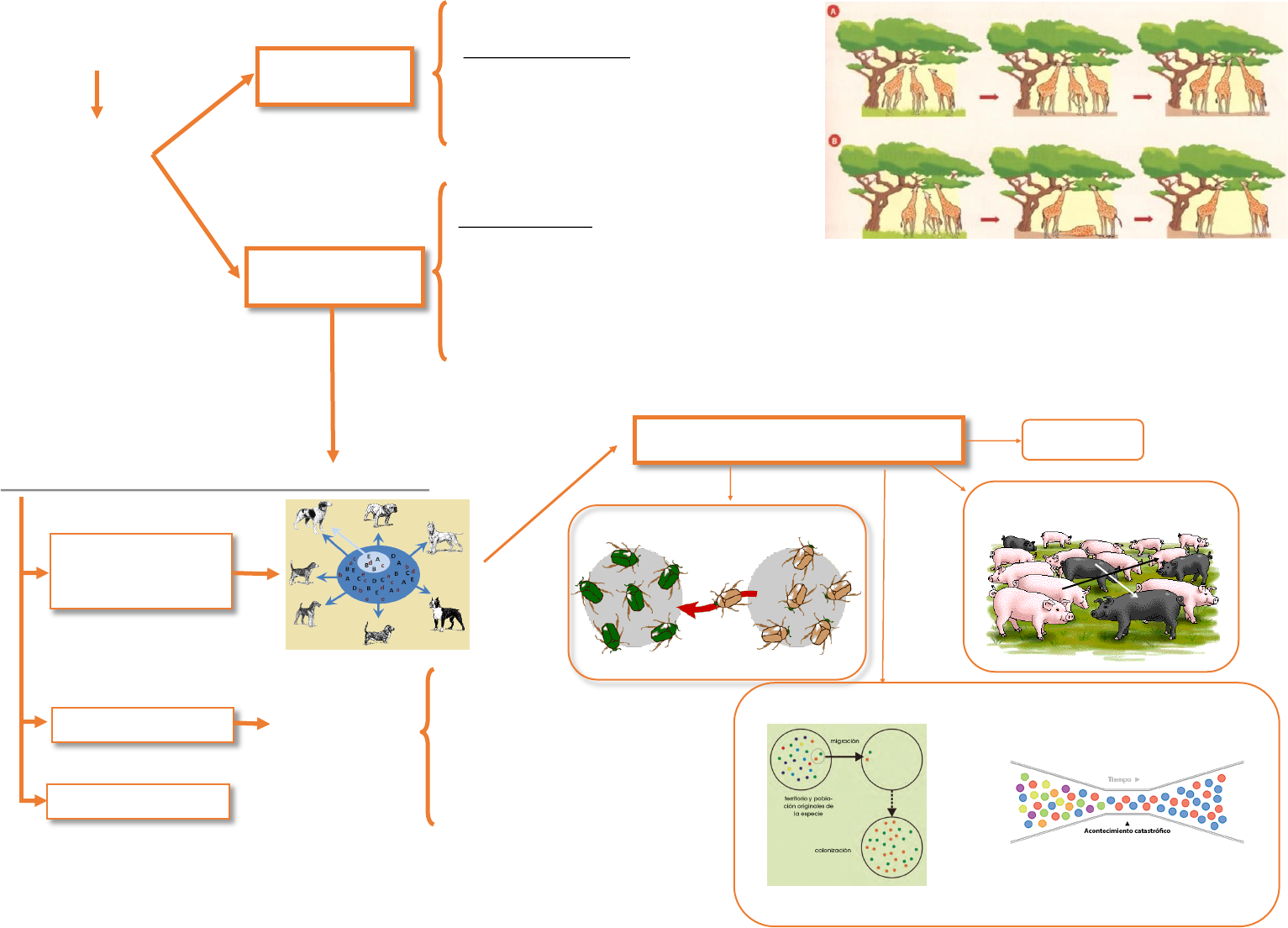 Evolución Teorías Lamarck Herencia de los caracteres adquiridos 3 factores de evolución: Cambios ambientales Sentimiento interior Ley de uso y desuso de los órganos Darwin-W Teoría de la selección natural 5 premisas básicas: Los organismos engendran organismos similares El n° de individuos que sobrevive en cada generación, generalmente es menor al n° que se producen Ocurren variaciones al azar Las variaciones favorables tienden a hacerme mas frecuentes La selección natural lleva a la acumulación de cambios que producen diferencias entre grupos Teoría sintética de la evolución + genética Mendel RESERVORIO GENICO VARIABILIDAD APTITUD ORIGEN Y PRESERVACION MUTACIONES REPRODUCCION SEXUAL EXOGAMIA DOBLE DOTACION CROMOSOMICA PROSESOS DE CAMBIO EVOLUTIVOS MUTACIO- FLUJO DE GENES DERIVA GENICA Efecto fundador Cuello de botella APARIAMIENTO PREFERENCIAL Evolución SELECCIÓN NATURAL EQUILIBADORA POLIMORFISMO EQUILIBRADO SUPERIORIDAD DEL ETEROCIGOTO DIRECCIONAL DISRRUPTIVA NORMALIZADORA DEPENDIENTE DE LA FRECUENCIA SEXUAL INTERSEXUAL INTRASEXUAL ADAPTACION CLINA Y ECOTIPO COEVOLUCION M. MULERIANO M. BATESIANO Evolución ESPECIE MECANISMOS DE AISLAMIENTO REPRODUCTIVO PRECIGOTICOS POSCIGOTICOS MECANISMOS DE ESPECIACION X DIVERGENCIA ALOPÁTRICA PARAPATRICA SIMPATRICA CUANTICA PERIPATRICA X POLIPLOIDIA MICROEVOLUCION Evolución MACROEVOLUCIÓN ANAGENESIS RADIACION ADAPTATIVA CLADOGENESIS EV. CONVERGENTE EV. DIVERGENTE EV. PARALELA EXTINCION