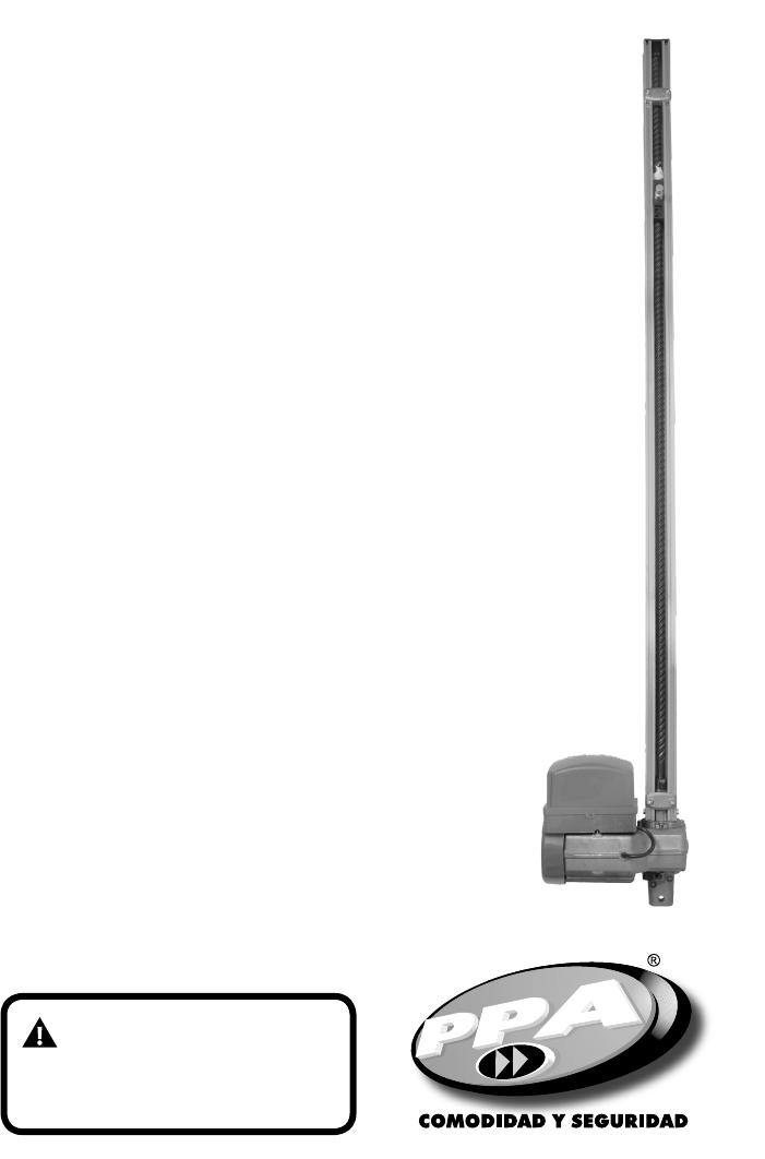 ATENCIÓN: Antes de utilizar el equipo, lea este manual con atención. Manual Técnico PENTA PREDIAL BV 2 ÍNDICE INSTRUCCIONES IMPORTANTES DE SEGURIDAD ................................................................. 3 CARACTERISTICAS TÉCNICAS ...................................................................................................... 4 HERRAMIENTAS NECESARIAS PARA INSTALACIÓN .............................................................. 5 INSTALACIÓN ELÉCTRICA ............................................................................................................. 5 CUIDADOS CON EL PORTÓN ANTES DE LA AUTOMATIZACIÓN ..................................... 7 INSTALACIÓN Y FIJACIÓN DEL AUTOMATIZADOR ............................................................... 7 INSTALACIÓN DEL FIN DE CARRERA ANALÓGICO .............................................................11 MANTENIMIENTO ..........................................................................................................................13 3 INSTRUCCIONES IMPORTANTES DE SEGURIDAD Recomendación: Para la instalación del equipo, es importante que el instalador especializado PPA siga todas las instrucciones de este manual técnico y en el manual del usuario. Con el manual del usuario en la mano, el instalador debe presentar todas las informacciones, usos e ítems de seguridad del equipo al usuario. Antes de utilizar el automatizador, lea y siga rigurosamente todas las instrucciones contenidas en este manual. - Antes de instalar el automatizador, asegúrese de que la red eléctrica local sea compatible con la exigida en la etiqueta de identificación del equipo; - No conecte el equipo a la red eléctrica hasta que se concluye la instalación / el mantenimiento. Conecte el cableado de la central de comando con la red eléctrica desconectada; - Tras la instalación, asegúrese de que las piezas del portón no invadan la calzada; - El uso de dispositivos de parada de emergencia en la instalación del automatizador es obligatorio. 4 CARACTERISTICAS TÉCNICAS *A nc ho m áx im o es c al cu la da p or e l v al or o bt ie nd o en la d es cr ip ci ón d el p ro du vt o (v al or e n m et ro s) a pl ic ad o en la e cu ac ió n. PENTAL PREDIAL PENTA PREDIAL SP / PENTA PREDIAL JET FLEX / PENTA PREDIAL BRUSHLESS TIPO DE AUTOMATIZADOR BASCULANTE BASCULANTE MODELO Monofásico Monofásico TENSIÓN NOMINAL 220 V 127 V FRECUENCIA NOMINAL 60 Hz 60 Hz POTENCIA NOMINAL 435 W 350 W RPM NOMINAL 1740 RPM 1740 RPM CORRIENTE NOMINAL 2,1 A 3,1 A RELACIÓN DE REDUCCIÓN 1:26 1:26 VELOCIDAD LINEAL 4 metros/minuto 4 metros/minuto CICLOS POR HORA 60 ciclos/hora 60 ciclos/hora GRADO DE PROTECCIÓN IPX4 IPX4 MATERIAL DEL RIEL Alumínio Alumínio RANGO DE TEMPERATURA -5° C / +50° C -5° C / +50° C CLASE DE AISLAMIENTO Classe B, 130° C Classe B, 130° C FIN DE CARRERA Analógico / Digital Analógico / Digital PESO MÁXIMO DE LA HOJA DEL PORTÓN 400 Kg 400 Kg DIMENSIÓN MÁXIMA DEL PORTÓN *ANCHO = (Valor en metro -0.15) x 2 LARGO = 4.0 m *ANCHO = (Valor en metro -0.15) x 2 LARGO = 4.0 m TIPO DE AUTOMATIZADOR BASCULANTE BASCULANTE BASCULANTE BASCULANTE MODELO Monofásico Monofásico Jet Flex BRUSHLESS TENSIÓN NOMINAL 220 V 127 V 220 V / 127 V 220 V / 127 V FRECUENCIA NOMINAL 60 Hz 60 Hz 60 Hz 60 Hz POTENCIA NOMINAL 435 W 350 W 210 W 100 W /300 W RPM NOMINAL 1740 RPM 1740 RPM 4365 RPM 4500 RPM CORRIENTE NOMINAL 2,1 A 3,1 A 1,6 A / 2,3 A 0,7 A / 1,3A RELACIÓN DE REDUCCIÓN 2:30 2:30 2:30 02:30 VELOCIDAD LINEAL 7 metros/minuto 7 metros/minuto 17,4 metros/minuto 17,4 metros/minuto CICLOS POR HORA 50 ciclos/h 50 ciclos/h 60 ciclos/h 100 ciclos/h GRADO DE PROTECCIÓN IPX4 IPX4 IPX4 IPX4 MATERIAL DEL RIEL Alumínio Alumínio Alumínio Alumínio RANGO DE TEMPERATURA -5° C / +50° C -5° C / +50° C -5° C / +50° C -5° C / +50° C CLASE DE AISLAMIENTO Classe B, 130° C Classe B, 130° C Classe B, 130° C Classe B, 130° C FIN DE CARRERA Híbrido Híbrido Híbrido Híbrido PESO MÁXIMO DE LA HOJA DEL PORTÓN 320 Kg 320 Kg 400 Kg 400 Kg DIMENSIÓN MÁXIMA DEL PORTÓN *ANCHO = (Valor en metro -0.15) x 2 LARGO = 4.0 m *ANCHO = (Valor en metro -0.15) x 2 LARGO = 4.0 m *ANCHO = (Valor en metro -0.15) x 2 LARGO = 4.0 m *ANCHO = (Valor en metro -0.15) x 2 LARGO = 4.0 m 5 HERRAMIENTAS NECESARIAS PARA INSTALACIÓN Algunas herramientas necesarias para instalación del automatizador: INSTALACIÓN ELÉCTRICA Para la instalación eléctrica, la red debe tener las características siguientes: - Red eléctrica 127 V o 220 V; - Interruptores de circuito de 5 A en la caja de distribución de energía eléctrica; - Tubos de conducción eléctrica de 3/4" de diámetro entre la caja de distribución de energía eléctrica y el dispositivo de parada de emergencia; - Tubos de conducción eléctrica de 3/4" de diámetro entre el dispositivo de parada de emergencia y el interruptor del automatizador; - Tubos de conducción eléctrica de 1/2" de diámetro para botoneras externas y dispositivos opcionales; - Tubos de conducción eléctrica de 1/2" de diámetro para fotocélulas de seguridad (opcional). ALICATE ARCO DE SIERRA DESTORNILLADOR PARA TUERCAS HEXAGONALES DESTORNILLADOR LLAVE FIJA ESCALERA SOLDADORA MARTILLO NIVEL CINTA MÉTRICA ESCUADRA TALADRO LÁPIZ PULIDORA 6 - El cable para el cableado fijo debe ser conforme la NBR NM 247-3 (Brasil); - El cable de suministro, de un producto de uso interno debe ser un cable flexible de 3 x 0.75 mm²; 500 V, conforme la norma NBR NM 247-5 (Brasil); - El cable de suministro, de un producto de uso externo debe ser un cable flexible de 3 x 0.75 mm²; 500 V, conforme la norma IEC 60245-57 (Brasil). Es obligatorio que el terminal de puesta a tierra sea conectdo al cable a tierra de la red. IMPORTANTE El equipo debe ser alimentado a través de un dispositivo de corriente diferencial residual (DR), con una corriente de operación residual nominal que excediendo 30 mA. 7 CUIDADOS CON EL PORTÓN ANTES DE LA AUTOMATIZACIÓN Antes 