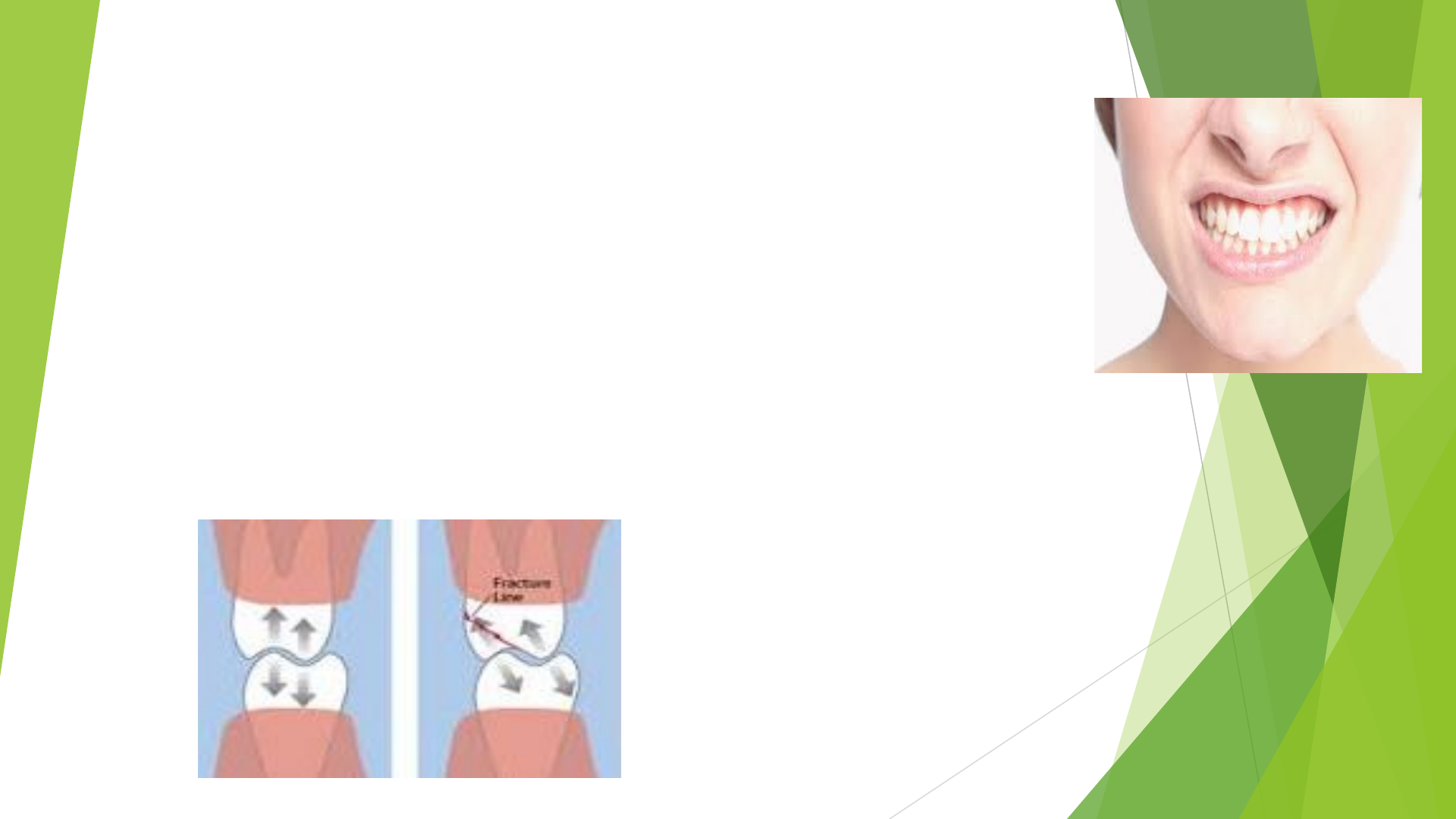 3.6 Oclusión Traumática y trauma por oclusión Oclusión Avanzada C.D. Mariana Vázquez de la Cruz Torres Fragoso Víctor Andrés Grupo 1409 ¿Que es? Se le denomina oclusión traumática a las lesiones localizadas principalmente en el periodonto como efecto de las fuerzas oclusales anormales que pueden producir o han producido estas lesiones. Se considera la oclusión traumática como primaria y secundaria. Alteraciones en el periostio Lesión en la estructura dentaria Lesión en la ATM Lesión musculoesqueletal Lesión en el tejido pulpar Oclusión traumática Primaria Las fuerzas oclusales anormales y las estructuras periodontales son básicamente fisiológicas(actúan sobre el periodonto sano) Oclusión traumática secundaria La fuerza oclusal son normales u anormales inciden sobre las estructuras periodontales DEBILITADAS, lo cual siempre será excesivo (actúan sobre el periodonto lesionado) Factores interferencias oclusales hipertonicidad muscular aumento de estrés Interferencias oclusales Presencia de puntos prematuros de contacto, dientes en malposición, restauraciones protésicas incorrectas. Hipertonicidad muscular Contracción excesiva de los músculos masticadores. Estrés Pacientes sometidos a cargas excesivas de trabajo u otras situaciones estresantes. Los músculos, ligamentos y articulaciones responden ante un daño dando signos y síntomas. Los dientes y sus tejidos de soporte tienen una respuesta cuando las fuerzas oclusales normales o anormales actúan sobre las estructuras periodontales básicamente sanas o debilitadas. Puntos prematuros de contacto Tanto en la posición de la relación céntrica como en la posición de lateralidad y propulsivas traen como consecuencia interferencias oclusales, falta de balanceo oclusal, originándose oclusión traumática producto de cargas inadecuadas en las superficies de soporte y pueden provocar además alteraciones neuromusculares y en la articulación temporomandibular. Factores desencadenantes Bruxismo céntrico Paciente que solo realiza apretamiento de los dientes, refiriendo cansancio muscular al levantarse. (Bruxismo excéntrico). Paciente que realiza ruido con los dientes, generalmente en las noches, imperceptible para él, evidente para los familiares.