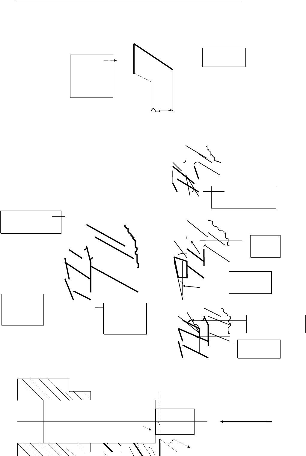 GEOMETRIAS DE UNA HERRAMIENTA MONOCORTANTE DE TORNO 1.1 Ángulos y Superficies Principales ( FILO SECUNDARIO ) ( FILO PRINCIPAL ) ( ANGULO DE INCIDENCIA PRINCIPAL ) ( SUPERFICIE DE DESPRENDIMIENTO ) ( ANGULO DE LA PUNTA ) ( ANGULO DE INCIDENCIA SECUNDARIA ) ( SUPERFICIE DE INCIDENCIA PRINCIPAL ) ( SUPERFICIE DE INCIDENCIA SECUNDARIA ) ( ANGULO DE DESPRENDIMIENTO ) ( ANGULO DE FILO ) ( 25º ) ( 90º ) ( 45º ) ( 45º ) ( 70º ) ( SENTIDO EN EL QUE TRABAJA LA HERRAMIENTA ) 1.2 Valor de los ángulos de una herramienta de torno de = 90º y en acero rápido, para mecanizar un acero de R=50-60 Kg/m.m2. ( = 10 º = 90 º 1 = 15 º 1 = 25 º = 66 º = 65º = 14 º )Los ángulos de la cuchilla de Cilindrar-Refrentar son: ( 1 ) ( 1 ) 1.3 En un Dibujo de una Operación de Mecanizado Exterior en Torno, dibujar una herramienta de = 90 º a Izquierdas, y otra a Derechas. ( HERRAMIENTA A IZQUIERDAS ) ( HERRAMIENTA A DERECHAS ) ( Sentido en el que trabaja la herramienta ) ( Sentido en el que trabaja la herramienta ) 1.4 Dibujos de las diferentes Herramientas de Torno, con relación al tipo de operación, para la cual han sido diseñadas. ( Herramienta de torno con cuchilla de Cilindrar - Refrentar. ) ( Herramienta de torno con cuchilla de Desbaste Recta. ) ( Herramienta de torno con cuchilla de Desbaste Recta. ) ( Herramienta de torno con cuchilla para “Roscas Triangulares”. ) 1.5 Dibujo de una Herramienta de acanalar ó tronzar, con el valor de sus ángulos. ( 5º- 6º ) ( CHAFLAN ) ( 20º- 25º ) TEMA 2 TORNO 2.1 Acompañado de dibujos, describir las partes principales, de que se compone un torno. (A) Bancada: Es la pieza que soporta los esfuerzos de corte y el peso de los demás órganos, puede ser de fundición gris o de acero (aunque son preferibles las de fundición gris), realizada en una sola pieza. Lleva en su parte superior dos guías rectilineas, planas o prismáticas, sobre las que se desliza el cabezal móvil. A la bancada se le exigen 3 requisitos que son: - Rigidez. - Fácil evacuación de las virutas. - Dimensiones adecuadas para el operario. (B) Cabezal motor: Esta formado por una caja generalmente de fundición, atornillada sobre el extremo izquierdo de la bancada. En algunos tornos, el cabezal se funde de una sola pieza con la bancada. Este cabezal contiene el eje principal, en cuyo extremo van los órganos de sujeción y accionamiento de la pieza, a las que imprime un movimiento de giro al recibir el eje a su vez el movimiento del motor a través de los engranajes de reducción, alojados también en el cabezal. (C) Husillo: Se denomina husillo al extremo de trabajo del eje principal que sobresale del Cabezal Fijo. El husillo va roscado exteriormente para acoplar fácilmente los platos de sujeción o de arrastre de las piezas. (D) Carro: Se compone de tres partes: el carro principal o de bancada, que desliza longitudinalmente sobre guías de ésta; el transversal o de refrentar, móvil sobre guías, perpendicularmente al anterior; finalmente, el portaherramientas, en el que se fija la herramienta, situado en la parte superior de los dos anteriores. (E) Cabezal Móvil: Esta montado sobre las guías de la bancada. Puede desplazarse a lo largo de la bancada y fijarse en la posición más conveniente con relación a la pieza a tornear. Sus misiones más importantes son dos: a) Albergar el contrapunto, para sujetar mejor la pieza, cuando se tornea entre puntos. b) Contener una broca o escariador cuando se desea taladrar y afinar agujeros. (F) Motor (G) Polea: Pueden ser trapeciales o planas, la fuerza de arrastre en las trapeciales es mayor que en las planas para la misma sección. Pueden ser abiertas o cruzadas y pueden transmitir movimiento entre ejes paralelos o cruzados. Si son poleas abiertas los ejes tienen el mismo sentido de giro, si son cruzadas tienen distinto sentido de giro. Hay posibilidad de resbalamiento pues solo pueden transmitir fuerza hasta el limite de rozamiento. (H) Correas Trapeciales (I) Caja de Cambio de Velocidades de avance: Permite modificar el valor del avance y nos da la posibilidad de realizarlo a mano o automáticamente, además, permite obtener una gran variación de velocidad en la barra de cilindrar y de roscar. (J) Palanca del Cambio de Velocidades de Avance: Permite modificar el valor del avance en función de la operación que se esté realizando (desbaste, acabado...). (K) Palanca de Inversión del Movimiento de Avance (L) Engranajes de Unión entre el Husillo y la caja de cambios: La dirección de giro de cada rueda es contraria a la de la rueda con la que engrana. Los engranajes pueden ser: - Cónicos Espirales. - Cónicos Rectos. - Cónicos Helicoidales. - Cilíndrico Rectos. - Cilíndrico Helicoidales. - Tornillo sin fin y rueda. (M) Palanca del Cambio de Velocidades del Husillo (N) Barra de Roscar: El movimiento de la barra de roscar, se transforma en rectilineo y continuo del carro de la bancada, por la acción de dos medias tuercas solidarias con este, que se cierran sobre la barra de roscar a voluntad del operario. (O) Palanca de acoplamiento con la barra de roscar: Es la palanca que al accionarla cierra dos medias tuercas sobre la barra de roscar. (P) Barra de Cilindrar: Los piñones secundarios de la caja de avances accionan la barra de cilindrar que transmite su movimiento por un tornillo sinfín que puede deslizar por ella en toda su longitud, a una rueda helicoidal en cuyo mismo eje hay otra rueda, engranada con un piñón que, movido por una palanca puede ocupar 3 posiciones. (Q) Palanca para la transmisión del movimiento de la barra de Cilindrar al Carro Superior (Carrillo) (R) Portaherramientas: Es el lugar donde se montan las herramientas por medio de dispositivos que permiten fijar una o varias herramientas. (S) Carro Portaherramientas: Es el carro en el que se fija la herramienta y esta situado en la parte superior del Carro Principal y el Carro Transversal. (T) Carro Transversal: Desliza transversalmente al torno sobre guías 