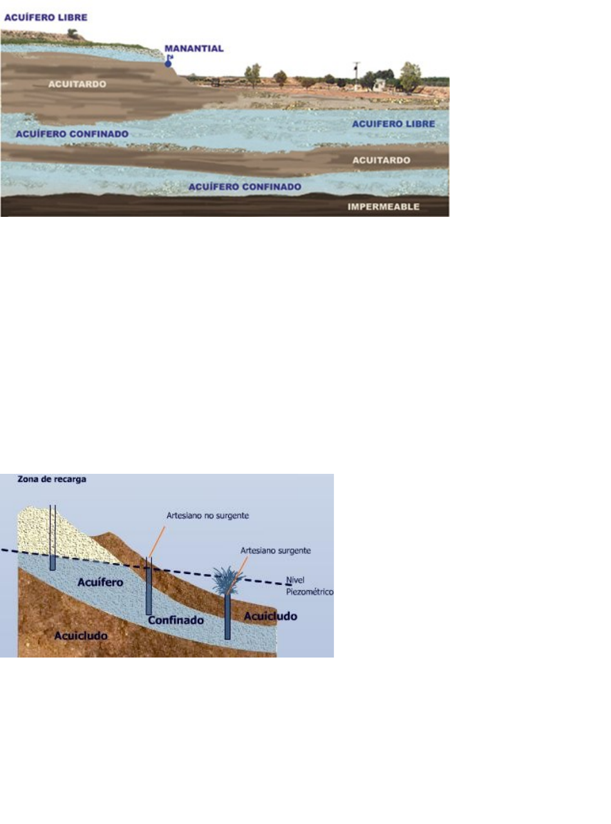 TIPOS DE ACUÍFEROS · por Guillermo Estefani · en Avanzar Los acuíferos se clasifican en cuanto a su estructura, su comportamiento hidráulico, su textura, su litología, y la movilidad de su agua. En cuanto a su estructura y su comportamiento hidráulico pueden clasificarse en “libres”, “confinados” o “semiconfinados”. Un mismo acuífero puede ser libre, confinado y semiconfinado según sectores y el área de estudio. El acuífero “subestimado, freático o libre” es aquel en el que se encuentra una superficie libre y real de agua encerrada en contacto con el aire y la presión atmosférica, por lo que su presión es en realidad igual a la presión atmosférica. No tienen una capa de materiales impermeables encima de ellas. En el acuífero libre el nivel freático coincide con la superficie y se encuentra encontacto directo con la zona subsaturada del suelo. Su posición varía dependiendo de la época de lluvias o las épocas secas. Los acuíferos “confinados”, “cautivos”, “a presión” o “en carga” son aquellos cuerpos de agua que se acumulan en la roca permeable y están encerrados entre dos capas impermeables. En estos acuíferos el agua está sometida a una presión mayor a la de la atmósfera y ocupa todos los poros y huecos de la formación geológica saturándola totalmente. No existe “zona no saturada” Si se perfora este acuífero, el nivel de agua ascenderá hasta situarse en una posición que coincidirá con el nivel de saturación del acuífero en el área de recarga. El agua está sometida a una presión mayor a la atmosférica y sólo recibe agua de lluvia en zonas donde los materiales son permeables en puntos generalmente distintos de donde reside el cuerpo del agua. El acuífero “semi-confinado” ocurre cuando el estrato de suelo que lo cubre tiene significativamente menos permeabilidad que el acuífero en sí, pero no es impermeable, permitiendo que ocurra la descarga y recarga a través de este estrato. El muro y/o el techo no son totalmente impermeables y permiten la filtración vertical del agua, por lo que puede recargarse o perder agua a través del techo o de la base. Según la movilidad del agua se pueden clasificar en “acuíferos”, “acuitardos”, “acuicludos” y “acuifugos”. La velocidad del agua dependerá de la porosidad y percolación de la roca a una velocidad de 1 centímetro por año. Los “acuíferos” almacenan y transmiten agua subterránea, por lo general en arenasporosas y calizas fisurales. Los “acuitardos” son buenos almacenes pero malos transmisores de agua subterránea por transmitirla lentamente (por ejemplo, compuestos de limos). Los “acuicludos” son buenos almacenes pero nulos transmisores (el caso de arcillas) Los “acuifugos” no almacenan ni transmiten agua como los constituidos de granitos, cuarcitas no fisuradas. Según las características litológicas en “detríticos” o “carbonatados” Según su textura se pueden clasificar en “porosos” y “fisurales” Los acuíferos “porosos” son aquellos en los que el agua se encuentra embebida en una esponja dentro de poros intercomunicados entre sí existiendo permeabilidad como en arenas y gravas Los acuíferos “fisurales” son aquellos que el agua se encuentra en fisuras o diaclasas comunicadas entre sí, pero el agua se comporta de forma heterogénea. image2.jpeg image3.jpeg image4.jpeg image5.png image1.png