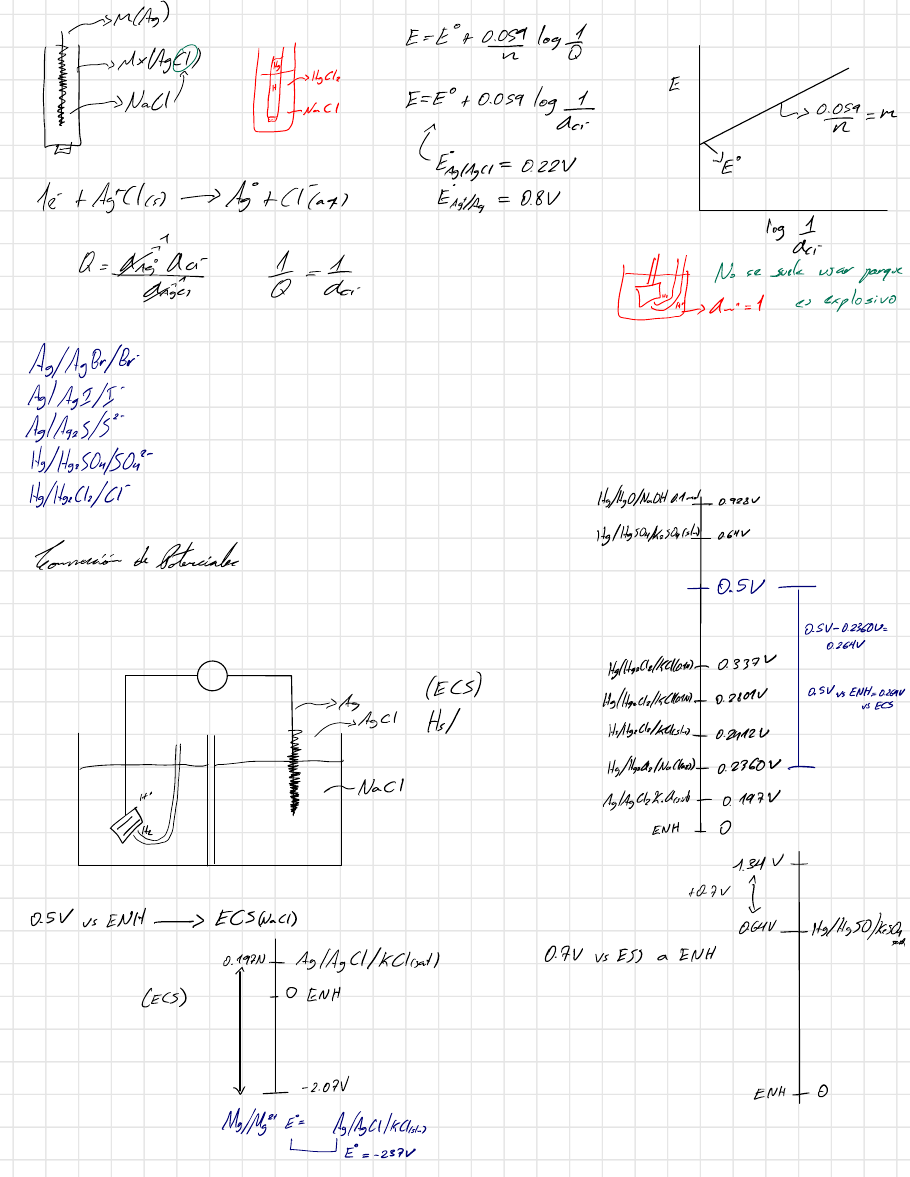 -M(As 0 E =E+0 log *e !" E=EP +0.059 log, E ↳04=m TE Iz R Ag(AgCI =0.22V 1é +Aglar ->Agt(Taq ErsAs=0.8V 1log dei R -e * =Gi 1.- Noe role eranparteenI↓ It2dW- As/Age/Be AglAgI/I AglAges/ He/HeeOn/O Hg/HCle/CI- Ig/HgO/NaOH0.1mol - 0.928V Ig/IgrOnkesOncel 0.64 Gonton de Pateriale - 0.SV - 0.SV-0.2360U= Hglgele/kIo-0.337V (EC) 0. SVvs ENH=0.264V ->As Ag(Hecelk(HoN-0.20012 vs ECs Hultgecle/zelester - 0.2412V ->-t I 0.264V Hg/Agete/Nalkard- 0.2360e. AglAgClekorit - 0.197V #in ENH - O 1.34V - +az - 0.5V nent-- ECsWall 064V - ha/hsO/hes 0.197N- Ag/AgCl/kCIrat 0.1 vEs a ENH - (Ecs) - O ENH v - 2.07 ENH-0 MaMg24 E=Ag/AgI/kCl -E =-237 Stechodo.- Aplicantes Astulacionesdoterconities # e Wes fot + lé-fort En(1.4V E =E +0059logfea == Efef=0.77V ↳-C1f-fet lest fe-fot Purante ce* +f fe+ Q =Acost Aft Afort - **= aftRit 1.59U - ** *-fes+ E I* =ActArest Acont 0.77 E = E +0.059 logat Vot Después depuntode equivalencia fort co*-fe+* = 1.595+0.059 log den Vo AceArt Salade el de caday encuentela reaccióndecada una de las siguentesoldas. a) AgclAg(1=0.01112(a ==0.01/zas ↳)pulfo(a= 1), fe(41 =0.111CI(a= =0.0011/Ag(or/Agea 4 zm(y/znO:"(a==0.1). 0H(a==1)(Hg0cr(Hgse a) Agcr(Ag(1 =0.01112(a ==0.01 /zns E=E+ oslog Ei=Ep -EE =Er-kir EU.SV 2Ag -2Agt +1e- (2) Ei= -0.76V-0.5V) E=10.76 Z +2é-Zi Ei= -1.56V 2Ag +Z-2Agt Zi E= -1.56V+59 log E= - 147.1V oe 16 = - nfE 36 = - e (96,500) (- 1.471) Er *=283,999 En ↳)pulfo(a= 1), fe(41 =0.111CI(a= =0.0011/Ag(or/Agea E=E +059 log I -Q R =As Afet UntArc E=0.77 fet-f + 1e Q=fest Aet =ot E =0.22V AgCl+ 1 -Ag +CI -> e? Fe+ AgC) -- Agtfe3 E=_0.55V70.059 log E=ER-=E-kir=Ei-Ei ~ E=-0.491V E =0.220-0.77V=-0.SSU 4 zm(y/znO:"(a==0.1). 0H(a==1)(Hg0cr(Hgse E=1.216V Ze+ 40H-ZP +2120 + 200E= 0.098 HgO +2+ H20--D+20H- Ent HgPt2OH- ZeDeHgtHzO -Q =AznarYno >AsorAze I -Hote EIE -Eiz=0.048U-(-1.2160 E=1.314V E =1514V+59 log E=1.344V Pandionty (umes .1Nor,Miérco 2 UI Propiedades Coligativos. St = jkam ↓(i =2 es Nall-Nat+C 1.7 Para la siguientealda HesOn- 244On P6CAg//P65Oy(HeOn (as0.00m) Helg, later IPt E=0.09589 2 VI =? I = Eaz I=1 [10.002(2 +10,001(2 I=0.003 log UI-- Iz. IzB logUt=-(2/C(0.509 log UI = - 0.558 U= =1- 0.855 UI =0.88 E=0.095892 UI =? ~On + 16-P65Oncer+2é EE-0.356V 3E=OV-(0.956V2H+2-He(g -E16 +2H10-165Onceit Hacg, Ei =0.356V Es =Ed-Er &HeronR=Art Q =(1) 1 =4Gro A Aro Q a =V=C Art=U=(1+ ==10.002/ Aron= U-_Cro-- VI (0.001 -.A Aro E=20 +039 log E =[V10.002][W=10.001) * =V/4X0-* 0.09589V=0.356V+09 logWI (No 210.09989-0.3960) =log (VI1940-] 0.059U - 8.82 = log(VI(nx10- 10-8=VI/4x10- U= VI =0.72 Loof. dact media f - Ibonos detamina UIde mara ebchofrica, Para la celda . - t(uKuClesmerlAgCIlAg I IL * en C+ 2C1- ->C E = 0.191 arando m= 1N0wol Eg E= - 0.74V im=0.2 a ↳-(é 6 Petumins E Ag*Cl+2-2Agt21 4) Peterse UI Cut2AgCIr-(+ 2Ci +2As a Culle I R =Ang'AcoAci 8 = I disc AcuCa a =Ac, 21=1 Baja concentración a = C XP = l La E =E +59 log 0.191= Et 0.059 log 1 2 11x10-4(2x10-4 0.191 =E+0.2362V E=0.191-0.3362V E = - 0.1452V acr=U=10.4 Q = 0).Aci 1 = Acret =UI( ~ a a Ha= WI (0.2 1Ga I = VE 10.2(8x-0.41 I 1 = 1 e Q VI 10.032/ E = -0.14S2V E = - 0.74V E =E1log t - 1.074 v=-0.14522+054 log coser I1-0.07410.1ns2V=109 2110.0920.0592 -2.3 =- log UI(0.032 10 =(10.032/ UI =0.49 Gonetraciónde Piagramas de Pourbaix P ↑ SX T Hierro:fet,fet, felots, feeds, feUn", fe fortlé-f Q= *Zona de estabilidad E =E + 0.059 log fest Xt Linear horizontales. = FoOn2- * Linear Verticales Ello, afest Afeo a E est o.neo acido/base Elf 08 et s: [volubilidad fez03 - 0.4 - - 0.3 - F folOl/z pl Pisolventeeselagua - Las solusiones se consideran ideales y los gases perfectos · =1 c=ap=a - Losiagemusas son realizadosaeso y una paciono 1 bar En una frontan que repars expeciesdisaltar a considera que las concentracios de las especiesson iguales Los potenciales estanreferidos al electrodo nounalde hidroigace -Losespain disuellasestanen concentraciosde 1 a 100 118, indice m Frontera a ItM- ~- -~ - 37 +15 - fo*, Q =t- ↑ E = E +s log I E=0.77V+ logstestdro Fe Foo, E=E+0.0S lo I E "It fets.nwo 9 9aa 0.8 e fot E= -0.44V+089 log UX0= -0.0SO fez03 - 0.4 -0.3 folOl/z F pl Fo(OH) (f FolOHs + 3H +1e- -- fe+3Het Q =Afet Hirzo E =Be-Aro con Dar E=E +134 log E=E0+054 log-Et0.0sloganl-0.054 log dee E =E -0.059/0gre +19) 10.099/ lag Am pH = -log Ant -teE =E-0.059109 Afe-0.18pH E = 1.13 - 0.18,H