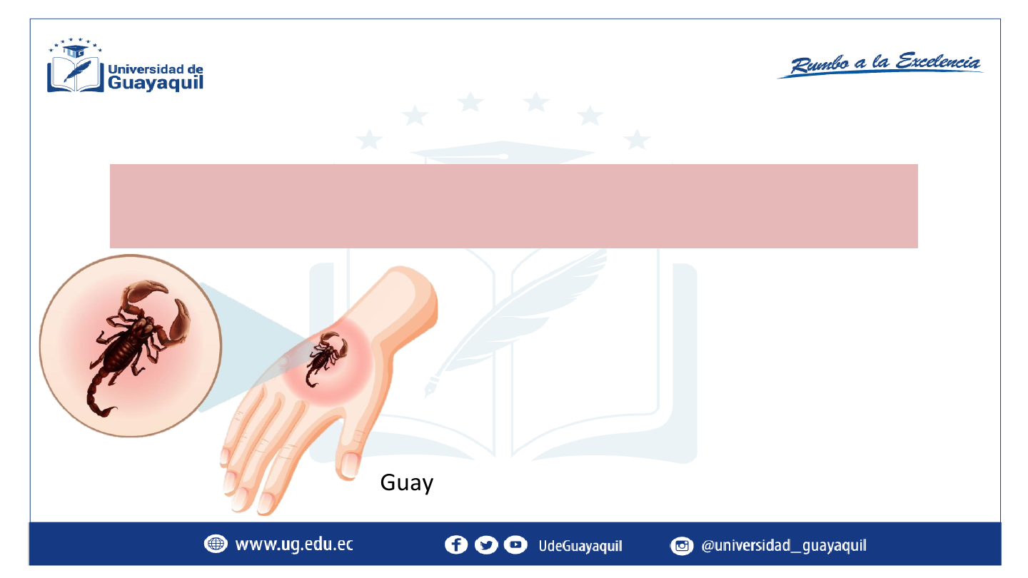 UNIVERSIDAD DE GUAYAQUIL FACULTAD DE CIENCIAS MÉDICAS CARRERA DE MEDICINA PICADURAS DE ESCORPIONES Guayaquil, 08 de julio de 2024 Alumno: Astudillo Vásquez Niurka Maytte Docente: Dra. Glenda Velásquez Serra. PhD INTRODUCCIÓN La palabra Alacrán deriva del árabe "al-agrab" que significa "el escorpión", mientras que el término escorpión deriva del latín "scorpio", palabra utilizada para denominar a los artrópodos de la Clase Arachnida. La palabra Alacrán deriva del árabe "al-agrab" que significa "el escorpión", mientras que el término escorpión deriva del latín "scorpio", palabra utilizada para denominar a los artrópodos de la Clase Arachnida. ✓ Período Silúrico: Vivían en ambientes acuáticos, fueron uno de los primeros animales en trasladarse del agua a la tierra. ✓ Evolución Mesozoica: Evolucionaron y se diversificaron, desarrollando una amplia variedad de formas y tamaños. ✓ Actualmente: Existen más de 2.500 especies adaptadas a una variedad de entornos. ✓ Período Silúrico: Vivían en ambientes acuáticos, fueron uno de los primeros animales en trasladarse del agua a la tierra. ✓ Evolución Mesozoica: Evolucionaron y se diversificaron, desarrollando una amplia variedad de formas y tamaños. ✓ Actualmente: Existen más de 2.500 especies adaptadas a una variedad de entornos. Historia Factores de riesgo Determinantes sociales de la salud ❖ Hacinamiento ❖ Pobreza ❖ Ocupación ❖ Falta de saneamiento ❖ Acúmulo de basuras ❖ Edad: Pediátricos y ancianos con comorbilidades ❖ Embarazadas ❖ Lugar de la inoculación ❖ Hacinamiento ❖ Pobreza ❖ Ocupación ❖ Falta de saneamiento ❖ Acúmulo de basuras ❖ Edad: Pediátricos y ancianos con comorbilidades ❖ Embarazadas ❖ Lugar de la inoculación ❑ Ambiente: Áreas con climas cálidos y secos, y zonas tropicales ❑ Genética: Susceptibilidad individual ❑ Estilos de vida: Almacenamiento inadecuado de ropa y zapatos ❑ RSS: Acceso a la atención médica, programas de educación y concienciación ❑ Ambiente: Áreas con climas cálidos y secos, y zonas tropicales ❑ Genética: Susceptibilidad individual ❑ Estilos de vida: Almacenamiento inadecuado de ropa y zapatos ❑ RSS: Acceso a la atención médica, programas de educación y concienciación TAXONOMÍA • Reino: Animalia • Filo: Arthropoda • Subfilo: Chelicerata • Clase: Arachnida • Orden: Scorpiones • Reino: Animalia • Filo: Arthropoda • Subfilo: Chelicerata • Clase: Arachnida • Orden: Scorpiones • Familia: Buthidae • Género: Tityus • Especie: • T. trivittatus • T. asthenes • T. confluens • T. ecuadoriensis • T. bahiensis • T. lojanus • Familia: Buthidae • Género: Tityus • Especie: • T. trivittatus • T. asthenes • T. confluens • T. ecuadoriensis • T. bahiensis • T. lojanus • Familia: Bothriuridae • Género: Bothriurus • Especie: • B. bonariensis • B. coriaceus • B. chilensis • Familia: Bothriuridae • Género: Bothriurus • Especie: • B. bonariensis • B. coriaceus • B. chilensis ESCORPIONES DE IMPORTANCIA MÉDICA Tityus trivittatusTityus trivittatus Longitud: Hasta 7 cm aproximadamente Características: Pinzas finas y largas, aguijón de la punta de la cola abultado, con una pequeña espina Color: amarillo a marrón Hábitat: Se refugia en grietas de la pared y el piso, en rejillas, bajo baldosas, ladrillos, piedras y maderas y tuberías Alimentación: Principalmente cucarachas Comportamiento: Nocturno, mayor actividad en noches de calor y sin luna Longitud: Hasta 7 cm aproximadamente Características: Pinzas finas y largas, aguijón de la punta de la cola abultado, con una pequeña espina Color: amarillo a marrón Hábitat: Se refugia en grietas de la pared y el piso, en rejillas, bajo baldosas, ladrillos, piedras y maderas y tuberías Alimentación: Principalmente cucarachas Comportamiento: Nocturno, mayor actividad en noches de calor y sin luna ESCORPIONES DE IMPORTANCIA MÉDICA Tityus confluensTityus confluens Longitud: Hasta 7 cm aproximadamente Características: Pinzas finas y largas, aguijón de la punta de la cola abultado, con una pequeña espina Color: Amarillo a marrón Hábitat: Muy adaptado a áreas urbanizadas, en viviendas es intradomiciliario y peridomiciliario Alimentación: Principalmente cucarachas Comportamiento: Nocturno, mayor actividad en noches de calor y sin luna Longitud: Hasta 7 cm aproximadamente Características: Pinzas finas y largas, aguijón de la punta de la cola abultado, con una pequeña espina Color: Amarillo a marrón Hábitat: Muy adaptado a áreas urbanizadas, en viviendas es intradomiciliario y peridomiciliario Alimentación: Principalmente cucarachas Comportamiento: Nocturno, mayor actividad en noches de calor y sin luna ESCORPIONES DE IMPORTANCIA MÉDICA Tityus bahiensisTityus bahiensis Longitud: Hasta 7 cm aproximadamente Características: Pinzas finas y largas, aguijón de la punta de la cola abultado, con una pequeña espina. Color: Amarillo a marrón Hábitat: Se refugia bajo troncos o piedras y está presente en lugares con mucha vegetación Alimentación: Principalmente cucarachas Comportamiento: Generalmente intenta escapar, y pica si es molestado Longitud: Hasta 7 cm aproximadamente Características: Pinzas finas y largas, aguijón de la punta de la cola abultado, con una pequeña espina. Color: Amarillo a marrón Hábitat: Se refugia bajo troncos o piedras y está presente en lugares con mucha vegetación Alimentación: Principalmente cucarachas Comportamiento: Generalmente intenta escapar, y pica si es molestado ESCORPIONES DE IMPORTANCIA MÉDICA Tityus asthenes Tityus asthenes Longitud: 5 - 8 centímetros de longitud Características: Cuerpo robusto con un par de pinzas grandes y una cola larga y delgada que termina en un aguijón venenoso Color: Marrón claro a marrón oscuro Hábitat: Áreas tropicales y subtropicales Alimentación: Insectos pequeños y otros artrópodos Comportamiento: Es noc