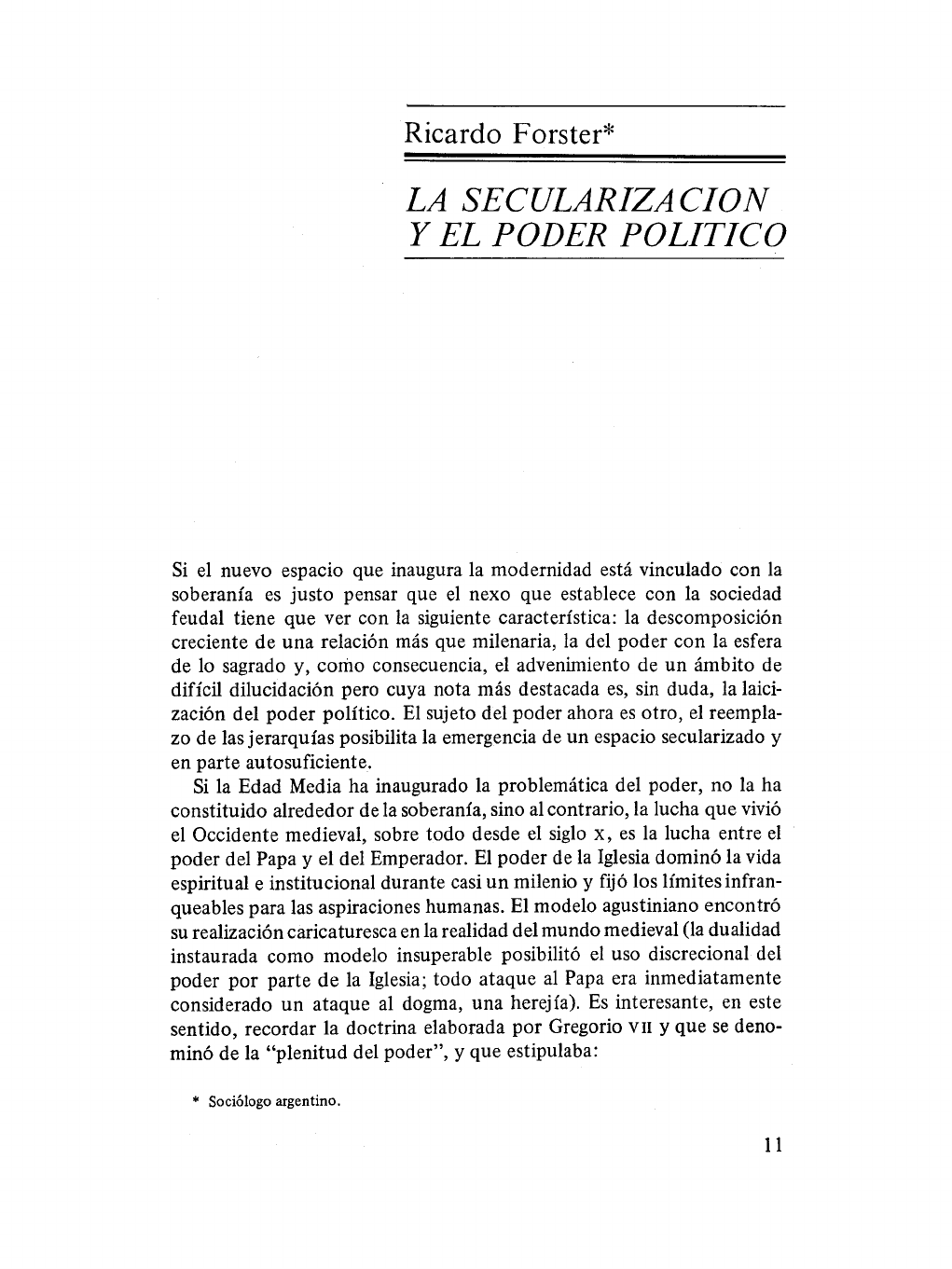 Ricardo Forster* LA SECULARIZACION Y EL PODER POLITICO Si el nuevo espacio que inaugura la modernidad está vinculado con la soberanía es justo pensar que el nexo que establece con la sociedad feudal tiene que ver con la siguiente característica: la descomposición creciente de una relación más que milenaria, la del poder con la esfera de lo sagrado y, como consecuencia, el advenimiento de un ámbito de difícil dilucidación pero cuya nota más destacada es, sin duda, la laici zación del poder político. El sujeto del poder ahora es otro, el reempla zo de las jerarquías posibilita la emergencia de un espacio secularizado y en parte autosuficiente. Si la Edad Media ha inaugurado la problemática del poder, no la ha constituido alrededor de la soberanía, sino al contrario, la lucha que vivió el Occidente medieval, sobre todo desde el siglo x , es la lucha entre el poder del Papa y el del Emperador. El poder de la Iglesia dominó la vida espiritual e institucional durante casi un milenio y fijó los límites infran queables para las aspiraciones humanas. El modelo agustiniano encontró su realización caricaturesca en la realidad del mundo medieval (la dualidad instaurada como modelo insuperable posibilitó el uso discrecional del poder por parte de la Iglesia; todo ataque al Papa era inmediatamente considerado un ataque al dogma, una herejía). Es interesante, en este sentido, recordar la doctrina elaborada por Gregorio v il y que se deno minó de la “plenitud del poder”, y que estipulaba: * Sociólogo argentino. 11 Art. I: La Iglesia romana ha sido fundada sólo por el Señor. Art. VII: Sólo El puede utilizar las insignias imperiales. Art. IX: El Papa es el único hombre cuyos pies besan los prín cipes. Art. XII: Le está facultado deponer a los emperadores. Art. XVIII: Nadie puede reformar su sentencia y sólo él puede reformar la sentencia de todos. Art. XIX: Nadie debe juzgarle. Esta concepción teocrática del poder que no hace más que expresar, de forma aproximada, la fórmula tan frecuentemente citada por Pablo en su epístola a los romanos: “No hay más poder que el de Dios, los que existen están instituidos por Dios”, es impensable en términos de soberanía, en la medida en que ésta implica una autosuficiencia por completo opuesta al mundo de jerarquías y dependencias instaurado por la Iglesia. En ésta el poder no es concebido como algo propio del orden social, emanado de éste, sino que es el resultado de una libre deci sión de Dios. En El nombre de la rosa de Umberto Eco encontramos nuevamente la pista del argumento que, a partir del siglo xiv y a través de hombres como Marsilio de Padua y Guillermo de Occam, irá socavando los fun damentos doctrinarios en los que descansaba el poder eclesiástico. Le dejamos, entonces y por unos instantes, la palabra a Guillermo de Baskerville: “Después dijo que, dada la inmensa bondad que Dios había mostrado al crear al pueblo de sus hijos, amándolos a todos sin distin ciones, desde aquellas páginas del Génesis donde aún no se hacía dis tinción entre sacerdotes y reyes, y considerando también que el Señor había otorgado a Adán y sus sucesores el dominio sobre las cosas de esta tierra, siempre y cuando obedeciesen las leyes divinas, podía sos pecharse que tampoco había sido ajena al Señor la idea de que en las cosas terrenales el pueblo debía ser el legislador y la primara causa efi ciente de la ley (. . .) Pues bien, prosiguió Guillermo, si uno solo puede hacer mal las leyes, ¿no las hará mejor una mayoría? Desde luego, sub rayó, se habla de las leyes terrenales, relativas a la buena marcha de las cosas civiles. Dios había dicho a Adán que no comiera del árbol del bien y del mal, y aquélla era la ley divina, pero después lo había autorizado, qué digo, incitado a dar nombre a las cosas, y con ello había dejado li bre a su súbdito terrestre. En efecto, aunque en nuestra época algunos digan que nomina sunt consequentia rerum, el libro del Génesis es por lo demás bastante claro sobre esta cuestión: Dios trajo ante el hombre todos los animales para ver cómo los llamaría, y cualquiera hubiese sido el nombre que éste les diese, así deberían llamarse en adelante. Y aun 12 que, sin duda, el primer hombre había sido sagaz como para llamar, en su lengua edénica, a toda cosa y animal de acuerdo con su naturaleza, eso no entrañaba que hubiera dejado de ejercer una especie de derecho soberano al imaginar el nombre que a su juicio correspondía mejor a dicha naturaleza. Porque, en efecto, ya se sabe qué diversos son los nom bres que los hombres imponen para designar los conceptos, y que sólo los conceptos, signos de las cosas; son iguales para todos. De modo que, sin duda, la palabra nomen procede de nomos, o sea ley, porque preci samente los hombres dan la nomina ad placitum, o sea a través de una convención libre y colectiva (...) En virtud de lo cual, concluyó Guiller mo, se ve con claridad que la legislación sobre las cosas de esta tierra, y por tanto sobre las cosas de las ciudades y los reinos, no guarda rela ción alguna con la custodia y la administración de la palabra divina, privilegio inalienable de la jerarquía eclesiástica.” 1 La argumentación continúa a lo largo de algunas páginas más, pero creemos que con lo dicho basta para dejar claramente expuesta la posi ción que vendrá a trastocar el orden político medieval. La aparición de la idea de soberanía disloca el concepto tradicional de poder, o, en otras palabras, lo arranca del cielo para traerlo a la tierra. El descentra- miento del poder sacro nos conduce a la irrupción de un nuevo tipo de poder que se estructura como expresión de un entramado social ex clusivamente profano. Soberanía quiere decir: constitución del poder como forma cristalizada de lo propio del hombre. La ideología eclesiás tica, vertebradora del orden sociopolítico medieval, une el poder con lo divino, lo ubica plenamente en un