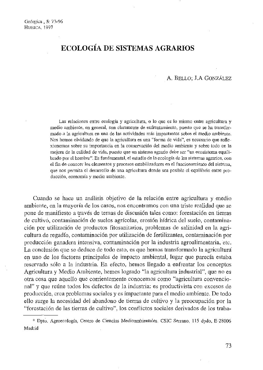 Geórgica , 5: 73-96 HUESCA, 1997 ECOLOGÍA DE SISTEMAS AGRARIOS A. BELLO; J.A GONZÁLEZ La.~ relaciones entre ecología y agricultura, o lo que es lo mismo entre agricultura y medio ambiente, en general, son claramente de enfrentamiento, puesto que se ha transfor mado a la agricultura en una de las actividades más impactantes sobre el medio ambiente. Nos hemos olvidando de que la agricultura es una "forma de vida", es necesario que refle xionemos sobre su importancia en la conservación del medio ambiente y sobre todo en la m~jora de la calidad de vida, puesto que un sistema agrario debe ser "un ecosistema equili brado por el hombre". Es fundamental, el estudio de la ecología de los sistemas agrarios, con el fin de conocer los clementos y procesos estabilizadores en el funcionamiento del sistema, que nos pelmita el desarrollo de una agricultura donde sea posible el equilibrio entre pro ducción, economía y medio ambiente. Cuando se hace un análisis objetivo de la relación entre agricultura y ·medio ambiente, en la mayoría de los casos, nos encontramos con una triste realidad que se pone de manifiesto a través de temas de discusión tales como: forestación en tienas de cultivo, contaminación de suelos agrícolas, erosión hídrica del suelo, contamina ción por utilización de productos fitosanitarios, problemas de salinidad en la agri cultura de regadío, contaminación por utilización de ferti1izantes, contaminación por producción ganadera intensiva, contaminación por la industria agroalimentaria, etc. La conclusión que se deduce de todo esto, es que hemos transformado la agriculturá e~ uno de los factores principales de impacto ambiental, lugar que parecía estaba reservado sólo a la industria. En efecto, hemos llegado a enfrentar los conceptos Agricultura y Medio Ambiente, hemos logrado "la agricult~ra industrial", que no es otra cosa que aquello que corrientemente conocemos como "agricultura convencio nal" y que reúne todos los defectos de la industria: es productivista con excesos de producción, crea problemas sociales y es impactante para el medio ambiente. De todo ello surge la necesidad del abandono de tierras de cultivo y la preocupación por la "forestación de las tierras de cultivo", los conflictos sociales derivados de los traba- * Dptó. Agroecología, Centro de Ciencias Medioambientales. CSIC Serrano, 115 dpdo, E-28Q06 Madrid 73 A. BELLO, J. A. GONZÁLEZ jos temporales, la erosión y contaminación ambiental. En definitiva, nos hemos olvi dado de la esencia de la agricultura como "forma de vida", Be!lo (l993a). Ante esta situación, tuvo que llegar la cumbre Celebrada en Río de Janeiro en 1992, para que se reconociese internacionalmente la necesidad de la protección del medio ambiente y se comenzase a pensar en que debe existir un equilibrio entre Producción, Economía y Medio Ambiente. Esta toma de conciencia y reconoci miento se ha considerado como uno de los fenómenos más transcendentales de los últimos tiempos. Por ello la DE, a través de la reforma de la Po!{tica Agraria Comunitaria (PAC) , trata de ir hacia modelos agrarios menos productivistas y más acordes con la conservación del medio ambiente, ITG de NavalTa (1994). Esta no es rácil, el problema principal estriba en lograr que la "Agricultura Industrial", que algunos hemos llegado a definir como "telTorismo ambiental", pueda transformarse en una "Agricultura" con mayúscula, que permita conservar el ambiente, mantenerse productiva para las generaciones futuras y además sea económicamente ren table, no podemos olvidar que un cultivo es un sistema productivo, Gliessman (1990). En esta línea, treinta años antes de la cumbre de Río, Raquel Carson (1964) en su famoso libro: "La Primavera Silenciosa", planteó las consecuencias de una agricul lura impactante en el medio ambiente y, corno reacci(}n a su publicación, se potenció el movimiento ecologista cuyo objetivo fundamental era proteger a la naturaleza ü'ente al hombre y, en la mayoría de los casos, sin el hombre. La ciencia, tratando de encontrar soluciones a sus propios errores, nos lleva a la mal llamada "revolución verde". Propone y potencia la mejora vegetal y sobre todo el control biológico como respuesta para resolvé".r los problemas planteados por el uso de plaguicidas (uno de los principales problemas denunciados por Raquel Carson) dentro de 10 que se han venido llamando modelos de "control integrado de Plagas", comúnmente conocido como IPM (Integrate Pesl Management). Pero la "revolución verde", al promover la utilización de variedades mejoradas, ha producido una agri cultura con mayor exigencia de fertilizantes, de agua y paradójicamente de plaguici das. En definitiva, ha creado una agricultura más cara económica, social y ambien talmente, que produce un mayor impacto ambiental por contaminación de fertilizan tes, problemas de salinidad en los suelos de regadío, problemas sociales en la mayo ría ele loS" países del tercer mundo donde se ha exportado esta tecnología y, queda aún por ver lo que ocurrirá con la aplicación irracional del control biológico, que impli ca la liberación al medio de organismos (virus, bacledas, hongos, nematodos, insec tos, etc.), en muchos casos manipulados genéticamente. 74 ECOLOGíA DE SISTEMAS AGRARIOS En los años ochenta, al iniciarse el Programa MAB de Humanidad y Biosfera de UNESCO, se comienzan a valorar los grandes fracasos de la "revolución verde" y se renexiona sobre los factores que lo produjeron. Uno de los fallos fundamentales fue la exclusión del hombre del ecosistema, de la naturaleza. Se llegaba incluso a rei vindicar por los sindicatos agrarios el "Derecho a Producir", olvidí:lndose de que la agricultura es, sobre todo, una "forma de vida". Desde mediados de los años ochenta hasta nuestros días, se comienza a reflexio nar sobre la importancia de la agricultura en la conservación del medio ambiente. Surge la biotecnología como nuevo ángel salvador