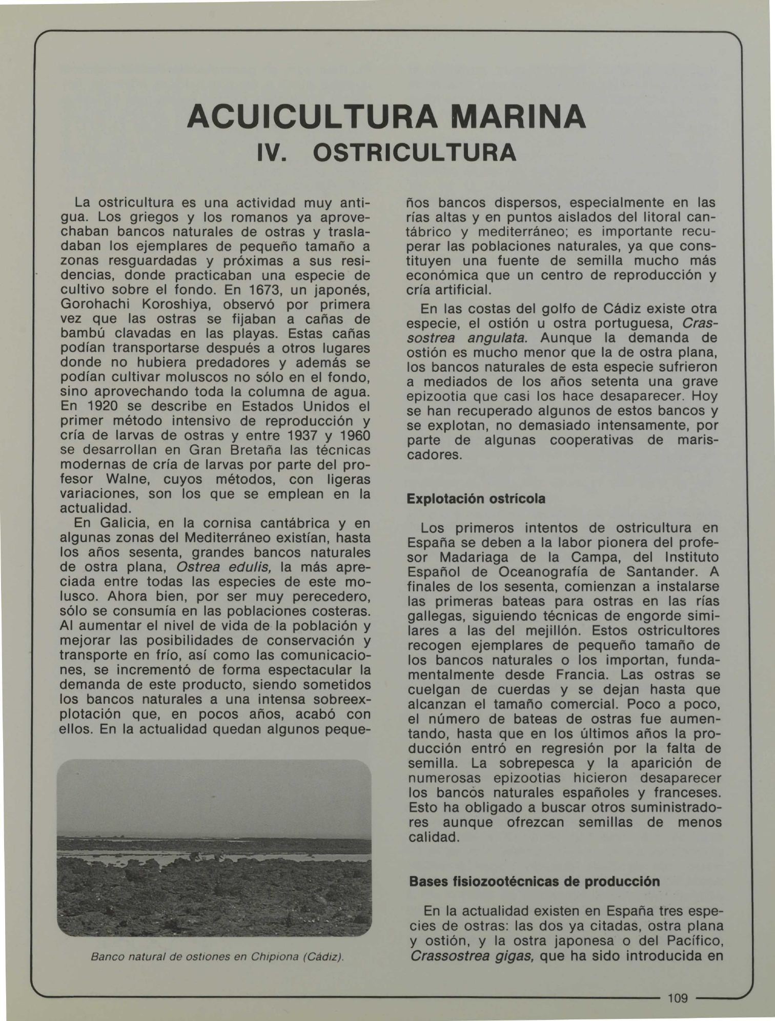 109 ACUICULTURA MARINA IV. OSTRICULTURA La ostricultura es una actividad muy anti- gua. Los griegos y los romanos ya aprove- chaban bancos naturales de ostras y trasla- daban los ejemplares de pequeño tamaño a zonas resguardadas y próximas a sus resi- dencias, donde practicaban una especie de cultivo sobre el fondo. En 1673, un japonés, Gorohachi Koroshiya, observó por primera vez que las ostras se fijaban a cañas de bambú clavadas en las playas. Estas cañas podían transportarse después a otros lugares donde no hubiera predadores y además se podían cultivar moluscos no sólo en el fondo, sino aprovechando toda la columna de agua. En 1920 se describe en Estados Unidos el primer método intensivo de reproducción y cría de larvas de ostras y entre 1937 y 1960 se desarrollan en Gran Bretaña las técnicas modernas de cría de larvas por parte del pro- fesor Walne, cuyos métodos, con ligeras variaciones, son los que se emplean en la actualidad. En Galicia, en la cornisa cantábrica y en algunas zonas del Mediterráneo existían, hasta los años sesenta, grandes bancos naturales de ostra plana, Ostrea edulis, la más apre- ciada entre todas las especies de este mo- lusco. Ahora bien, por ser muy perecedero, sólo se consumía en las poblaciones costeras. Al aumentar el nivel de vida de la población y mejorar las posibilidades de conservación y transporte en frío, así como las comunicacio- nes, se incrementó de forma espectacular la demanda de este producto, siendo sometidos los bancos naturales a una intensa sobreex- plotación que, en pocos años, acabó con ellos. En la actualidad quedan algunos peque- Banco natural de ostiones en Chipiona (Cádiz). ños bancos dispersos, especialmente en las rías altas y en puntos aislados del litoral can- tábrico y mediterráneo; es importante recu- perar las poblaciones naturales, ya que cons- tituyen una fuente de semilla mucho más económica que un centro de reproducción y cría artificial. En las costas del golfo de Cádiz existe otra especie, el ostión u ostra portuguesa, Cras- sostrea angulata. Aunque la demanda de ostión es mucho menor que la de ostra plana, los bancos naturales de esta especie sufrieron a mediados de los años setenta una grave epizootia que casi los hace desaparecer. Hoy se han recuperado algunos de estos bancos y se explotan, no demasiado intensamente, por parte de algunas cooperativas de maris- cadores. Explotación ostrícola Los primeros intentos de ostricultura en España se deben a la labor pionera del profe- sor Madariaga de la Campa, del Instituto Español de Oceanografía de Santander. A finales de los sesenta, comienzan a instalarse las primeras bateas para ostras en las rías gallegas, siguiendo técnicas de engorde simi- lares a las del mejillón. Estos ostricultores recogen ejemplares de pequeño tamaño de los bancos naturales o los importan, funda- mentalmente desde Francia. Las ostras se cuelgan de cuerdas y se dejan hasta que alcanzan el tamaño comercial. Poco a poco, el número de bateas de ostras fue aumen- tando, hasta que en los últimos años la pro- ducción entró en regresión por la falta de semilla. La sobrepesca y la aparición de numerosas epizootias hicieron desaparecer los bancos naturales españoles y franceses. Esto ha obligado a buscar otros suministrado- res aunque ofrezcan semillas de menos calidad. Bases fisiozootécnicas de producción En la actualidad existen en España tres espe- cies de ostras: las dos ya citadas, ostra plana y ostión, y la ostra japonesa o del Pacífico, Crassostrea gigas, que ha sido introducida en 110 los últimos años. Esta es muy parecida al ostión, crece con rapidez y es muy resistente a las enfermedades. Algunos investigadores afirman que C. angulata y C. gigas son dos variedades de una misma especie. Las ostras son moluscos lamelibranquios que viven sujetos a las rocas u otros sustra- tos duros por medio de una sustancia cemen- tante. A diferencia del mejillón, si se las separa del sustrato primitivo donde se fijaron no son capaces de regenerar el cemento, por lo que habrá que fijarlas al nuevo sustrato de forma artificial. Viven en zonas intermareales o en fondos a 10-20 metros por debajo del nivel medio de bajamar. Se alimentan, al igual que el mejillón, filtrando fitoplancton del agua del mar. A14 31? Anatomía interna de la ostra plana (izquierda) y la ostra portuguesa (derecha). B, boca; PL, palpas labiales; M, manto; I, intestino; BR, branquias o ten/dios; MA, múscu- lo abductor; C, corazón; A, ano; E, estomágo; H. hígado y CH, charnela. Existen numerosas diferencias entre los géneros Ostrea y Crassostrea. Todas Las especies son hermafroditas. El género Ostrea es protoándrico, es decir, primero se desarro- lla como macho y después va alternando la maduración de gónadas masculinas y femeni- nas. Los ostiones y ostras del Pacífico madu- ran también inicialmente como machos, pero luego unos ejemplares cambian a hembras y otros se mantienen con gonadas masculinas toda su vida. La época de reproducción se extiende desde la primavera hasta el otoño. Las hem- bras de ostra plana producen, como media, un millón de huevos. La fecundación es interna; las hembras captan el esperma que los machos han liberado al agua y las larvas eclosionan en la cavidad paleal. Por el con- trario, los ostiones pueden llegar a emitir hasta 100 millones de huevos y la fecunda- ción se realiza en el agua. Las larvas pelágicas de ambos géneros nadan libremente durante unos 15 días. Al finalizar este período buscan un sustrato ade- cuado y se fijan a él. El ostión y la ostra del Pacífico son, en general, más resistentes que la ostra plana a las condiciones adversas del medio ambiente y toleran aguas más turbias y más cálidas. La temperatura óptima para el crecimiento de la ostra plana es de 15-20°C y sus límites de tolerancia térmica son 4°C y 25°C. Las especies del género Crassostrea tienen unos límites térmicos más ampl