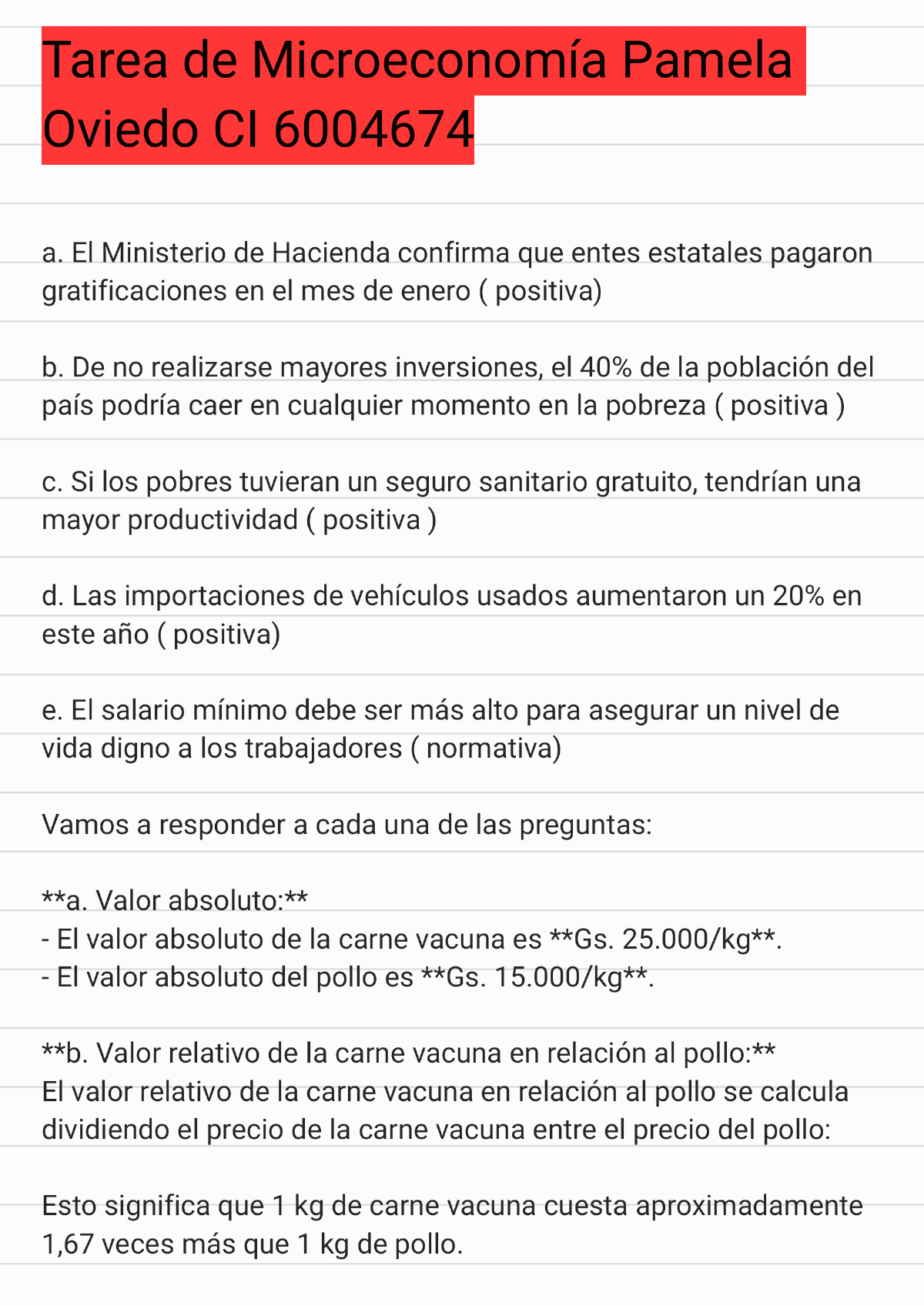 <p>Tarea de Microeconomía Pamela Oviedo CI 6004674 a. El Ministerio de Hacienda confirma que entes estatales pagaron gratificaciones en el mes de enero ( positiva) b. De no realizarse mayores inversiones, el 40% de la población del país podría caer en cualquier momento en la pobreza ( positiva) C. Si los pobres tuvieran un seguro sanitario gratuito, tendrían una mayor productividad ( positiva) d. Las importaciones de vehículos usados aumentaron un 20% en este año (positiva) e. El salario mínimo debe ser más alto para asegurar un nivel de vida digno a los trabajadores ( normativa) Vamos a responder a cada una de las preguntas: a. Valor absoluto:** - El valor absoluto de la carne vacuna es **Gs. 25.000/kg** - El valor absoluto del pollo es **Gs. **b. Valor relativo de la carne vacuna en relación al pollo:** El valor relativo de la carne vacuna en relación al pollo se calcula dividiendo el precio de la carne vacuna entre el precio del pollo: Esto significa que 1 kg de carne vacuna cuesta aproximadamente 1,67 veces más que 1 kg de pollo.</p><p>C. Valor relativo del pollo en relación a la carne vacuna:** El valor relativo del pollo en relación a la carne vacuna se calcula dividiendo el precio del pollo entre el precio de la carne vacuna: Esto significa que 1 kg de pollo cuesta aproximadamente el 60% del precio de 1 kg de carne vacuna. Bienes de Consumo:** - Libros - Pan - Gaseosa - Carne - Automóvil Bienes de Capital o de Producción: - Heladera - Envasadora - Tractor - Motor de arranque - Máquina de coser industrial Bienes Aguja - Harina - Hilo - Cámara de cubierta - Software - Madera - Pila - Varillas de hierro</p><p>Bienes Libres:* - Luz solar - Aire - Agua del mar</p>