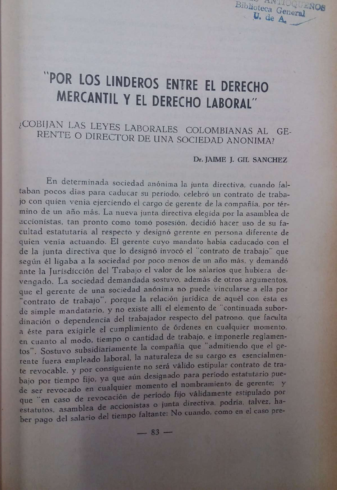 <p>Biblioteca General QUENOS U. de A "POR LOS LINDEROS ENTRE EL DERECHO MERCANTIL Y EL DERECHO LABORAL" COBIJAN LAS LEYES LABORALES COLOMBIANAS AL GE- RENTE O DIRECTOR DE UNA SOCIEDAD ANONIMA? Dr. JAIME J. GIL SANCHEZ En determinada sociedad anónima la junta directiva, cuando fal- taban pocos para caducar su celebró un contrato de traba- jo con quien venia ejerciendo el cargo de gerente de la por tér- mino de un año más. La nueva junta directiva elegida por la asamblea de accionistas, tan pronto como tomó posesión, decidió hacer uso de su fa- cultad al respecto y designó gerente en persona diferente de quien actuando. El gerente cuyo mandato habia caducado con el de la junta directiva que lo designó invocó el "contrato de trabajo" que según él ligaba a la sociedad por poco menos de un año más, y demandó ante la Jurisdicción del Trabajo el valor de los salarios que hubiera de- vengado. La sociedad demandada sostuvo, además de otros argumentos, que el gerente de una sociedad anónima no puede vincularse a ella por "contrato de porque la relación jurídica de aquél con ésta es de simple mandatario, y no existe alli el elemento de "continuada subor- dinación o dependencia del trabajador respecto del patrono, que faculta a éste para exigirle el cumplimiento de órdenes en cualquier momento, en cuanto al tiempo o cantidad de trabajo, e imponerle reglamen- tos". Sostuvo subsidiariamente la que "admitiendo que el ge- rente fuera empleado laboral, la naturaleza de su cargo es esencialmen- te y por consiguiente no será válido estipular contrato de tra- bajo tiempo fijo, ya que aún designado para estatutario pue- de ser por revocado en cualquier momento el nombramiento de gerente; y "en caso de revocación de fijo estipulado por que estatutos, asamblea de accionistas o junta directiva, ha- ber pago del salario del tiempo faltante: No cuando, como en el caso pre- 83</p><p>sente, el nombramiento no de la junta a quien desig- nar para fijo". El Tribunal del Trabajo de Medellin, no ni extensa ni sucintamente, esta argumentación, basándose acaso en las presunciones de los arts. 24 y 25 del actual Código Sustantivo del Trabajo. El autor del presente estudio, quien por razones inherentes a su oficio, prohijó las tesis de la sociedad demandada que atrás se mencionaron, desea ahora afirmarse entusiastamente en ellas, después de haber hecho la revisión de la doctrina nacional y extranjera sobre la fisonomía de los per- soneros de las sociedades anónimas. RELACION JURIDICA ENTRE LA SOCIEDAD ANONIMA Y su GERENTE O DIRECTOR. Es de la esencia de la sociedad anónima, y por consiguiente requisito sine qua non de la licitud de su funcionamiento, su ad- ministración por MANDATARIOS REVOCABLES como define el art. 4o. de la Ley 26 de 1922, o sea el art. 550 del Código de Co- mercio de o MANDATARIOS RESPONSABLES Y RE- MOVIBLES EN CUALQUIER TIEMPO -como decidió promulgar el Decreto 2521 de 1950, por el cual se integra la materia de sociedades anónimas en este país.-En diversas disposiciones legales se in- siste en el Código de Comercio en la absoluta revocabilidad en cualquier tiempo de un administrador o director de sociedad anónima. Asi, la prin- cipal de ellas reza "Art. 582. La sociedad anónima es administrada por MANDA- TARIOS TEMPORALES Y REVOCABLES, asociados o no asalariados o GRATUITOS, elegidos en la forma que previenen los estatutos de la sociedad. "Por cada gerente o administrador que se nombre, se elegirán dos suplentes, que reemplacen a aquél, por su orden, en sus faltas. "SON DE NINGUN EFECTO LAS CLAUSULAS QUE TIENDAN A ESTABLECER LA IRREVOCABILIDAD DE LOS ADMINISTRADORES, aun cuando su nombramiento sea una de las condiciones del contrato social". El Decreto 2521 de 1950 repite en sus arts. 123 y 124 el contenido jurídi- de la anterior agregando que los mandatarios de la ciedad anónima "llevarán la representación legal de la El 133 del mismo Decreto dice:</p><p>"En silencio del estatuto DEL será de NOMBRAMIENTO un año, SIN PERJUICIO el periodo DE del LA gerente REVOCABILIDAD o administrador Conviene entre aún la sociedad para una mejor de la relación del 2521 citado: Decreto y su administrador. gerente o director, el art. 128 ju- cios "Las Facultades de los gerentes se extenderán a todos los minados actos pertenecientes al giro o tráfico de la empresa, deter- nego- en la claúsula del objeto social, si los estatutos no las li- mitaren Y, en cuanto a la rige esta norma, que es el art. 130 del mismo Decreto y a la vez el art. 583 del Código de Comercio: "Los gerentes son responsables de la ejecución de su mandato en los términos establecidos en los estatutos y en las leyes.-Es nu- la toda estipulación tendiente a absolver de esa responsabilidad a los administradores, o a limitarla al importe de las cauciones reales o personales que hayan prestado". En acuerdo con las transcritas disposiciones y con las de ellas correlati- vas en la legislación colombiana, el gerente, administrador o director de una sociedad anónima es, claramente, un mandatario. Pero a la vez es un representante legal. Aún es algo más: órgano necesario de la sociedad, y como al menos para un buen número de teorizantes autorizados, es ante terceros la sociedad misma. jurídicas no pueden obrar sino por el medio de la sus so- "Las personas personas naturales; faltando gerente, la im- órganos, que son del órgano principal de comunicación, existencia y, en legal, ciedad carece representada, no puede tener Félix posibilidad pasaría de ser de la ficción a la realidad" (Prof. porque no al Código de Comercio"). lanzarnos a una breve colección porque de talvez opiniones no esté extranjeras publicada sobre hoy Antes dia tendencia en de edición de conviene Sociedades accesible hacer al conocer, público 85 tiene sentada la doctrina en esta materia, que la Superin- a saber: do este</p><p>"El gerente o presidente de una sociedad anónima-con el cual deben nombrarse dos suplentes