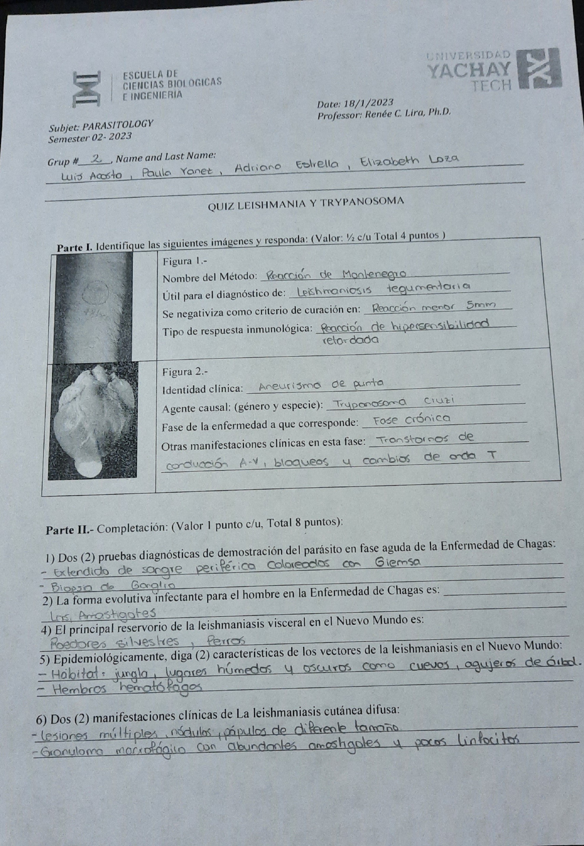 <p>UNIVERSIDAD ESCUELA DE YACHAY CIENCIAS BIOI OGICAS TECH E INGENIERIA Date: 18/1/2023 Professor: Renée C. Lira, Ph.D. Subjet: PARASITOLOGY Semester 02-2023 Grup Luis Acosta Paula Adriana Elizabeth Loza # 2 Name and Last Name: QUIZ LEISHMANIA Y TRYPANOSOMA Parte I. Identifique las siguientes imágenes y responda: (Valor: 1/2 c/u Total 4 puntos ) Figura Nombre del Método: Reaccion de Montenegro Útil para el diagnóstico de: Leishmaniosis Se negativiza como criterio de curación en: Reaccion menor 5mm Tipo de respuesta inmunológica: Reaccion de Figura 2.- Identidad clínica: Aneurisma de Agente causal: (género y especie): cruzi Fase de la enfermedad a que corresponde: Fase crónica Otras manifestaciones clínicas en esta fase: Transtornos de bloqueos 4 cambios de T Parte II.- Completación: (Valor 1 punto c/u, Total 8 puntos): 1) Dos (2) pruebas diagnósticas de demostración del parásito en fase aguda de la Enfermedad de Chagas: - Extendido de periférica Giemsa - Biopsia de Gonglio 2) La forma evolutiva infectante para el hombre en la Enfermedad de Chagas es: 4) El principal reservorio de la leishmaniasis visceral en el Nuevo Mundo es: Amastigates Roedores silvestres Perros 5) Hobitat: lugares 4 oscuros agujeros de Epidemiológicamente, diga (2) características de los vectores de la leishmaniasis en el Nuevo Mundo: Hembros hemato 6) Dos (2) manifestaciones clínicas de La leishmaniasis cutánea difusa: - lesiones multiples pápulos de Granuloma can abundantes 4 pocos linfocitos</p><p>7) La Leihsmaniasis muco-cutánea es producida por especies del Complejo: Leishmania Braziliensis 8) Los órganos más frecuentes afectados por Kala azar son: Y Bazo Parte II.- - En relación a su ciclo evolutivo complete el siguiente esquema: (Valor 1/2 c/u, Total: 7 puntos) Género y especie del vector en el Ciclo domiciliario: A Genero: i Cruzi Identifique las formas evolutivas en el esquema: A) Epimastigota B) Tripomastigota metocíclicos (colon) D G E C) Tripomostigota D) E) (sangre) F) G) Tripomastigota ingestado Parte III. - En relación con la patogenia de la Leishmaniasis Cutánea Localizada diga dos (2) características de la fase inicial las lesiones. Las lesiones son por un granuloma circulares 4 bien</p>