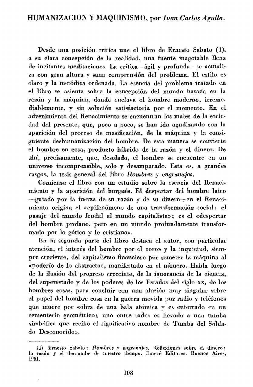 <p>HUMANIZACIÓN Y MAQUINISMO, por Juan Carlos Agulla,</p><p>Desde una posición crítica une el l ibro de Ernesto Sabato (1),</p><p>a su clara concepción de la realidad, una fuente inagotable llena</p><p>de incitantes meditaciones. La crítica—ágil y profunda—se actuali</p><p>za con gran altura y sana comprensión del problema. E l estilo es</p><p>claro y la metódica ordenada. La esencia del problema tratado en</p><p>el l ibro se asienta sobre la concepción del mundo basada en la</p><p>razón y la máquina, donde enclava el hombre moderno, irreme</p><p>diablemente, y sin solución satisfactoria por el momento. En el</p><p>advenimiento del Renacimiento se encuentran los males de la socie</p><p>dad del presente, que, poco a poco, se han ido agudizando con la</p><p>aparición del proceso de masificación, de la máquina y la consi</p><p>guiente deshumanización del hombre. De esta manera se convierte</p><p>el hombre en cosa, producto híbrido de la razón y el dinero. De</p><p>ahí, precisamente, que, desolado, el hombre se encuentre en un</p><p>universo incomprensible, solo y desamparado. Esta es, a grandes</p><p>rasgos, la tesis general del libro Hombres y engranajes.</p><p>Comienza el l ibro con u n estudio sobre la esencia del Renaci</p><p>miento y la aparición del burgués. El despertar del hombre laico</p><p>—guiado por la fuerza de su razón y de su dinero—en el Renaci</p><p>miento origina el «epifenómeno de una transformación social : el</p><p>pasaje del mundo feudal al mundo capitalista» ; es el «despertar</p><p>del hombre profano, pero en un mundo profundamente transfor</p><p>mado por lo gótico y lo cristiano».</p><p>En la segunda par te del l ibro destaca el autor, con particular</p><p>atención, el interés del hombre por el «oro» y la inquietud, siem</p><p>pre creciente, del capitalismo financiero por someter la máquina al</p><p>«poderío de lo abstracto», manifestado en el número. Habla luego</p><p>de la ilusión del progreso creceinte, de la ignorancia de la ciencia,</p><p>del superestado y de los poderes de los Estados del siglo XX, de los</p><p>hombres cosas, para concluir con una alusión muy singular sobre</p><p>el papel del hombre cosa en la guerra movida por radio y teléfonos</p><p>que muere por «obra de una bala atómica y es enterrado en un</p><p>cementerio geométrico; uno entre todos es llevado a una tumba</p><p>simbólica que recibe el significativo nombre de Tumba del Solda</p><p>do Desconocido».</p><p>(1) Ernesto Sabato : Hombres y engranajes. Reflexiones sobre el dinero ;</p><p>la razón y el derrumbe de nuestro tiempo. Emecé Editores. Buenos Aires,</p><p>1951.</p><p>108</p><p>La tercera parte ¿el libro trata de la «Rebelión del Hombre».</p><p>Comienza con un estudio de la dialéctica de la crisis, y destaca</p><p>luego la acción de las fuerzas contrapuestas de la Historia en cons</p><p>tante interacción, que es precisamente donde se encuenta el meollo</p><p>de la sociedad moderna. Luego habla—sin lugar a duda, con gran</p><p>conocimiento pei-sona!—del marxismo, al que solidariza al mundo</p><p>del dinero y la enraiza bajo el signo de la ciencia y la técnica.</p><p>Luego se detiene en la reacción existencial del hombre ante el</p><p>derrumbe de la civilización tecnológica a causa del interés de la</p><p>ciencia y la filosofía por descubrir, objetivamente, las leyes que</p><p>rigen el Universo para ponerlas a su servicio. Esta prescindencia</p><p>del «yo», por el uso desoi\bitado de la razón y la observación, cul</p><p>mina en Kierkegaard con la i-ebelión del hombre contra lo abs</p><p>tracto y lo general.</p><p>En la cuarta parte del l ibro, Sabato se detiene a analizar el des</p><p>arrollo de la crisis de las letras ylas artes. El hombre moderno</p><p>encuentra en la literatura y la novela el medio de llegar a su pro</p><p>pia reivindicación al no poder trascender su propio «yo», ya que</p><p>hasta los mismos paisajes se transforman en estados de alarma y</p><p>no en apreciaciones objetivas o descriptivas. Al arte lo hace tras</p><p>cender el concepto de realidad, y considera al arte moderno como</p><p>una reacción lógica «contra la civilización burguesa, y en el que</p><p>su propoi «Weltanschaung» se desentiende de su realidad, y, a</p><p>menudo, lo hace trizas». Considera a la li teratura trágica de hoy</p><p>«com la representación de los problemas esenciales del h tmbre y</p><p>su destino», y en la que no se busca a la belleza en sí, sino al</p><p>fondo de los problemas, es decir, intentar «profundizar el sentido</p><p>de la existencia». Por eso es que cree que la literatura ha esca</p><p>pado, solapadamente, del campo de las bellas artes para ingresar</p><p>en el campo, siempre espinoso, de la metafísica. Termina Sabato</p><p>su corto pero intensísimo libro sosteniendo que el «hombre no es</p><p>el estrecho y angustioso territorio de su propio «yo», n i el abstracto</p><p>dominio de la colectividad, sino esa tierra intermedia en que suele</p><p>acontecer el amor, la amistad, la comprensión, la piedad. Sólo</p><p>el reconocimento de este principio nos permitirá fundar comuni</p><p>dades auténticas y no máquinas sociales». Y la última pregunta :</p><p>«¿Por qué buscar lo absoluto fuera del t iempo y no en esos ins</p><p>tantes fugaces, pero poderosos, en que, al escuchar algunas notas</p><p>musicales o al oír la voz de un semejante, sentimos que la vida</p><p>tiene un sentido absoluto?», da a su libro algo, no mucho, de es</p><p>peranza, cuando pareciera que, después de su destructiva crítica,</p><p>ya nada quedaba en pie.</p><p>109</p>