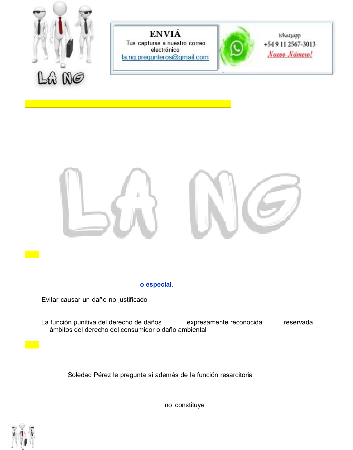 <p>29-06-2023 - Derecho de Daños - 1er Parcial - NG</p><p>Página 1</p><p>“Inteligencia artificial para que me copien los escritos de abogacía… Y no tienen mi ADN</p><p>ni con cuatrocientos clones.”</p><p>X</p><p>NUEVAS RESALTADAS / FRECUENTES NUMERACION MARCADA</p><p>1 El principio de reparación plena o integral: Implica colocar al damnificado en situación igual o</p><p>similar aquella en que se encontraba antes del hecho lesivo.</p><p>1.1.2 Seleccione la opción correcta: ¿Cuáles eran las funciones que el anteproyecto del Código Civil y</p><p>Comercial del año 2012 establecía para la responsabilidad civil? Preventiva, resarcitoria y punitiva.</p><p>1.1.2 Indique cuáles son exclusivamente las funciones del derecho de Daños en el Código Civil y</p><p>Comercial: La prevención y la reparación.</p><p>1.1.2 ¿Cuáles son exclusivamente las funciones del derecho de Daños en el Código Civil y Comercial?:</p><p>La prevención y la reparación.</p><p>1.1.2 ¿Cuáles son las funciones que tiene la responsabilidad civil? Seleccione la opción correcta:</p><p>Preventiva y Reparadora.</p><p>1.1.2 ¿A qué función de la responsabilidad nos referimos con el siguiente enunciado? “Tiene en mira a</p><p>la víctima y en intentar colocarla en el estado que se encontraba antes del evento dañoso” Reparadora</p><p>1.1.2 ¿Cuántas funciones establecía para la responsabilidad civil el anteproyecto del Código Civil y</p><p>Comercial del año 2012?: Tres funciones.</p><p>1.1.2 La función de prevención de la responsabilidad civil presenta dos formas: Una de carácter</p><p>general y otra de carácter específico o especial.</p><p>1.1.2 Evitar causar un daño no justificado, conforme nuestro Código Civil y Comercial de la Nación, se</p><p>corresponde con: La función Preventiva del Derecho de Daños.</p><p>1.1.2 La función punitiva del derecho de daños ha sido expresamente reconocida y está reservada para</p><p>algunos ámbitos del derecho del consumidor o daño ambiental: Falso.</p><p>1.1.2 Se presenta en su estudio Soledad Pérez y le dice que 02.07.2019, aproximadamente a las 7:40</p><p>horas, salió de su domicilio para comprar comestibles en un supermercado. Que adquirió una botella de</p><p>salsa para su consumo personal. Que al llegar a su domicilio se dio cuenta que dentro de la botella –</p><p>que estaba cerrada- se encontraba flotando un cuerpo extraño. Que parecía ser una colilla de cigarrillo.</p><p>Así las cosas, Soledad Pérez le pregunta si además de la función resarcitoria es posible efectuar algún</p><p>otro planteo, conforme la Ley de Defensa del Consumidor: Es posible plantear daño punitivo por</p><p>tratarse de una relación de consumo.</p><p>1.1.3 Indique cuál de las siguientes opciones no constituye uno de los principios fundamentales del</p><p>derecho de daños: Principio de solidaridad.</p><p>ariel_G</p><p>Resaltar</p><p>ariel_G</p><p>Resaltar</p><p>ariel_G</p><p>Resaltar</p><p>ariel_G</p><p>Resaltar</p><p>ariel_G</p><p>Resaltar</p><p>ariel_G</p><p>Resaltar</p><p>ariel_G</p><p>Resaltar</p><p>ariel_G</p><p>Resaltar</p><p>ariel_G</p><p>Resaltar</p><p>ariel_G</p><p>Resaltar</p><p>ariel_G</p><p>Subrayado</p><p>ariel_G</p><p>Subrayado</p><p>ariel_G</p><p>Subrayado</p><p>ariel_G</p><p>Subrayado</p><p>29-06-2023 - Derecho de Daños - 1er Parcial - NG</p><p>Página 2</p><p>“Inteligencia artificial para que me copien los escritos de abogacía… Y no tienen mi ADN</p><p>ni con cuatrocientos clones.”</p><p>X</p><p>1.1.3 La función punitiva del derecho de daños: Se dirige a lograr el pleno desmantelamiento de los</p><p>efectos del ilícito.</p><p>1.1.3 El principio Neminemlaedere significa: Que todo daño causado a otro se presume antijurídico,</p><p>salvo que medie causa de justificación.</p><p>1.2.1 ¿El principio Nemimemlaedere ha sido receptado expresamente en el Código Civil y Comercial de</p><p>la Nación?: Sí, en el Art. 1716.</p><p>1.2.2 Uno de los principios del derecho de daños versa “habrá responsabilidad siempre que exista un</p><p>autor que actúe con dolo o culpa”: Falso.</p><p>1.2.2 Los factores de atribución subjetivos son: Seleccione las 2 (dos) respuestas correctas: 1) El dolo,</p><p>2) La culpa. (NO VAN: La equidad, El riesgo creado, La garantía.)</p><p>1.2.2 Los factores de atribución pueden ser: Objetivos o Subjetivos.</p><p>1.2.2 La culpa, como factor subjetivo de atribución, comprende: Seleccione las 3 (tres) respuestas</p><p>correctas: 1) La imprudencia, 2) La impericia en el arte o profesión, 3) La negligencia. (NO VAN:</p><p>La premeditación, La intencionalidad.)</p><p>1.2.4 “No existe deber ni transgresión sin norma que lo imponga”, se refiere al: Principio de reserva.</p><p>1.2.5 Cuando el artículo 1710 del C. C. y dispone a todas las personas “el deber de evitar un daño no</p><p>justificado” ¿Se refiere a una función de la responsabilidad civil?: Sí, la preventiva.</p><p>1.2.5 Seleccione las 4 (cuatro) opciones correctas. Dentro de la función preventiva del derecho de</p><p>daños. Toda persona tiene el deber, en cuanto de ella dependa, de: 1) No agravar el daño, si ya se</p><p>produjo, 2) Evitar causar un daño que no se encuentre justificado, 3) Adoptar, de buena fe y</p><p>conforme a las circunstancias, las medidas razonables para disminuir su magnitud, 4) Adoptar,</p><p>de buena fe y conforme a las circunstancias, las medidas razonables para evitar que se produzca</p><p>un daño (NO VA: Indemnizar a un tercero que lo alegue.)</p><p>1.2.5 Seleccione las 2 (dos) opciones correctas. Dentro de la acción preventiva es posible afirmar que:</p><p>1) La sentencia que admite la acción preventiva debe disponer, a pedido de parte o de oficio, en</p><p>forma definitiva o provisoria, obligaciones de hacer o no hacer, según corresponda, 2) La</p><p>sentencia que admite la acción preventiva debe disponer, a pedido de parte o de oficio, en forma</p><p>definitiva o provisoria, obligaciones de dar