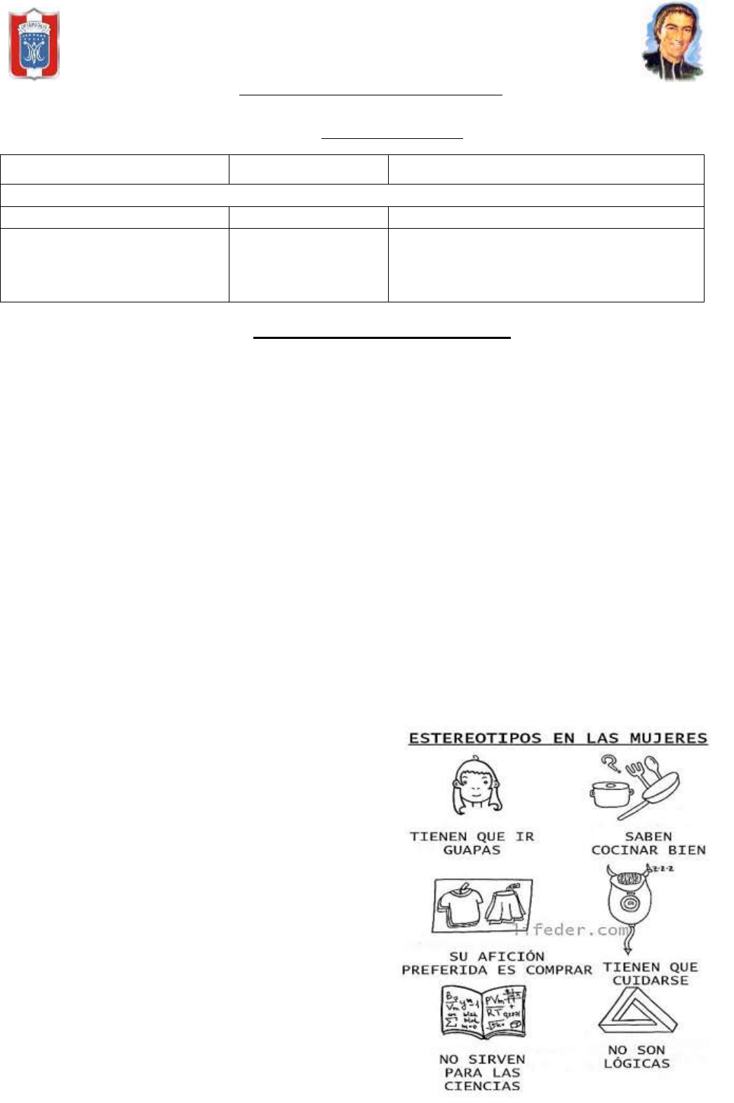 <p>I.E. “Champagnat” Sub Dirección de Formación</p><p>Tacna General</p><p>FICHA DE APLICACIÓN DOMICILIARIA N° 13</p><p>TÍTULO DE LA UNIDAD: “VIVENCIANDO EL ESPÍRITU MARISTA A TRAV��S DE UNA CULTURA DE PAZ”</p><p>TEMA: “DECIDO SER YO MISMO”</p><p>¿CON MIS AMIGOS, SOY YO MISMO?</p><p>Cuando formo parte de un grupo, a veces nos sentimos seguros, ya que de alguna manera fortalecemos</p><p>nuestra autoestima, ya que de cierta forma y a través del proceso de SOCIALIZACIÓN, sentimos que</p><p>pertenecemos a ese grupo, y esto nos hace capaces de participar, expresar nuestras ideas y puntos de</p><p>vista, es decir actuamos tal como somos, por lo que podemos decir que estamos siendo auténticos,</p><p>siendo nosotros mismos.</p><p>¿Pero qué pasa cuando imitamos a alguien?, cuando esto sucede, estamos dejando de ser auténticos,</p><p>y se va debilitando nuestra identidad personal, porque estamos tratando de ser “otro”, lo que implica que</p><p>estoy dejando de ser “Yo mismo”.</p><p>¿Y.. Qué es socialización?</p><p>Se denomina socialización al proceso a través del cual los seres humanos aprenden e interiorizan las</p><p>normas y los valores de una determinada sociedad y cultura específica. Este aprendizaje les permite</p><p>obtener las capacidades necesarias para desempeñarse con éxito en la interacción social y los integra a</p><p>su personalidad.</p><p>A veces las personas y los amigos tienen una idea diferente de lo que somos, es decir tienen una</p><p>percepción equivocada de lo que verdaderamente somos, y no nos ayudan a reconocernos como seres</p><p>humanos, esto debido a la serie de estereotipos y prejuicios que predomina actualmente en nuestra</p><p>sociedad, lo que a veces culmina con la discriminación.</p><p>Pero………………. ¿qué son estereotipos, prejuicios y discriminación?, veamos, conozcamos a que se</p><p>refieren cada uno de ellos:</p><p>ESTEREOTIPO: El estereotipo es un concepto, idea</p><p>o modelo de imagen que se le atribuye a las</p><p>personas o grupos sociales, muchas veces de</p><p>manera preconcebida y sin fundamentos teóricos.</p><p>Los estereotipos se aprenden a lo largo del</p><p>proceso de socialización de los individuos,</p><p>heredados de su cultura o muchas veces de</p><p>sus progenitores o familias. Nadie nace con ellos,</p><p>todos son 100% aprendidos, pero una vez</p><p>incorporados a la idea que tenemos del mundo,</p><p>resultan particularmente difíciles de erradicar.</p><p>Ejemplos:</p><p>*Los chicos debe proteger a las chicas</p><p>*Las mujeres son menos inteligentes que los hombres.</p><p>*Los hombres no deben llorar, solo las mujeres.</p><p>*los niños que juegan con muñecas son afeminados.</p><p>ÁREA: DESARROLLO PERSONAL.</p><p>CIUDADANÍA Y CÍVICA</p><p>NIVEL: SECUNDARIA GRADO Y SECCIÓN: 2° “A, B, C, D”</p><p>DOCENTE: ROBERTO FLORES PACHECO - NORMA ZAPATA CHAGUA</p><p>COMPETENCIA CAPACIDAD DESEMPEÑO</p><p>Construye su identidad Reflexiona y argumenta</p><p>éticamente</p><p>Se relaciona con sus compañeros y compañeras con</p><p>equidad o igualdad y analiza críticamente situaciones de</p><p>desigualdad de género y violencia familiar, sexual y contra</p><p>la mujer, y asume posición frente a los estereotipos y</p><p>discriminación.</p><p>https://concepto.de/socializacion/</p><p>https://concepto.de/cultura/</p><p>https://concepto.de/progenitor/</p><p>https://concepto.de/familia/</p><p>I.E. “Champagnat” Sub Dirección de Formación</p><p>Tacna General</p><p>PREJUICIO: Un prejuicio es un pensamiento negativo que alguien</p><p>emite sobre una persona, cosa o situación sin tener</p><p>verdadero conocimiento sobre eso.</p><p>Un prejuicio se hace antes de conocer realmente aquella cosa o</p><p>persona de la que se está emitiendo un juicio.</p><p>Los prejuicios pueden ser de carácter negativo o positivo.</p><p>Ejemplos:</p><p>DISCRIMINACIÓN: La discriminación es el trato desigual a una persona o colectividad por motivos</p><p>raciales, religiosos, políticos, de sexo, de edad, de condición</p><p>física o mental, entre otros, y es el resultado de los prejuicios y</p><p>estereotipos.</p><p>Ejemplos:</p><p>* “Yo no me junto con él porque es serrano”</p><p>* “Yo no juego con las mujeres, porque no saben jugar”</p><p>* Para trabajar en el Banco generalmente se solicita “Srtas., con</p><p>buena presencia”</p><p>Todo Estereotipo, prejuicio y discriminación se relacionan con “YO” Pienso, Siento, Actúo, Ejemplo:</p><p>CUANDO VEO A UN “NEGRO”</p><p>PIENSO SIENTO ACTÚO</p><p>Que es: un ladrón, es sucio y es</p><p>falso</p><p>Siento por él: Rechazo, asco, y</p><p>miedo</p><p>Cuando lo veo: me pongo</p><p>alerta, no lo quiero ver, no le</p><p>creo lo que me diga.</p><p>ESTEROTIPO PREJUICIO DISCRIMINACIÓN</p><p>Es un componente cognitivo</p><p>(Relacionado con el conocimiento)</p><p>Es un componente emotivo</p><p>(Relacionado con la expresión de</p><p>emociones)</p><p>Es un componente conativo</p><p>(Que intenta modificar la conducta</p><p>de quien lo recibe)</p><p>ACTIVIDADES: Al costado de las siguientes imágenes: Da tu opinión sobre lo que se observa</p><p>__________________________________________</p><p>______________________________________________</p><p>_________________________________________</p><p>¿Qué piensa tu papá/mamá al respecto?</p><p>__________________________________________</p><p>__________________________________________</p><p>__________________________________________</p><p>__________________________________________</p><p>Nombre del estudiante: _______________________________________ Segundo año - Sección: _____</p><p>SEMANA N°_________________</p><p>Coordinación de Ciencias Sociales RFP/2020</p><p>Prejuicio hacia una persona en particular Prejuicio hacia un grupo o colectividad</p><p>Pensar que una persona es irresponsable porque no</p><p>se peina</p><p>Considerar que todos los musulmanes son</p><p>violentos</p><p>Creer que una persona q