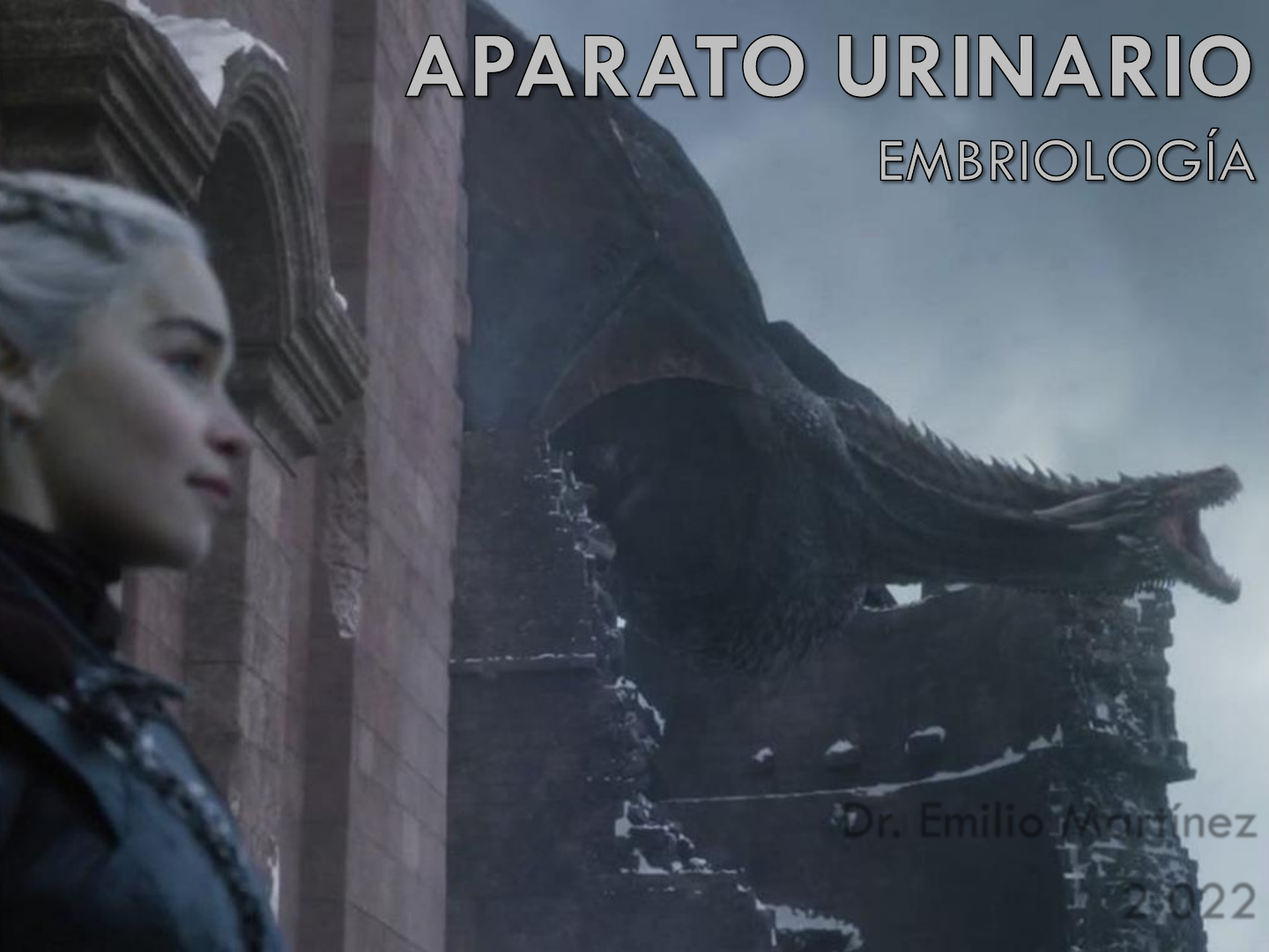 <p>APARATO URINARIO</p><p>EMBRIOLOGÍA</p><p>Dr. Emilio Martínez</p><p>2 022</p><p>El sistema genitourinario</p><p>Se divide funcionalmente en:</p><p>– Sistema urinario</p><p>– Sistema genital</p><p>Embriológica y anatómicamente se encuentran muy</p><p>relacionados:</p><p>Ambos se desarrollan del mesodermo intermedio,</p><p>a lo largo de la pared posterior de la cavidad</p><p>abdominal.</p><p>En un principio, la cloaca es una cavidad común donde</p><p>desembocan ambos sistemas (genital y urinario).</p><p>Sistema urinario</p><p>Para el desarrollo del aparato urinario, son 3</p><p>sistemas los que evolucionan de manera</p><p>concomitante:</p><p>Sistema renal</p><p>Sistema colector</p><p>Sistema excretor</p><p>Sistema renal: desarrollo del riñón</p><p>Intraútero, 3 sistemas renales superpuestos se</p><p>generan en una secuencia craneal a caudal:</p><p>– Pronefros</p><p>• El pronefros es rudimentario y no es funcional</p><p>– Mesonefros</p><p>• El mesonefros funciona corto tiempo en el feto temprano</p><p>– Metanefros</p><p>• El metanefros formará el riñón definitivo</p><p>Sistema renal: desarrollo del riñón</p><p>EL PRONEFROS</p><p>En la 4º semana: el pronefros aparece al inicio y</p><p>desaparece al final.</p><p>• 7 a 10 grupos de células en la región cervical.</p><p>• Estos grupos se denominan nefrotomas.</p><p>• Los nefrotomas degeneran antes que</p><p>aparezcan el mesonefros y el metanefros.</p><p>Sistema renal: desarrollo del riñón</p><p>EL MESONEFROS Y LOS CONDUCTOS</p><p>MESONÉFRICOS</p><p>• Origen en región torácica-lumbar superior (L3).</p><p>• Hemos de reconocer eventos que ocurren:</p><p>A la cuarta semana (1º mes)</p><p>A la sexta semana (Mitad del 2º mes)</p><p>Sistema renal: desarrollo del riñón</p><p>EL MESONEFROS Y LOS CONDUCTOS MESONÉFRICOS</p><p>En la 4º semana:</p><p>• Aparecen los túbulos del mesonefros.</p><p>• Los túbulos se alargan y forman un asa en forma</p><p>de S</p><p>• En el extremo medial: los túbulos adquieren una</p><p>red capilar que formará un glomérulo</p><p>– Alrededor de este glomérulo, los túbulos originan una</p><p>cápsula de Bowman</p><p>• En el extremo lateral: los túbulos penetran en un</p><p>conducto colector longitudinal, llamado</p><p>conducto mesonéfrico o conducto de Wolff</p><p>Sistema renal: desarrollo del riñón</p><p>EL MESONEFROS Y LOS CONDUCTOS MESONÉFRICOS</p><p>En la 6º semana (2º mes):</p><p>• El mesonefros forma un órgano ovoide a ambos</p><p>lados de la línea media.</p><p>• Cresta urogenital: prominencia formada por los 2</p><p>órganos.</p><p>• En un momento dado, los túbulos craneales (con sus</p><p>glomérulos) degeneran, mientras que</p><p>los túbulos caudales siguen diferenciándose.</p><p>– En el varón: persisten el conducto mesonéfrico y algunos</p><p>túbulos caudales, que formarán el sistema genital.</p><p>– En la mujer: el conducto mesonéfrico y todos los túbulos</p><p>desaparecen.</p><p>Sistema renal: desarrollo del riñón</p><p>EL METANEFROS</p><p>• Conformará el riñón permanente.</p><p>• Aparece en la 5º semana.</p><p>• Las unidades excretoras se desarrollan del</p><p>mesodermo metanéfrico, de la misma manera</p><p>que el sistema mesonéfrico.</p><p>• Las unidades colectoras se desarrollan desde otro</p><p>origen: la yema ureteral.</p><p>Repasito…</p><p>El sistema urogenital se desarrolla a partir de:</p><p>a) Endodermo</p><p>b) Ectodermo</p><p>c) Mesodermo lateral</p><p>d) Mesodermo paraaxial</p><p>e) Mesodermo intermedio</p><p>Repasito…</p><p>La cavidad común donde desembocan los</p><p>sistemas urinario y genital al principio del</p><p>desarrollo:</p><p>a) Metanefros</p><p>b) Cloaca</p><p>c) Yema ureteral</p><p>d) Mesonefros</p><p>e) Pronefros</p><p>Repasito…</p><p>Durante el desarrollo embrionario, los 3 sistemas</p><p>renales que se forman secuencialmente son:</p><p>Pronefros</p><p>Mesonefros</p><p>Metanefros</p><p>Repasito…</p><p>De las siguientes opciones, el sistema renal</p><p>rudimentario y no funcional en humanos:</p><p>a) Metanefros</p><p>b) Mesonefros</p><p>c) Pronefros</p><p>Repasito…</p><p>Formará el riñón del adulto:</p><p>a) Metanefros</p><p>b) Mesonefros</p><p>c) Pronefros</p><p>Repasito…</p><p>El pronefros aparece durante la __ semana del</p><p>desarrollo embrionario:</p><p>a) 3º</p><p>b) 4º</p><p>c) 5º</p><p>d) 6º</p><p>e) 7º</p><p>Repasito…</p><p>El sistema renal embrionario de ubicación</p><p>torácica-lumbar:</p><p>a) Metanefros</p><p>b) Mesonefros</p><p>c) Pronefros</p><p>Repasito…</p><p>El conducto mesonéfrico persiste en:</p><p>a) El varón</p><p>b) La mujer</p><p>c) Ambos</p><p>Repasito…</p><p>El metanefros aparece durante la __ semana del</p><p>desarrollo embrionario:</p><p>a) 3º</p><p>b) 4º</p><p>c) 5º</p><p>d) 6º</p><p>e) 7º</p><p>Sistema colector</p><p>• Los conductos colectores del riñon definitivo se</p><p>originan en la yema ureteral.</p><p>• La yema ureteral es una evaginación del conducto</p><p>mesonéfrico cercana a la cloaca.</p><p>• La yema ureteral dará origen a:</p><p>uréter, pelvis renal, cálices mayores, cálices</p><p>menores y 1 a 3 millones de túbulos colectores.</p><p>Sistema colector</p><p>• La yema penetra en el tejido metanéfrico y</p><p>tiene forma de casquete en su extremo distal.</p><p>• Más adelante, la yema se dilata para formar</p><p>la pelvis renal primitiva.</p><p>• La pelvis renal primitiva se divide en 2</p><p>porciones: craneal y caudal, que serán los</p><p>futuros cálices mayores.</p><p>Sistema colector</p><p>• Cada cáliz produce 2 yemas adicionales, y</p><p>cada yema continúa subdividiéndose hasta</p><p>crear unas 12 generaciones de túbulos.</p><p>• Los túbulos de 2º orden se agrandan e incluyen</p><p>a los de 3º y 4º orden para formar los cálices</p><p>menores.</p><p>• Los túbulos a partir del 5º orden se elongan,</p><p>convergen en el cáliz menor y forman la</p><p>pirámide.</p>