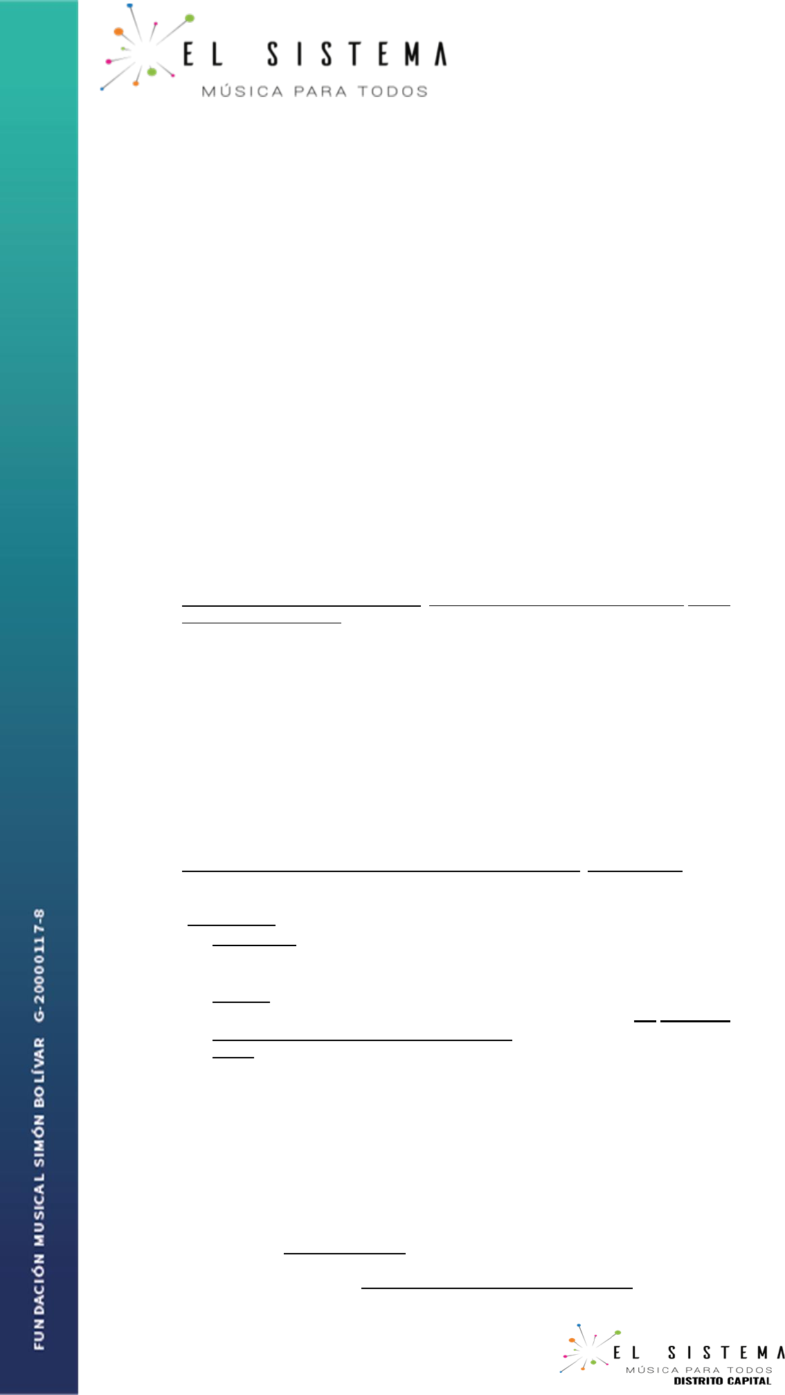 San Bernardino Torre Corpoelec Mezzanina 1, Caracas, Distrito Capital. Email: gedistritocapital@elsistema.org.ve NORMAS DE CONVIVENCIA PARA LOS NUCLEOS DEL DISTRITO CAPITAL LA FUNDACIÓN MUSICAL SIMÓN BOLÍVAR “EL SISTEMA” Esta normativa es de aplicación a cada niño, niña y adolescente perteneciente a los Núcleos del Distrito Capital, que forman parte de El Sistema Nacional de Orquestas y Coros Juveniles e Infantiles de Venezuela. Así como también estará dirigido a la población de padres, madres y representantes de nuestros beneficiarios como responsables de su crianza. Los núcleos estarán a cargo de velar por el cumplimiento de cada uno de los lineamientos que en este documento se establecen: 1. Cumplir con el uniforme del núcleo establecido (franela azul rey con el logo (en la posibilidad), pantalón Jeans sin rotos o mono azul y sus zapatos de gomas o colegiales). En caso de no poseerlo, acudir con la vestimenta adecuada (No Short, No Bermudas, No Gorras, No Licras, No Faldas Cortas, No Ropas Transparentes, No Escotes, No Chancletas, No Sandalias, o cualquier atuendo no acto para ingresar a una institución pública), no se considera límite para ningún ingreso al núcleo, que pueda ocurrir en una ocasión por desconocimiento o por omisión, brindándole la debida orientación, que debe acatar para su próxima asistencia. Cabe destacar que, una vez culminada las actividades académicas o ensayos de las Regionales, se deberá dejar de usar cualquier uniforme o atuendo que posea identidad institucional para proteger el uso de la marca ante lugares o acciones no apropiadas (ejemplo: licorerías, eventos particulares de índole personal) 2. UNIFORME PARA CONCIERTOS: (Camisa Blanca Manga larga o ¾, Pantalón Negro, Zapatos y medias negras). 3. La Fundación Musical Simón Bolívar “EL SISTEMA” no genera cobros por concepto de mensualidad, ni mucho menos por inscripción. Cabe destacar, que son los padres, madres y representantes quienes decidirán voluntariamente, si desean realizar aportes en beneficio de cada uno de los núcleos pertenecientes a la Fundación Musical Simón Bolívar, con la cantidad que estimen conveniente aportar. Además, que dicho aporte deberá ser administrado por el comité de representantes que sean elegidos por toda la población de padres, madres y representantes, que van a conformar la sociedad de amigos de EL SISTEMA, mediante la autogestión que implementa la institución. 4. Los padres, madres y representantes que tenga estudiantes en algunas de las orquestas (Esto aplica solo para las Orquestas Regionales o Nuevas Agrupaciones), deben proveer a su representado del siguiente uniforme para los conciertos y presentaciones: UNIFORME: • Caballeros: pantalón negro, camisa manga larga blanca y/o negra (según la actividad). Medias negras. Zapatos negros de vestir (unicolor). • Damas: Camisa manga larga o ¾ color blanca y/o negra (según la actividad). Pantalón negro de vestir, Zapatos cerrados negros (o tacón de 5 cm), no sandalias, no zapatos de goma de trenzas ni descotes. Nota: El incumplimiento del uniforme, traerá como sanción, la no participación en el evento. 5. El horario de Entrada y Salida de los estudiantes, serán establecidas mediante lineamientos de la Fundación Musical Simón Bolívar “EL SISTEMA” a cada uno de los Núcleos. (Sujeto a cambio). Es obligatorio la disciplina y puntualidad. mailto:gedistritocapital@elsistema.org.ve San Bernardino Torre Corpoelec Mezzanina 1, Caracas, Distrito Capital. Email: gedistritocapital@elsistema.org.ve 6. Es importante que sea del conocimiento de los representantes que el horario correspondiente a su representado es según su edad y agrupación, los cuales deben estar puntualmente a la hora de entrada de cada niños, niñas y adolescentes. Aunado a esto, siguiendo las regulaciones establecidas en las instituciones educativas, los representantes NO permanecerán en las instalaciones del núcleo, a la espera de los estudiantes, respetando los mecanismos que se utilizan para preservar las medidas de seguridad, de no aglomeración de personas y no perturbación de las actividades que se desarrollan en el Núcleo. Así mismo, se exige la presencia de los padres, madres y representantes, 10 minutos antes a la hora de salida en el núcleo. Los representantes de cada uno de los estudiantes, deberán hacer el retiro de su representando en la hora estipulada para su salida. En caso de generarse algún retardo que sobrepase la hora de salida, se harán tres (03) llamados de atención para que se haga el retiro de su representado a la hora indicada. Es importante mencionar, que pasado esos tres (03) llamados de atención y haber hecho caso omiso a las indicaciones del núcleo, se acudirá al consejo de protección más cercano al mismo, para que se realice el retiro del representado en ese lugar. 7. Es importante que se realicen las notificaciones a la Dirección o Coordinación de su ausencia a través de justificativos validos que se presenten por escrito, en relación, a que con el 30% (2 meses) de las inasistencias en las actividades generales realizadas por el núcleo, no podrán asistir a los conciertos y eventos especiales. 8. Al ingresar al núcleo, “NO” se podrá salir sin autorización o justificativo de su representante por escrito, aplica para todos los niños, niñas y adolescentes. No obstante, deberán permanecer en las áreas asignadas durante las clases o el descanso. 9. Las faltas de respeto graves y el uso de un vocabulario inadecuado a sus compañeros o al personal del núcleo serán motivo de sanción. Considerándose lo siguiente: • Es de obligatorio cumplimiento guardar el debido respeto hacia el Director (a), Coordinador (a), Apoyo Musical, Formador Integral Académico Musical (FIAM), Maestros, Personal administrativo y obrero, con los valores impartidos en casa y colegios, manteniendo un vocabulario y tono de voz adecuado en el Núcleo. • Evitar el contac