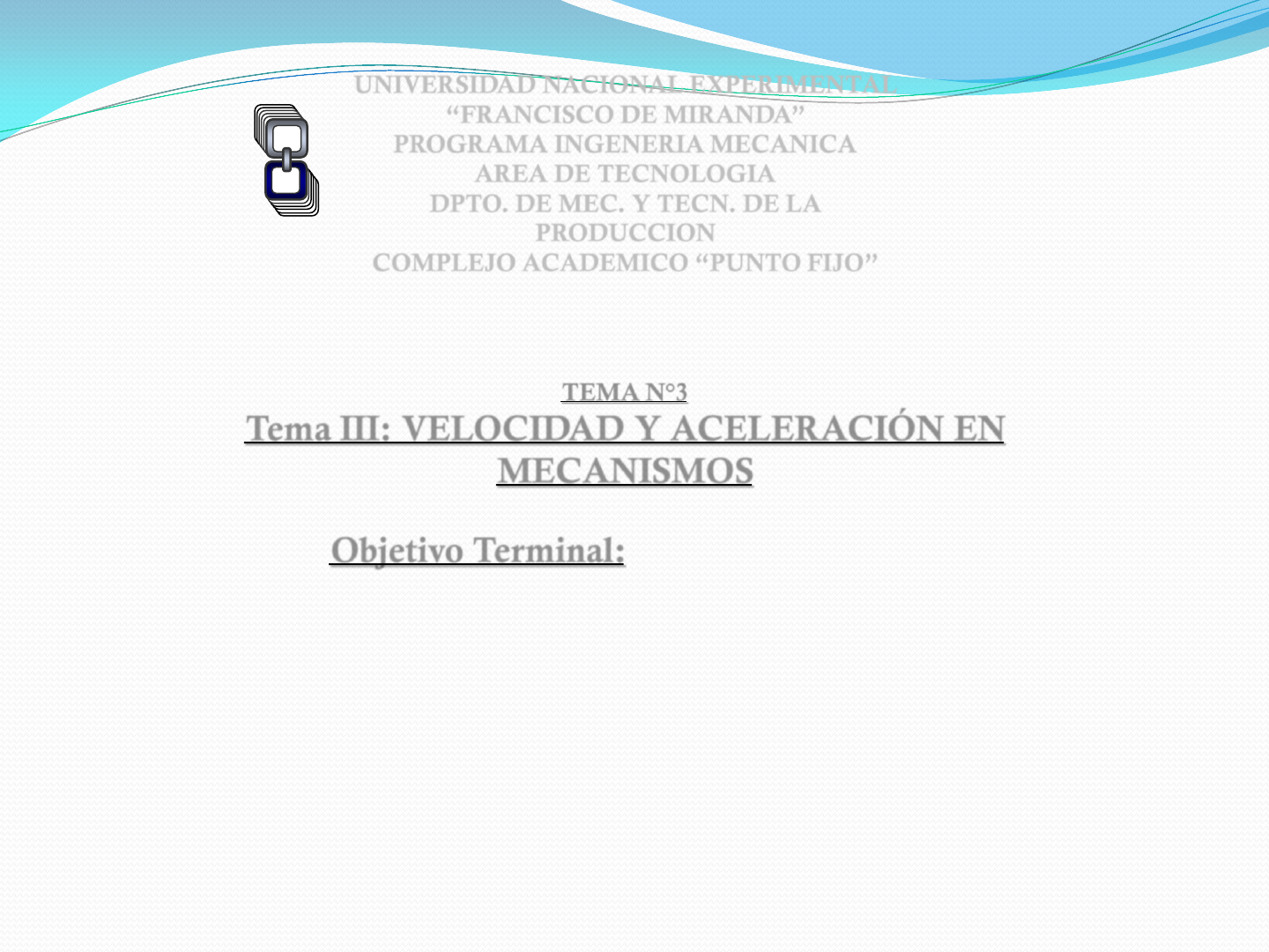 UNIVERSIDAD NACIONAL EXPERIMENTAL “FRANCISCO DE MIRANDA” PROGRAMA INGENERIA MECANICA AREA DE TECNOLOGIA DPTO. DE MEC. Y TECN. DE LA PRODUCCION COMPLEJO ACADEMICO “PUNTO FIJO” TEMA N°3 Tema III: VELOCIDAD Y ACELERACIÓN EN MECANISMOS Objetivo Terminal: Al finalizar la unidad, el alumno estará en la capacidad de conocer los diferentes métodos de cálculo de velocidad y aceleración de elementos de un mecanismo. José David Texto escrito a máquina PROF. DAVID GUANIPA UNIVERSIDAD NACIONAL EXPERIMENTAL “FRANCISCO DE MIRANDA” PROGRAMA INGENERIA MECANICA AREA DE TECNOLOGIA DPTO. DE MEC. Y TECN. DE LA PRODUCCION COMPLEJO ACADEMICO “PUNTO FIJO” TEMA III Velocidad y aceleración en mecanismos • Definición y aplicaciones de Desplazamiento, velocidad y aceleración de los mecanismos • Velocidad Lineal. • Aceleración tangencial, aceleración normal y aceleración de coriolis. • Métodos de análisis de velocidad y aceleración. • Teorema de Kennedy • Problemas DEFINICIÓN DE VELOCIDAD DEFINICIÓN DE VELOCIDAD DEFINICIÓN DE VELOCIDAD Fig. 1 DEFINICIÓN DE VELOCIDAD Fig. 2 DEFINICIÓN DE VELOCIDAD DEFINICIÓN DE VELOCIDAD Fig. 3 DEFINICIÓN DE VELOCIDAD Análisis gráfico de velocidad El análisis gráfico de velocidad determina la velocidad de puntos de un mecanismo en una sola configuración. Se debe hacer énfasis en que los resultados de este análisis corresponden a la posición actual del mecanismo. Conforme el mecanismo se mueve, la configuración cambia al igual que las velocidades. El fundamento del método de análisis de velocidad relativa se deriva del hecho siguiente: “Dos puntos que residen en el mismo eslabón tan solo pueden tener una velocidad relativa que esté en dirección perpendicular a la línea que une los dos puntos”. Myszka 4ta Ed. (2012). El análisis más simple con el método de velocidad relativa implica puntos que residen en eslabones restringidos a rotación pura o a traslación rectilínea La razón es que se conoce la dirección del movimiento de los puntos. Para resolver de manera gráfica cualquier análisis de velocidad, son necesarias sólo dos ecuaciones: (Nortón 2009). 𝑽𝑩 = 𝑽𝑨 + 𝑽𝑩/𝑨 𝑽 = 𝒗 = 𝒓𝒘 DEFINICIÓN DE VELOCIDAD DEFINICIÓN DE VELOCIDAD Fig. 4 Método analítico de Análisis de velocidad (4 Barras) En la figura 5 se ilustra un mecanismo general de cuatro barras, definido únicamente por las dimensiones L1, L2, L3, L4. Con un grado de libertad, se especifica el movimiento de un solo eslabón para impulsar los otros eslabones. Con mucha frecuencia se impulsa la manivela, de modo que, conociendo ∅2, W2, y la posición de todos los eslabones, se determinan las velocidades de los otros eslabones. 𝑊3 = −𝑊2 𝐿2 𝑠𝑖𝑛 ∅4 − ∅2 𝐿3 𝑠𝑖𝑛 𝛾 𝑊4 = −𝑊2 𝐿2 𝑠𝑖𝑛(∅3 − ∅2) 𝐿4 𝑠𝑖𝑛 𝛾 Se tienen que aplicar las ecuaciones para determinar la velocidad angular de los eslabones 3 y 4 en una configuración cualquiera de un mecanismo. DEFINICIÓN DE VELOCIDAD Fig. 5 DEFINICIÓN DE VELOCIDAD Método analítico de Análisis de velocidad (BMC) En la figura 6 se presenta un mecanismo general de biela manivela corredera que está definido únicamente por las dimensiones L1, L2 y L3. Con un grado de libertad, se especifica el movimiento de un solo eslabón para impulsar los otros eslabones. Con mucha frecuencia se impulsa la manivela, de modo que, conociendo ∅2,𝑊2 y la posición de todos los eslabones, se determinan las velocidades de los otros eslabones con las ecuaciones: 𝑤3 = −𝑤2 𝐿2 𝑐𝑜𝑠 ∅2 𝐿3 𝑐𝑜𝑠 ∅3 𝑉4 = −𝑊2𝐿2 𝑠𝑖𝑛 ∅2 + 𝑊3𝐿3 𝑠𝑖𝑛 ∅3 Se tienen que aplicar estas ecuaciones para determinar la velocidad angular eslabón 3 y la velocidad lineal del eslabón 4 en una configuración cualquiera de este mecanismo. Fig. 6 DEFINICIÓN DE ACELERACIÓN Fig. 7 DEFINICIÓN DE ACELERACIÓN DEFINICIÓN DE ACELERACIÓN Fig. 8 DEFINICIÓN DE ACELERACIÓN Análisis gráfico de aceleración El método gráfico de las aceleraciones relativas, guarda una gran similitud con el de las velocidades relativas, pues en los dos se trata de realizar gráficamente una suma vectorial. Es un método que permite determinar aceleraciones a partir de los datos de una barra conocida, teniendo en cuenta del paso de barra en barra. Si se conoce la aceleración angular del eslabón 2, α, así como su dirección. Para calcular la aceleración de un punto B por medio del método de las aceleraciones relativas, se planteará la igualdad vectorial: 𝐴𝐵 = 𝐴𝐴 + 𝐴𝐵/𝐴 DEFINICIÓN DE ACELERACIÓN Análisis gráfico de aceleración La aceleración del punto A puede ser de inmediato conocida a través de sus componentes normal y tangencial con las ecuaciones: 𝐴 𝐴 𝑛 = 𝑊2 ∗ 𝑂2𝐴 𝐴 𝐴 𝑡 =∝∗ 𝑂2𝐴 Estos valores son el punto de partida del método gráfico de aceleraciones relativas y al graficar la aceleración normal de A con sentido de A a 𝑂2 se obtiene la aceleración absoluta de A con sentido igual al indicado por la aceleración angular ∝2= 0. Ver figura 9. DEFINICIÓN DE ACELERACIÓN A A A B A B/ A 02 04 A B 2 3 A B O v AA O A Fig. 9 Por otra parte, como es sabido de la ecuación: 𝐴𝐵/𝐴 = 𝐴𝐵/𝐴 𝑛 + 𝐴𝐵/𝐴 𝑡 De donde descomponiendo las aceleraciones del punto B y la relativa del punto B respecto del A, se obtiene de la ecuación: 𝐴𝐵 𝑛 + 𝐴𝐵 𝑡 = 𝐴𝐴 + 𝐴𝐵/𝐴 𝑛 + 𝐴𝐵/𝐴 𝑡 Ambas aceleraciones normales pueden ser calculadas, ya que: 𝐴𝐵 𝑛 = 𝑊4 2 ∗ 𝑂4𝐵 𝐴𝐵/𝐴 𝑛 = 𝑊3 2 ∗ 𝐴𝐵 Siendo la dirección de la aceleración normal del punto B la de la recta O4B y su sentido de O4 a B, mientras que la dirección de la componente normal de la aceleración relativa es la de la recta AB y su sentido desde B hacia A. (ver figura 10) Por otra parte las direcciones d