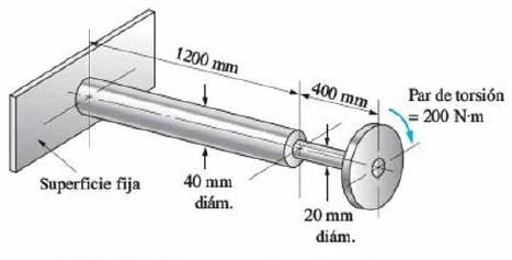 RESISTENCIA DE MATERIALES GUÍA DE EJERCICIOS N°3 DOCENTE: CLAUDIO DÍAZ TEMA: TORSIÓN 1.- Calcule el esfuerzo cortante torsional que se produciría en una flecha circular sólida de 20 mm de diámetro cuando se somete a un par de torsión de 280 N*m. R : 178MPa 2.- Calcule el esfuerzo cortante torsional en una flecha de 1,25 plg de diámetro cuando transmite un par de torsión de 1550 lb*plg R : 4042 lb/plg2 3.- Calcule el esfuerzo cortante torsional y el ángulo de torsión en grados en un tubo de aluminio de 600 mm de largo, 60 mm de diámetro interno y 80 mm de diámetro externo cuando se somete a un par de torsión constante de 4500N*m. Galuminio = 26 GPa R: 65,5 MPa; θ = 0,037 rad 4.- Determine los diámetros interno y externo requeridos para una flecha hueca que transmite un par de torsión de 1200 N*m con un esfuerzo cortante torsional máximo de 45MPa. Haga que la relación del diámetro externo al interno sea aproximadamente de 1,25. R: Di = 49 mm; Do = 61,3 mm 5.- Calcule el ángulo de torsión en una flecha de acero de 15mm de diámetro y 250 mm de largo cuando se le aplica un par de torsión de 240 N*m. Gacero = 80 GPa. R: 0,1509 rad 6.- Se utiliza una varilla de acero de 8.0 pies de longitud y diámetro de 0.625 plg como una llave larga para desatornillar un tapón roscado en el fondo de una piscina. Se requiere un par de torsión de 40 lb-pie para aflojarlo; calcule el ángulo detorsión de la varilla. Gacero = 11,5 x 10 6 psi R: 0,267 rad 7.- Calcule el ángulo de torsión del extremo libre con respecto al extremo fijo de la barra de acero mostrada en la figura. Gacero = 80 GPa R: 0,0756 rad 8.- Una barra solida de acero con sección transversal circular tiene un diámetro d = 1,5 plg., longitud L = 54 plg. y modulo de elasticidad en cortante G = 11,5 × 10 6 psi. La barra está sometida a pares de torsión T que actúan en sus extremos. Si los pares de torsión tienen una magnitud T = 250 lb*ft, a) ¿Cuál es el esfuerzo cortante máximo en la barra? b) ¿Cual es el ángulo de torsión entre los extremos? R: 4530 psi; 0,02834 rad 9.- El tubo mostrado en la figura tiene un diámetro interior de 80 mm y un diámetro exterior de 100 mm. Si su extremo se aprieta contra el soporte en A usando una llave de torsión en B, determine el esfuerzo cortante desarrollado en el material en las paredes interna y externa a lo largo de la porción central del tubo cuando se aplican las fuerzas de 80 N a la llave. R: 0,345 MPa; 0,276 MPa 10.- Los engranajes unidos a la flecha de acero (G= 80 GPa) empotrada están sometidos a los pares de torsión mostrados en la figura. Si la flecha tiene un diámetro constante de 14 mm, determine a) el ángulo de torsión de A con respecto a E expresado en radianes b) el desplazamiento del diente P en el engranaje A. La flecha gira libremente sobre le cojinete en B R: - 0,212 rad; 21,2 mm 11.- Un eje solido de acero ABCDE con diámetro d = 30 mm gira libremente sobre cojinetes en los puntos A y E. El eje es impulsado por un engrane en C que aplica un par de torsión T2 = 450 N·m en el sentido que se muestra en la figura. Los engranes en B y D son impulsados por el eje y tienen pares de torsión resistentes T1 = 275 N·m y T3 = 175 N·m, respectivamente, que actúan en sentido opuesto al par de torsión T2. Los segmentos BC y CD tienen longitudes LBC = 500 mm y LCD = 400 mm, respectivamente, y el modulo de cortante es G = 80 Gpa. Determine el ángulo de torsión entre los engranes B y D. R: - 0,0106 rad