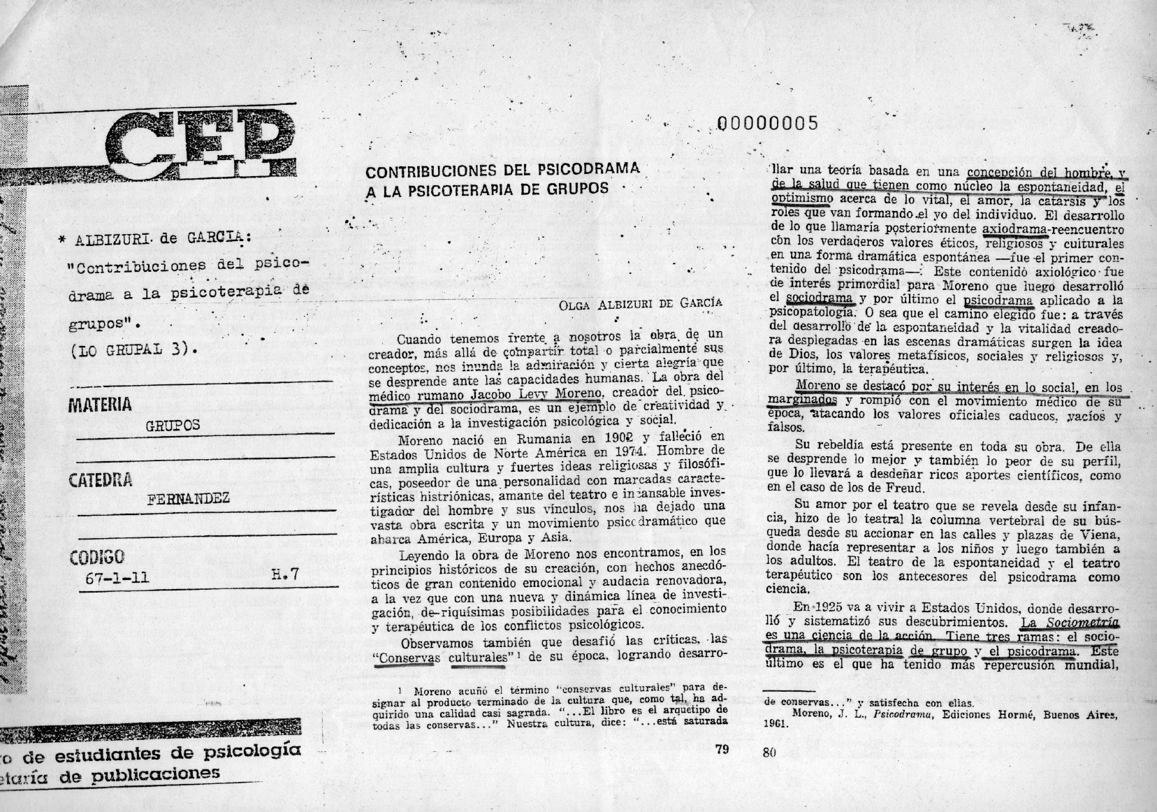 00000005 CONTRIBUCIONES DEL PSICODRAMA llar una teoría basada en una concepción del y A LA PSICOTERARIA DE GRUPOS de la salud que tienen como núcleo la espontaneidad, el optimismo acerca de lo vital, el amor, la catarsis y los roles que van formando yo del individuo. El desarrollo * ALBIZURI. de GARCIA: de lo que llamaría posteriormente axiodrama-reencuentro con los verdaderos valores éticos, religiosos y "Contribuciones del psico- en una forma dramática espontánea -fue el primer con- tenido del Este contenido axiológico fue drama a la psicoterapia de de interés para Moreno que luego desarrolló OLGA ALBIZURI DE GARCÍA el sociodrama y por último el psicodrama aplicado a la sea que el camino elegido fue: a través Cuando tenemos frente a nosotros la de un del desarrollo de la espontaneidad y la vitalidad creado- (LO GRUPAL 3) creador, más allá de compartir total parcialmente sus ra desplegadas en las escenas dramáticas surgen la idea conceptos, nos inunda la admiración y cierta alegría que de Dios, los valores metafísicos, sociales y religiosos y, se desprende ante las capacidades humanas. La obra del por último, la terapéutica. médico rumano Jacobo Levy Moreno, creador del psico- Moreno se destacó por su interés en lo social, en los MATERIA drama y del sociodrama, es un ejemplo de creatividad y marginados y rompió con el movimiento médico de su GRUPOS dedicación a la investigación psicológica y social. atacando los valores oficiales caducos, vacíos y falsos. Moreno nació en Rumania en 1902 y falleció en Estados Unidos de Norte América en 1974. Hombre de Su rebeldía está presente en toda su obra. De ella una amplia cultura y fuertes ideas religiosas y filosófi- se desprende lo mejor y también lo peor de su perfil, CATEDRA cas, poseedor de una personalidad con marcadas caracte- que lo llevará a desdeñar ricos aportes como FERNANDEZ rísticas amante del teatro e in inves- en el caso de los de Freud. tigador del hombre y sus vínculos, nos ha dejado una Su amor por el teatro que se revela desde su infan- vasta obra escrita y un movimiento psico dramático que cia, hizo de lo teatral la columna vertebral de su bús- abarca América, Europa y queda desde su accionar en las calles y plazas de Viena, CODIGO Leyendo la obra de Moreno nos encontramos, en los donde hacía representar a los niños y luego también a 67-1-11 H.7 principios históricos de su creación, con hechos anecdó- los adultos. El teatro de la espontaneidad y el teatro ticos de gran contenido emocional y audacia renovadora, terapéutico son los antecesores del psicodrama como a la vez que con una nueva y dinámica línea de investi- ciencia. gación, posibilidades para el conocimiento En-1925 va a vivir a Estados donde desarro- y terapéutica de los conflictos psicológicos. 116 y sistematizó sus La Sociometria Observamos también que desafió las críticas, las es una ciencia de la acción Tiene tres ramas: el socio- "Conservas culturales". 1 de su época, logrando desarro- la psicoterapia de grupo y el psicodrama. Este último es el que ha tenido mas repercusión mundial, 1 Moreno el término "conservas culturales" para de- signar al producto terminado de la cultura que, como tal. ha ad- de conservas y satisfecha con ellas. quirido una calidad casi sagrada. El libro es el arquetipo de todas las conservas.. " Nuestra cultura, dice: " está saturada Moreno, J. L., Psicodrama, Ediciones Hormé, Buenos Aires, 1961. de estudiantes de psicología 79 80 de publicacionesabarcando con su nombre, de manera errónea, al que su La catarsis se puede dar, si están dadas las condi- creador eligiera para el cuerpo teórico. ciones antes mencionadas, en el espectador, que al iden- significado para él y para los demás, así como tambi Mucho se ha escrito sobre Moreno. Su biografía tificarse con lo representado y sus protagonistas, tiene ayudan al desarrollo de la Depende precede la mayoría de los libros de psicodrama, por lo la posibilidad de expresarse a través de ellos, resonando, cada caso y medio en que vive el niño, en un determina momento histórico-social. cual remito al lector a dichos textos para evitar aquí la haciendo eco desde sus vivencias e En los pro- repetición. tagonistas, que mientras se desarrolla el drama, crean El juego en el niño es la mayor expresión de la Me referiré a los puntos salientes. de la y el mismo, lo cocrean con los demás, expresándose a través pontaneidad creadora. El psicodrama posibilita la técnica morenianas para luego desarrollar la orientación del tratamiento de la temática y de los juegos vinculares. cuperación de dicha espontaneidad, a través del a la que pertenezco: el psicodrama aplica- En la creación misma, que mediatiza el víncu- dramático, del "como donde se logra esc do a la clínica y docencia grupales. lo del hombre con el mundo. par al determinismo asfixiante de ciertas condiciones El teatro de la espontaneidad que Moreno va trans- la donde imaginario y lo real coexisten en formando en una herramienta terapéutica, el psicodrama, escena; donde se recupere el contacto consigo mismo La del psicodrama contiene ya en sí los puntos básicos de su con los demás al reencontrarse con la Los aportes más conocidos y medulares de la teoría a) El concepto de espontaneidad-creatividad donde surgirán roles nuevos y respuestas nuevas, libr b) La teoría de los roles. de estereotipos. Se Nevará cabo el destratamiento pr de Moreno devienen de la nueva mirada que este autor pio libertad contra de lo rigido. fue capaz de dar a ia improvisación dramática, retoman- c) La psicoterapia grupal. El acto espontáneo íntimamente ligado do a partir de lo teatral espontáneo y del antiguo teatro a) La teoria de la ligada a la crea- instante, de surge la noción del "aquí y ahora" "I el concepto de catarsis. El término catarsis, que tividad dialécticamente, comprende una fenomenología, filosofia del momento" opone a la duración, los beneficio purif
