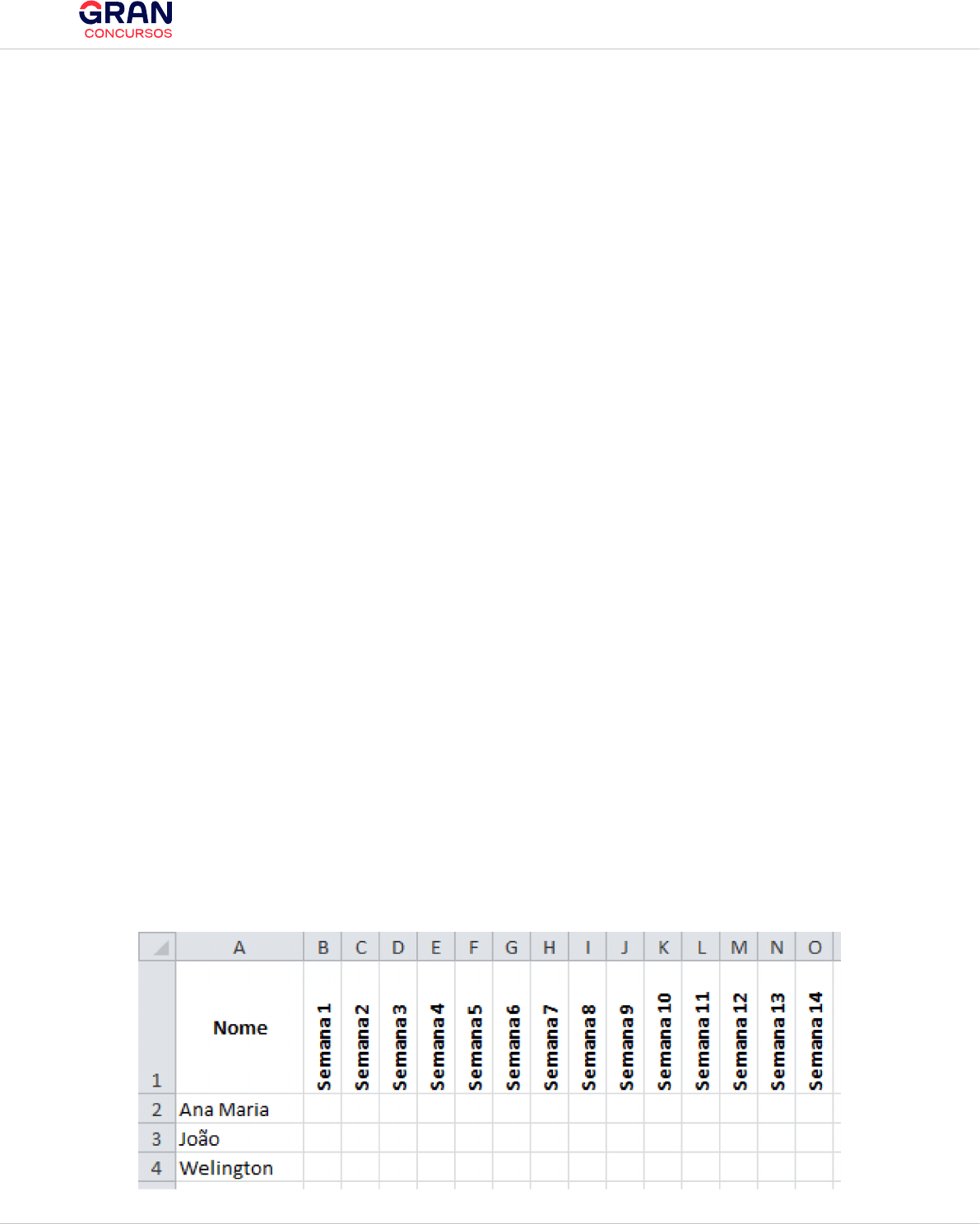 723 de 733gran.com.br Caderno de Questões – FGV Mais de 2000 questões gabaritadas! III. A lixeira tem uma capacidade limite de armazenagem que não pode ser alterada. Está correto o que se afirma em a) I, somente. b) II, somente. c) I e II, somente. d) II e III, somente. e) I, II e III. 1542. 1542. (FGV/2022/TRIBUNAL REGIONAL DO TRABALHO DA 16ª REGIÃO/TRT16-BR/TÉCNICO JUDICIÁRIO – ÁREA: APOIO ESPECIALIZADO – ESPECIALIDADE: TECNOLOGIA DA INFORMAÇÃO) Avalie se as afirmativas a seguir, a respeito de arquivos PDF gerados a partir de documentos ODT no LibreOffice 7.4 Writer, estão corretas. I. A geração não é possível, pois a operação caracteriza uma combinação não permitida no Writer. II. É sempre possível editar o conteúdo do arquivo PDF por meio do Writer. III. O arquivo PDF fica bem maior quando gerado numa versão editável. IV. Podem ser gravados em versões que permitem ou não a edição por meio do Writer. Assinale o número de afirmativas corretas. a) Zero. b) Uma. c) Duas. d) Três. e) Quatro. 1543. 1543. (FGV/2022/TRIBUNAL REGIONAL DO TRABALHO DA 16ª REGIÃO/TRT16-BR/TÉCNICO JUDICIÁRIO – ÁREA: APOIO ESPECIALIZADO – ESPECIALIDADE: TECNOLOGIA DA INFORMAÇÃO) Caio preparou uma planilha MS Excel para acompanhar o desempenho dos participantes de um curso de treinamento durante quatorze semanas, como mostra a imagem a seguir.